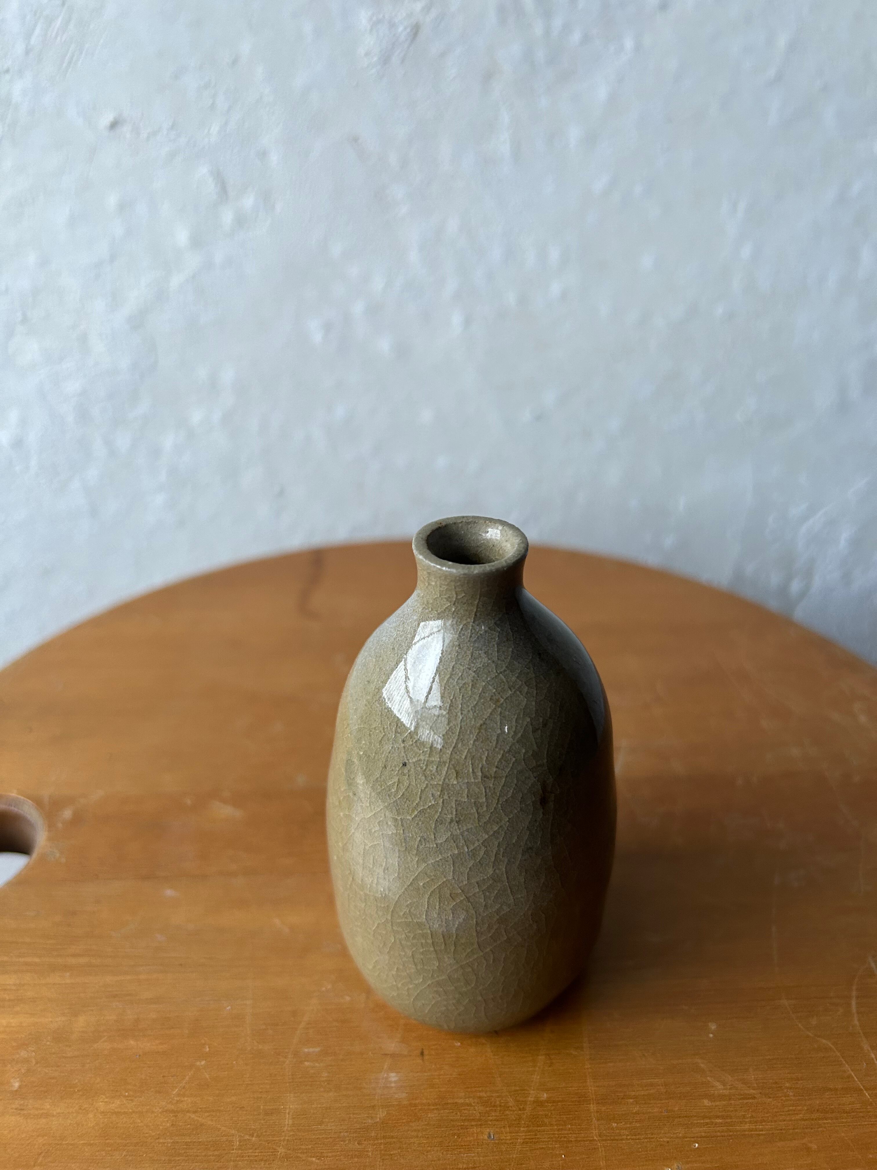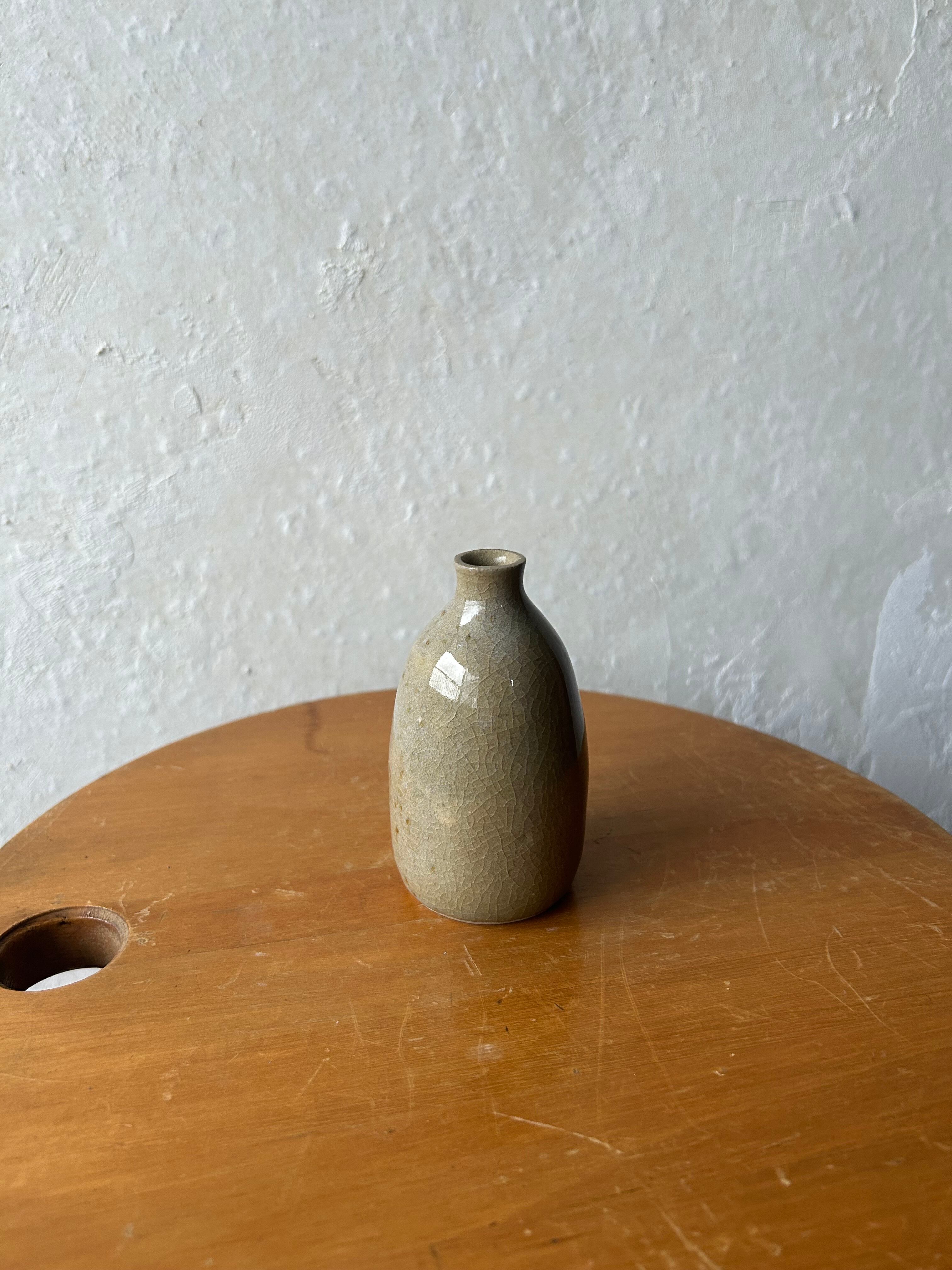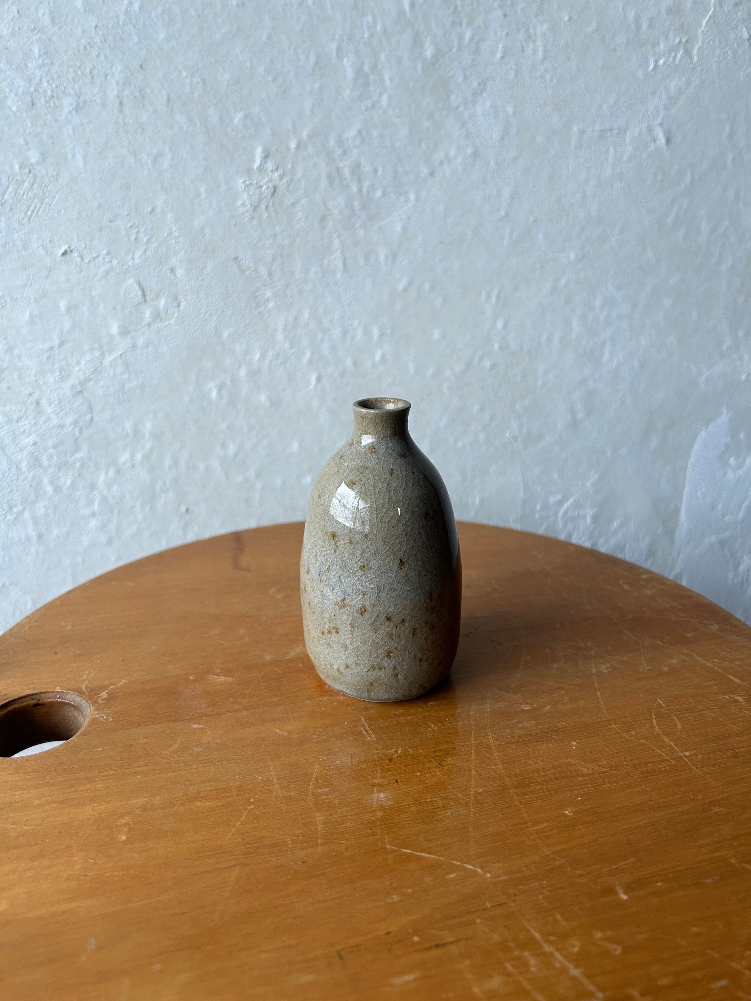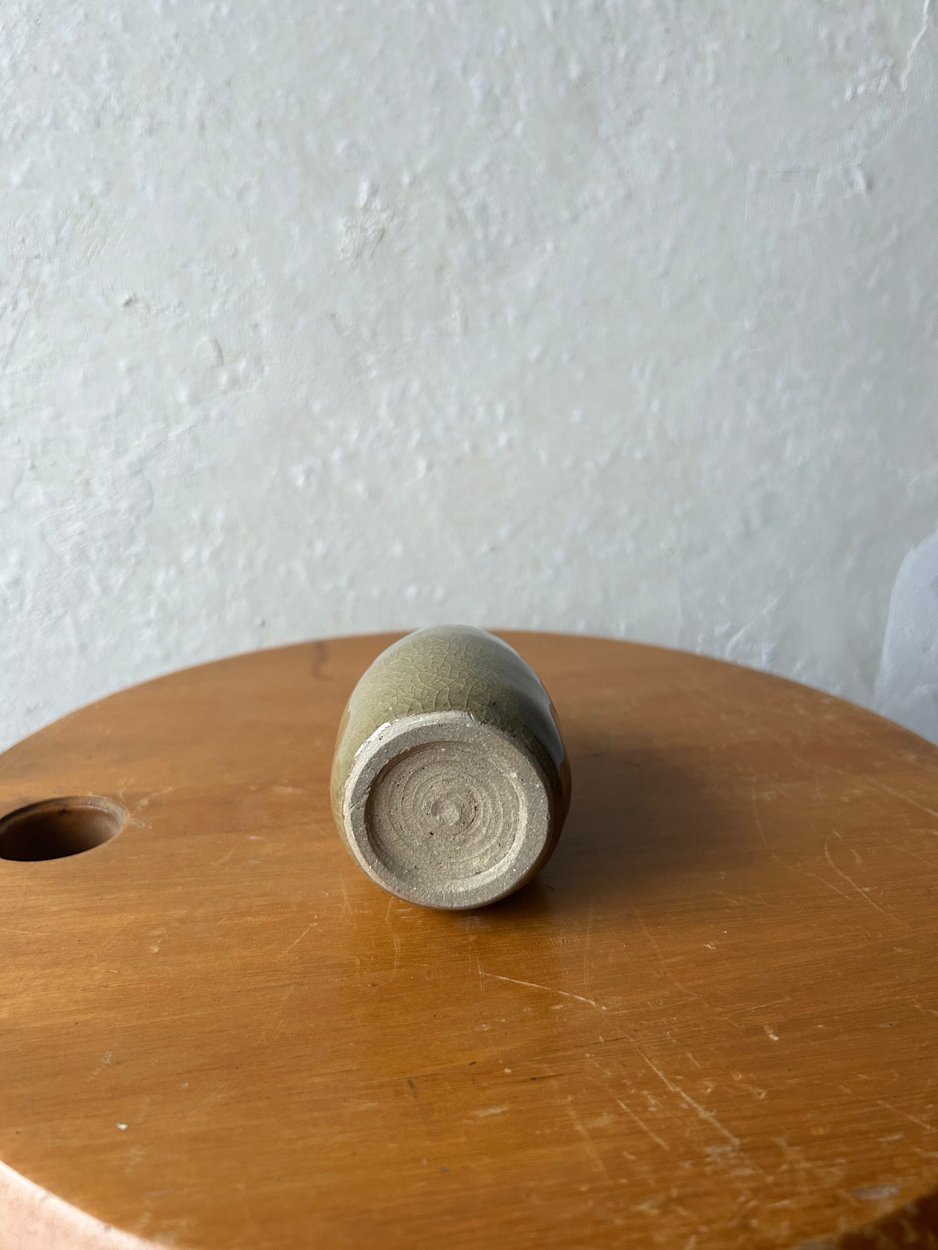 陶器製の一輪挿しです。灰色から少し緑みがかった色味。サイズはちょこんと小さめ。