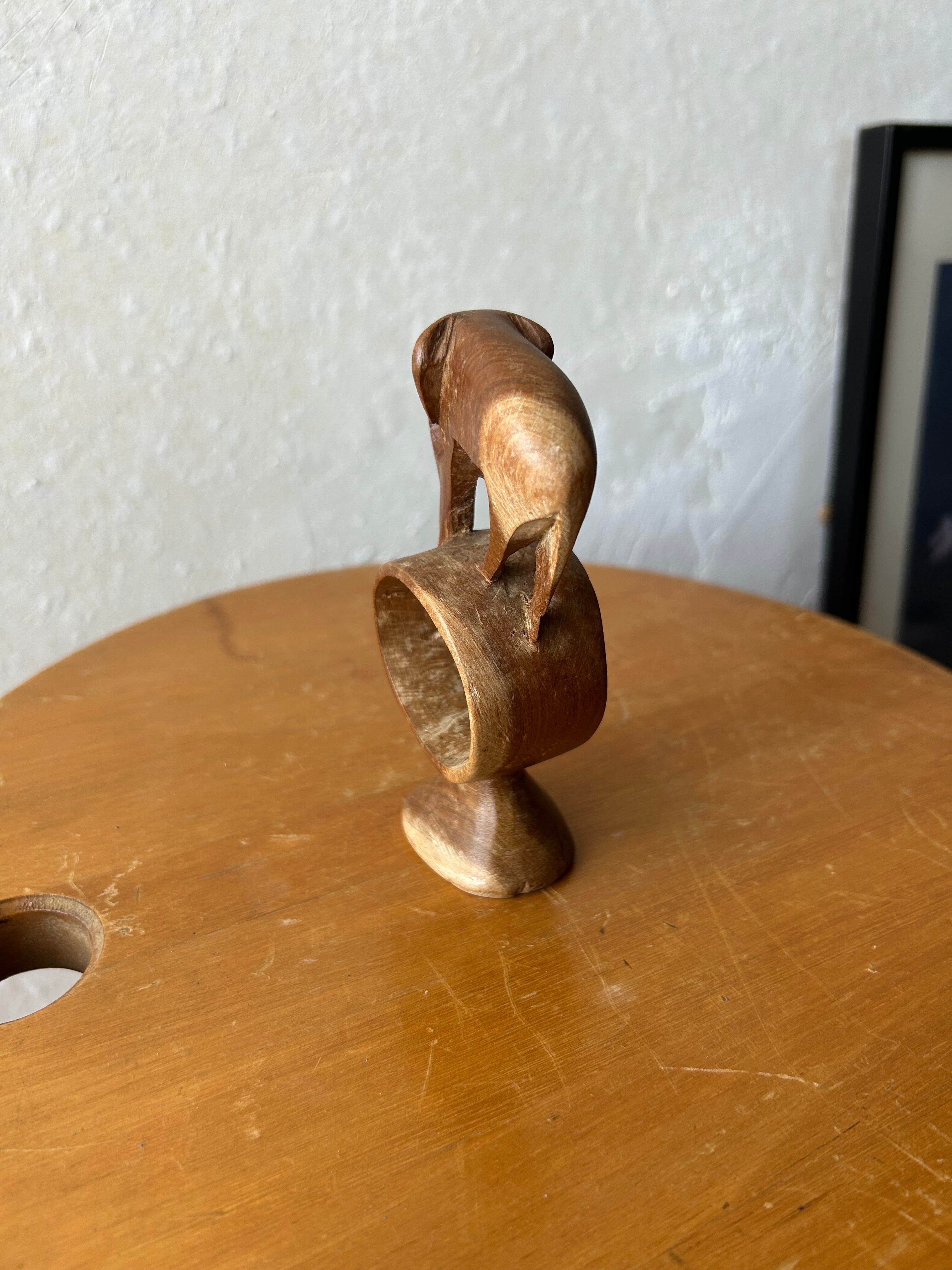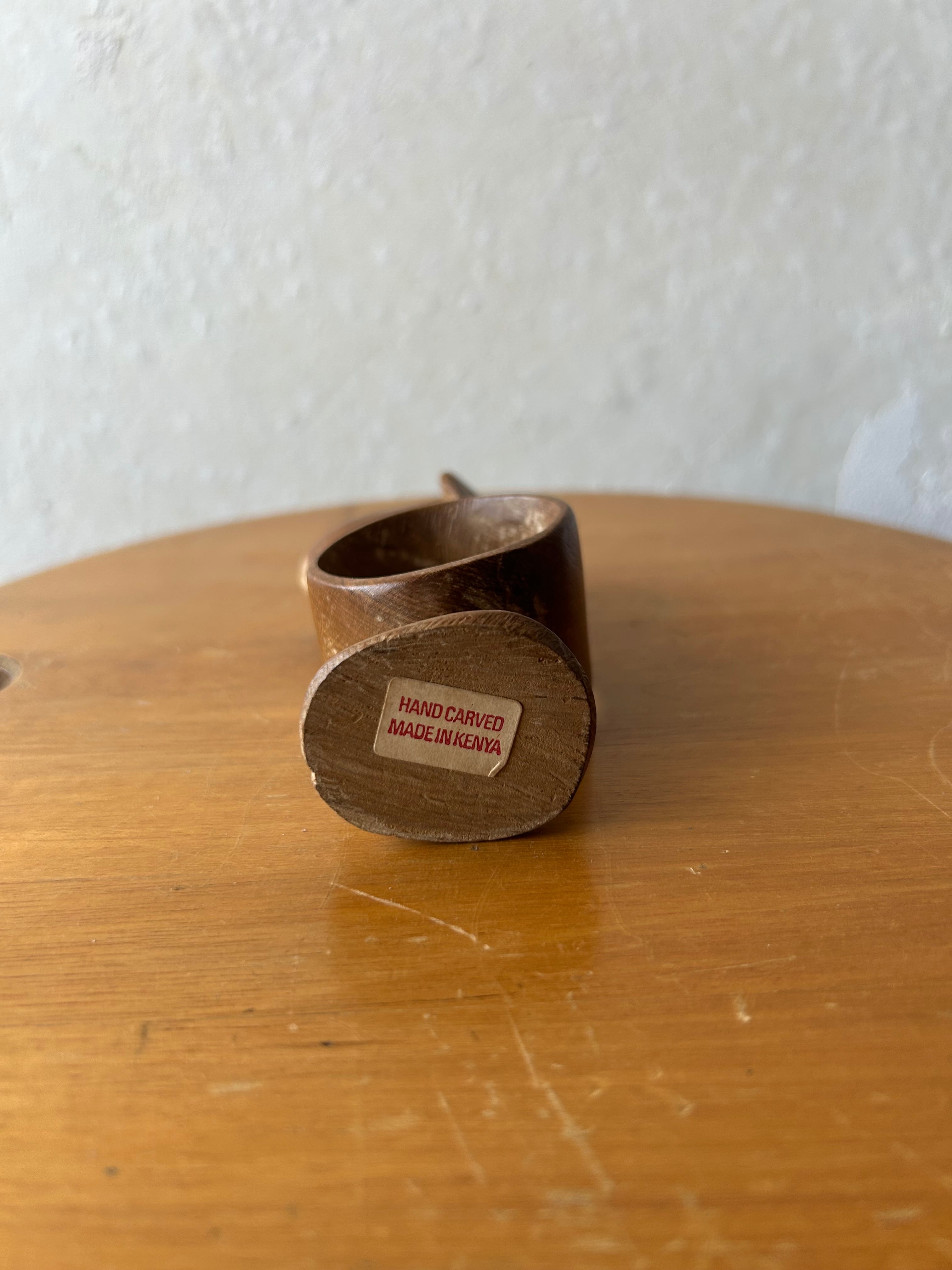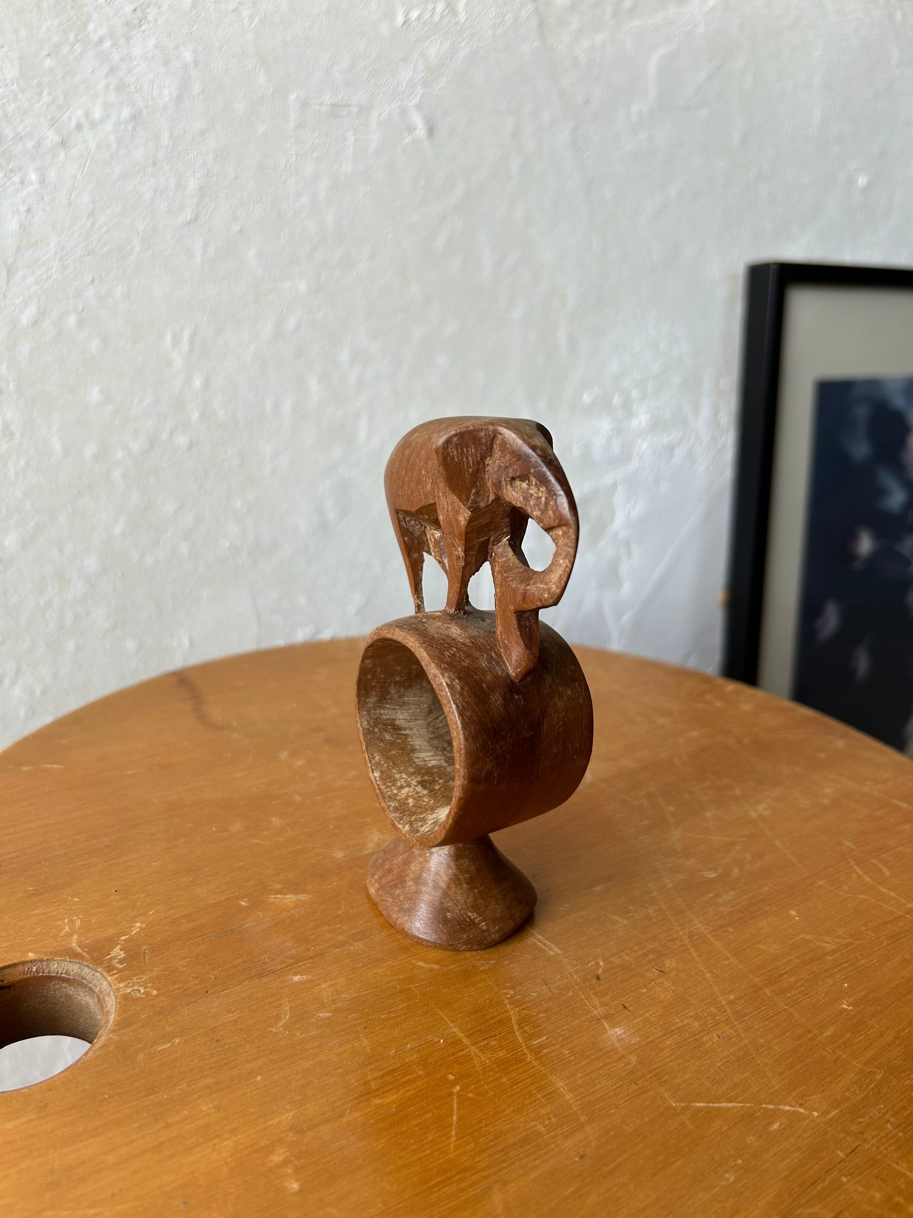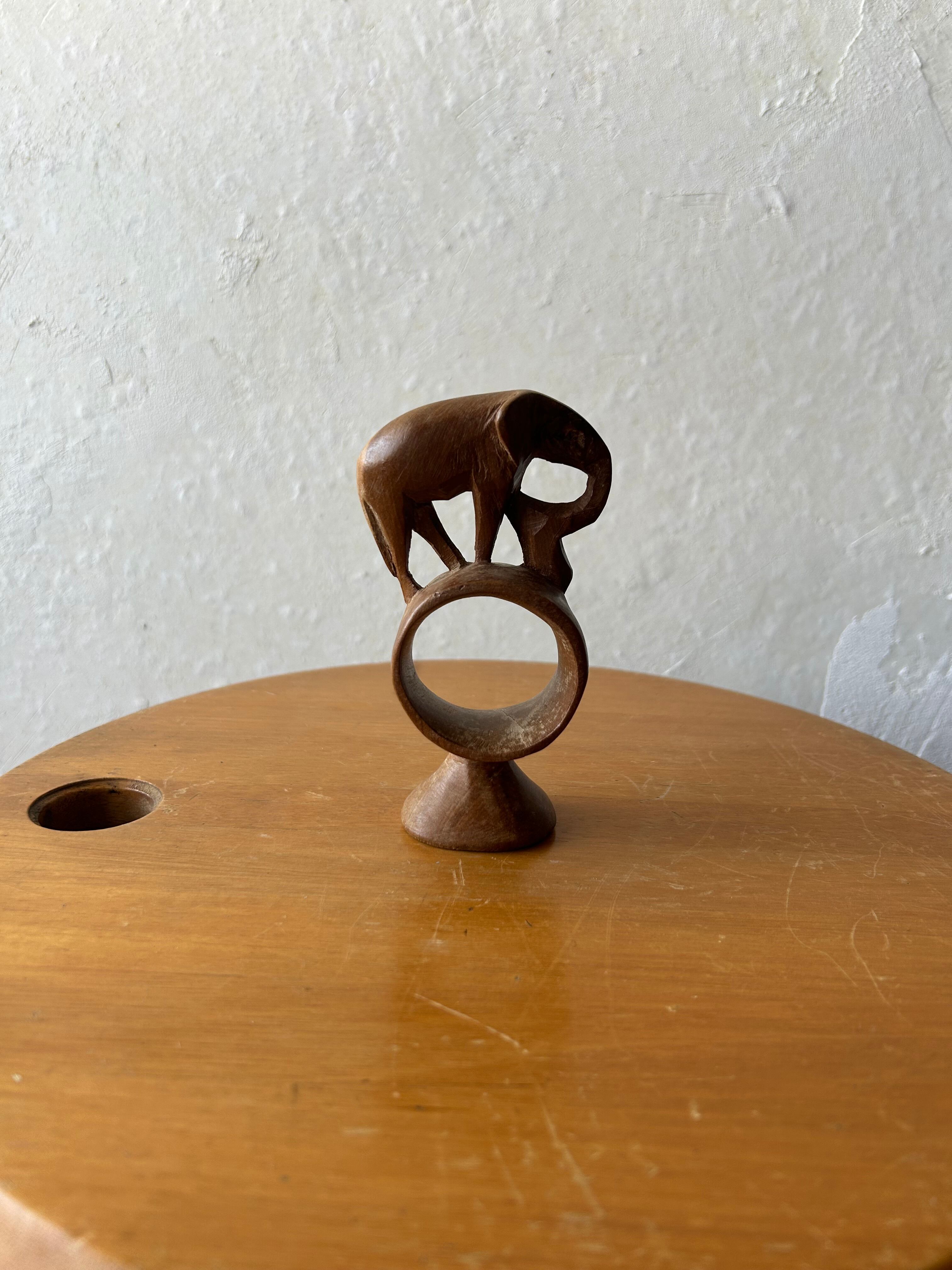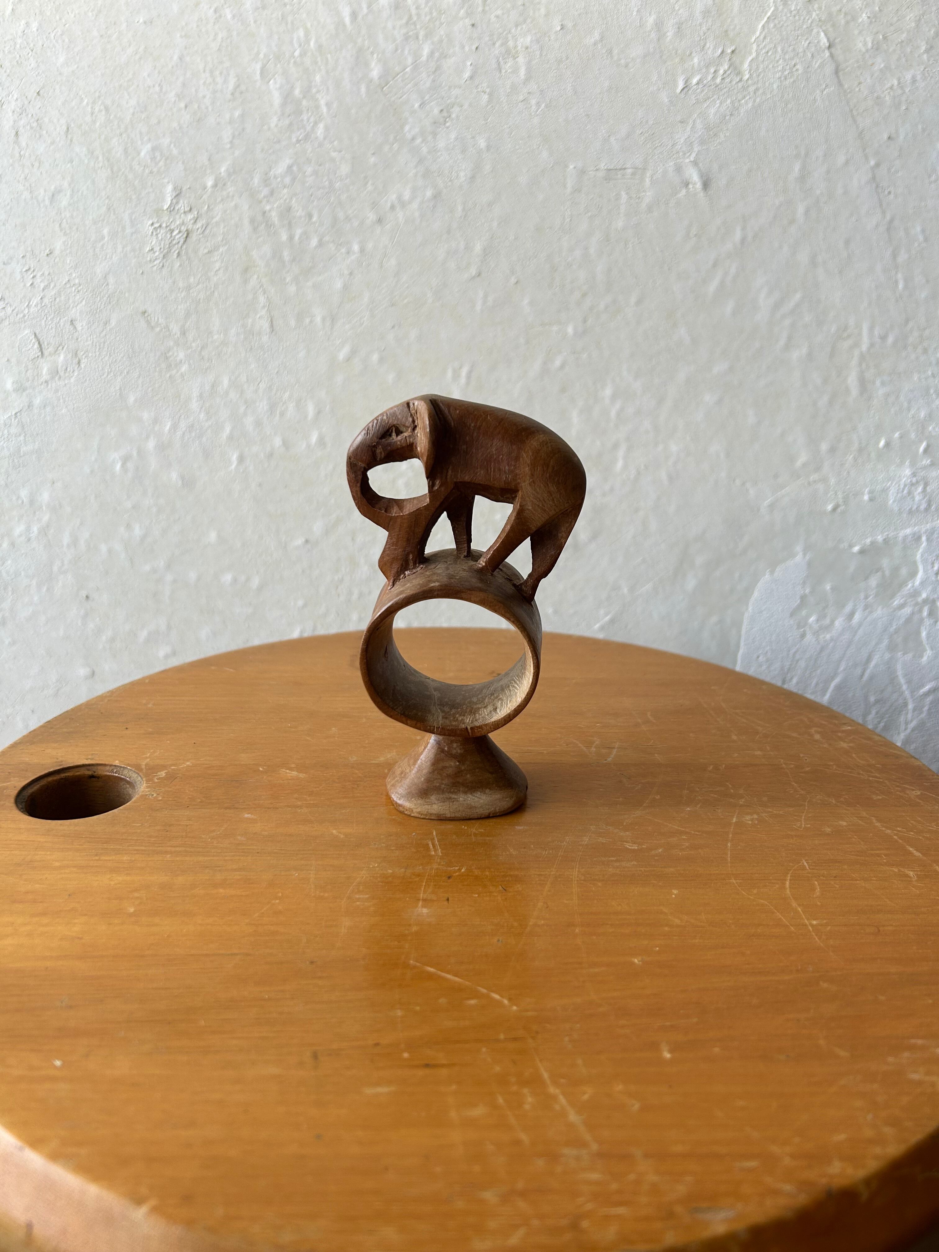 手彫りの木彫りでできた象。輪っかの上に象が乗っているデザインです。ケニア製。日本ではあまり見ないデザインですので、異国の文化を感じられるオブジェですね。