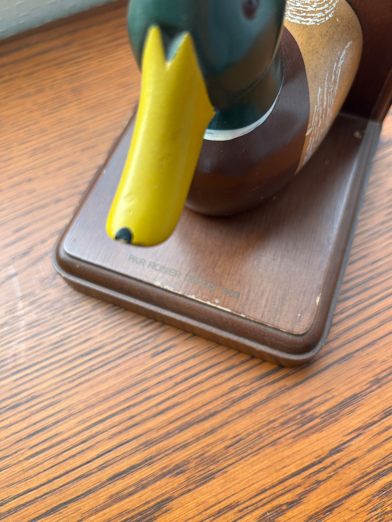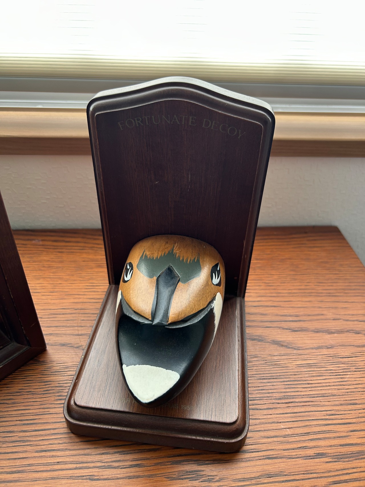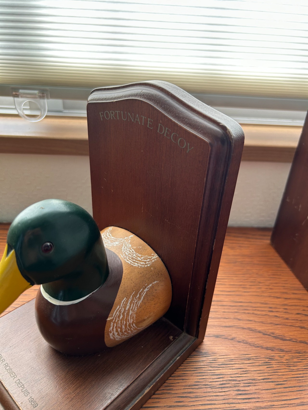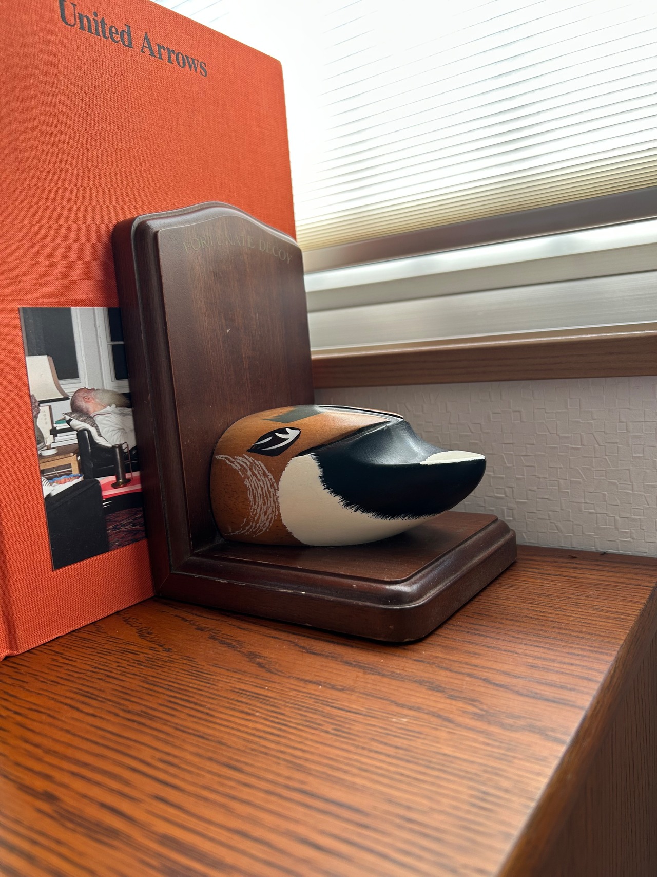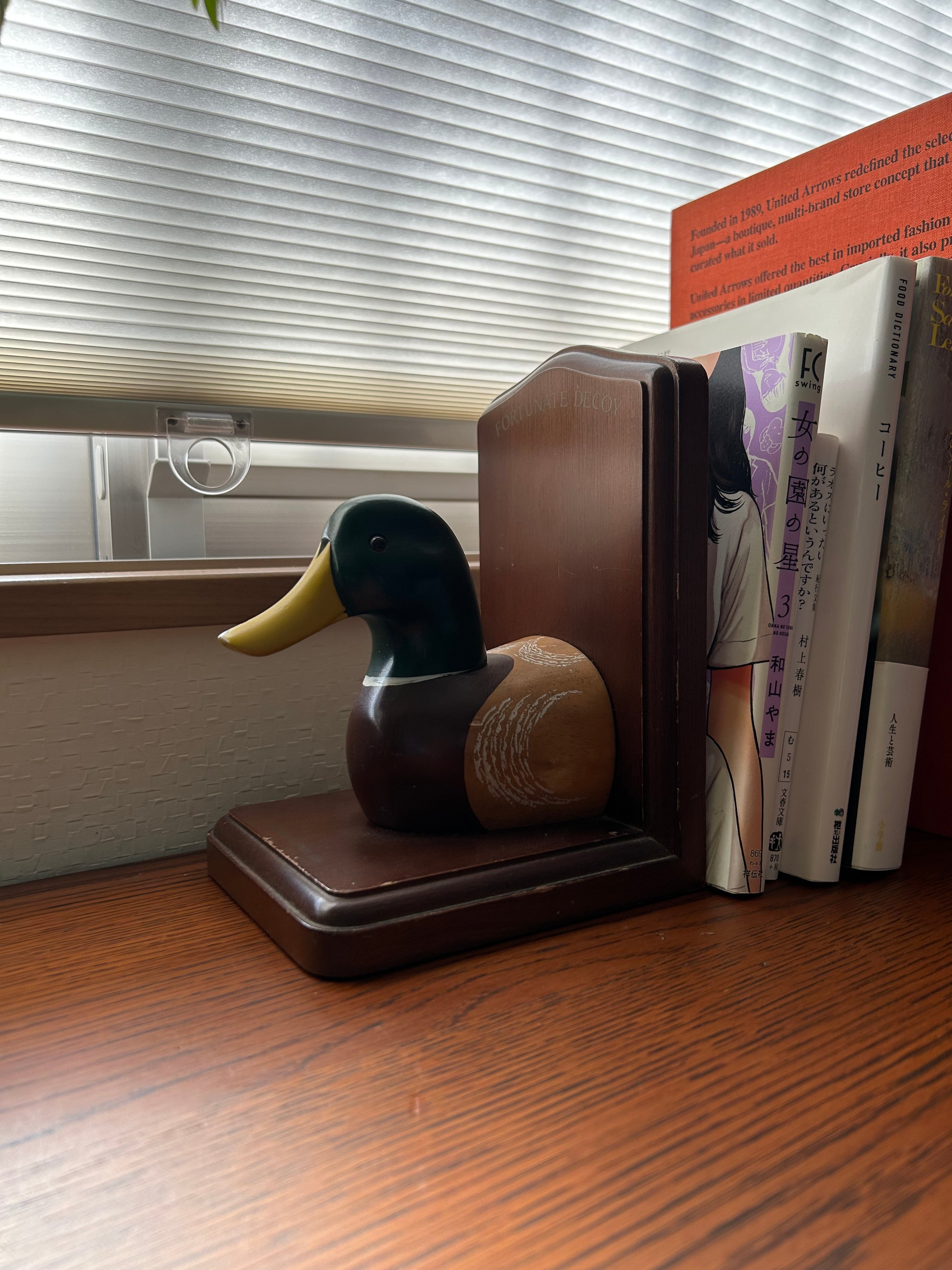 木製の鴨のブックエンドです。おそらく木製カルガモのステーショナリーアイテムのシリーズ「fortunate decoy」。