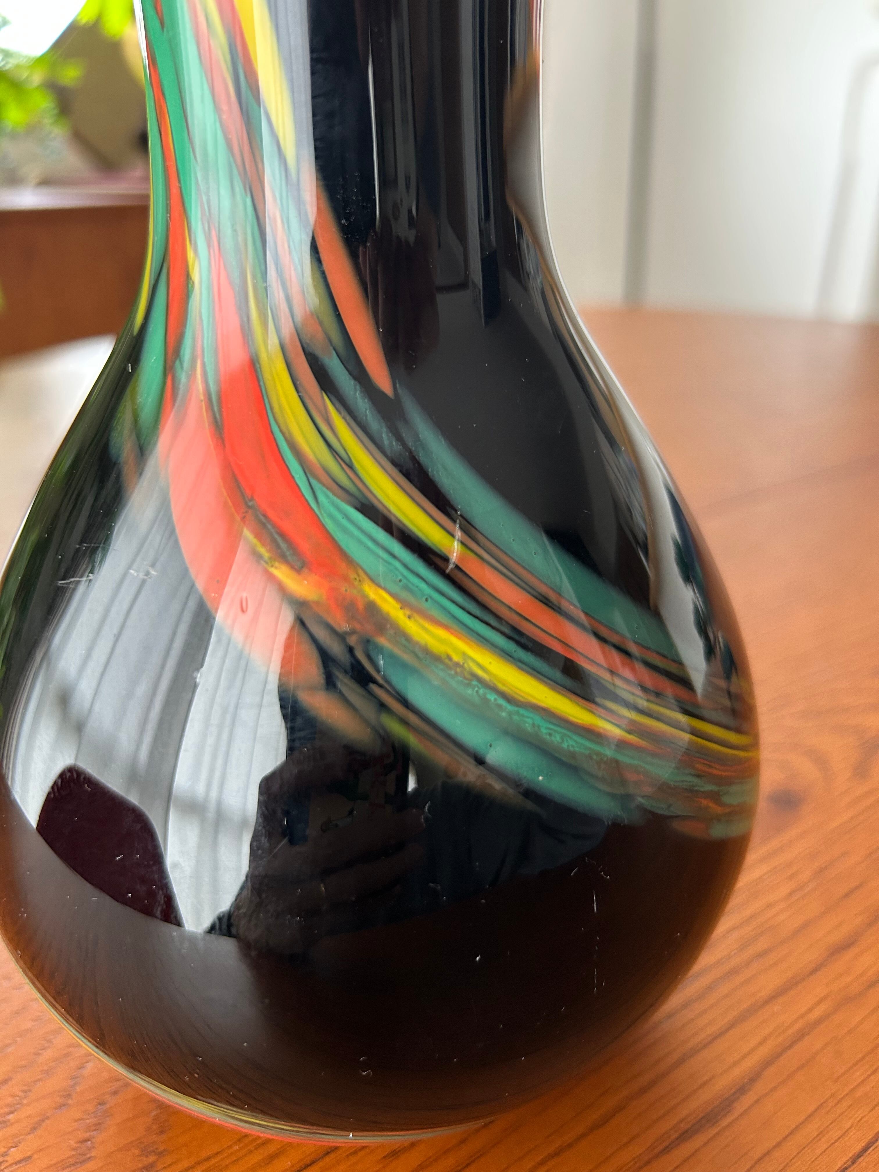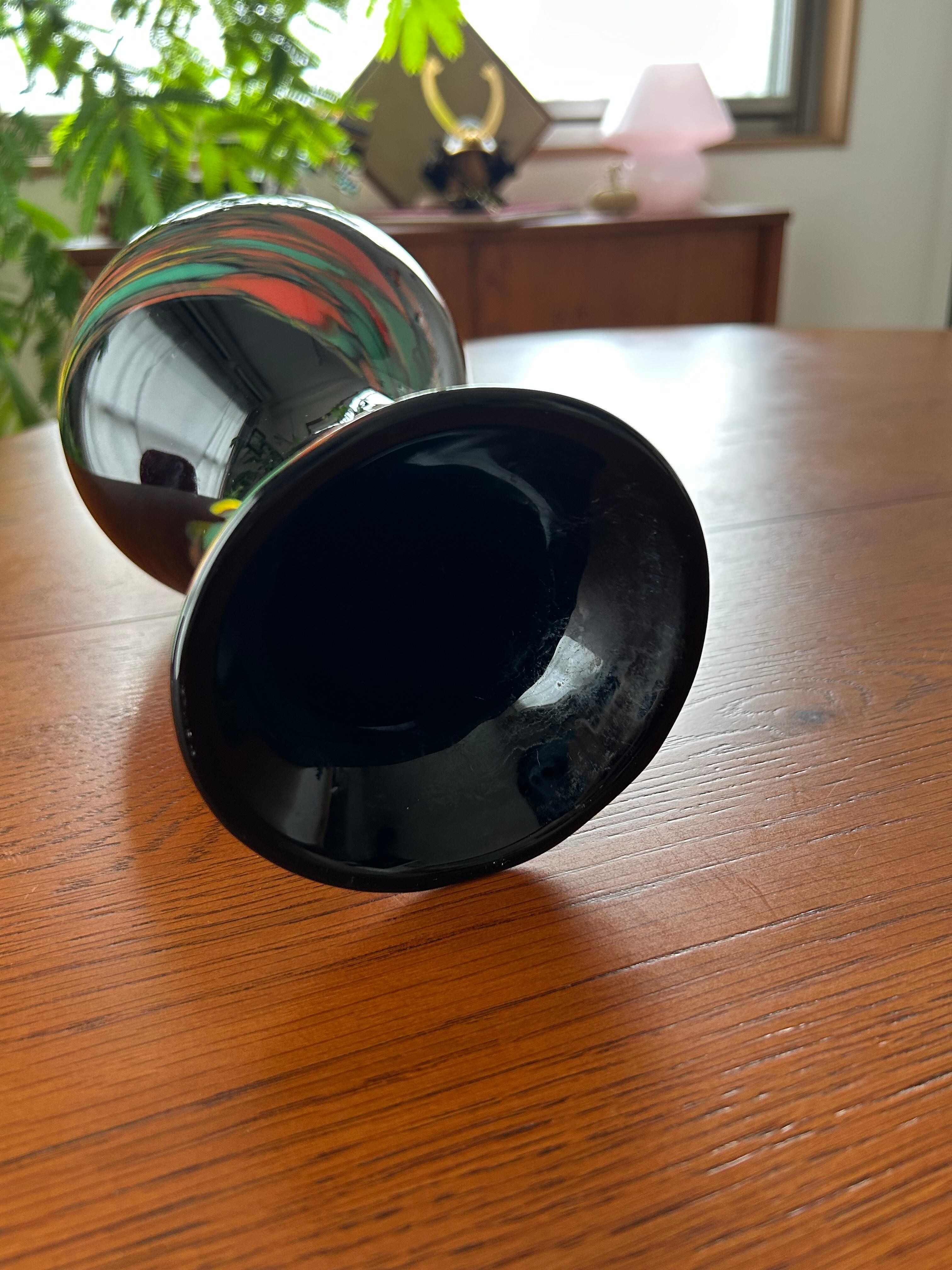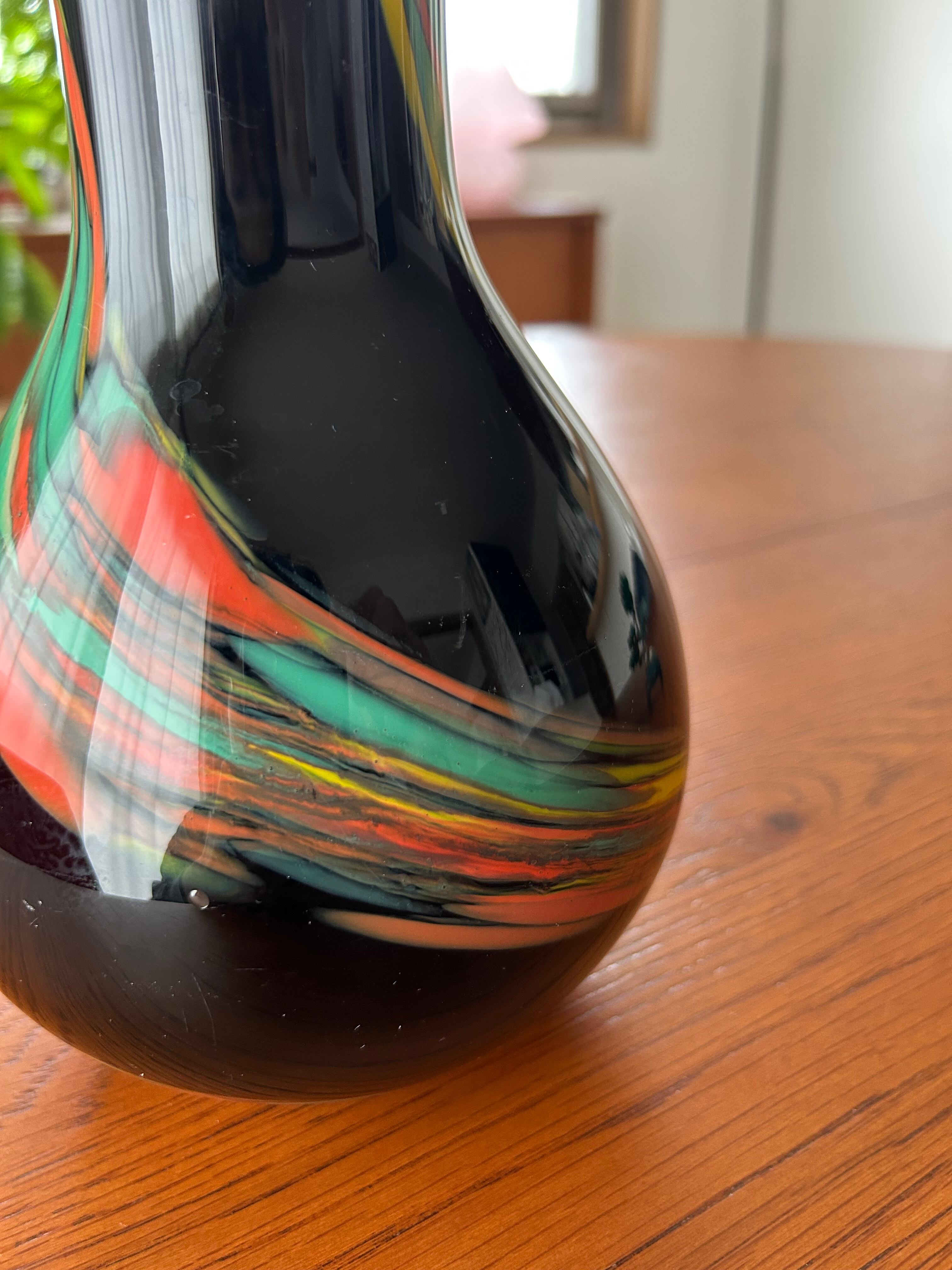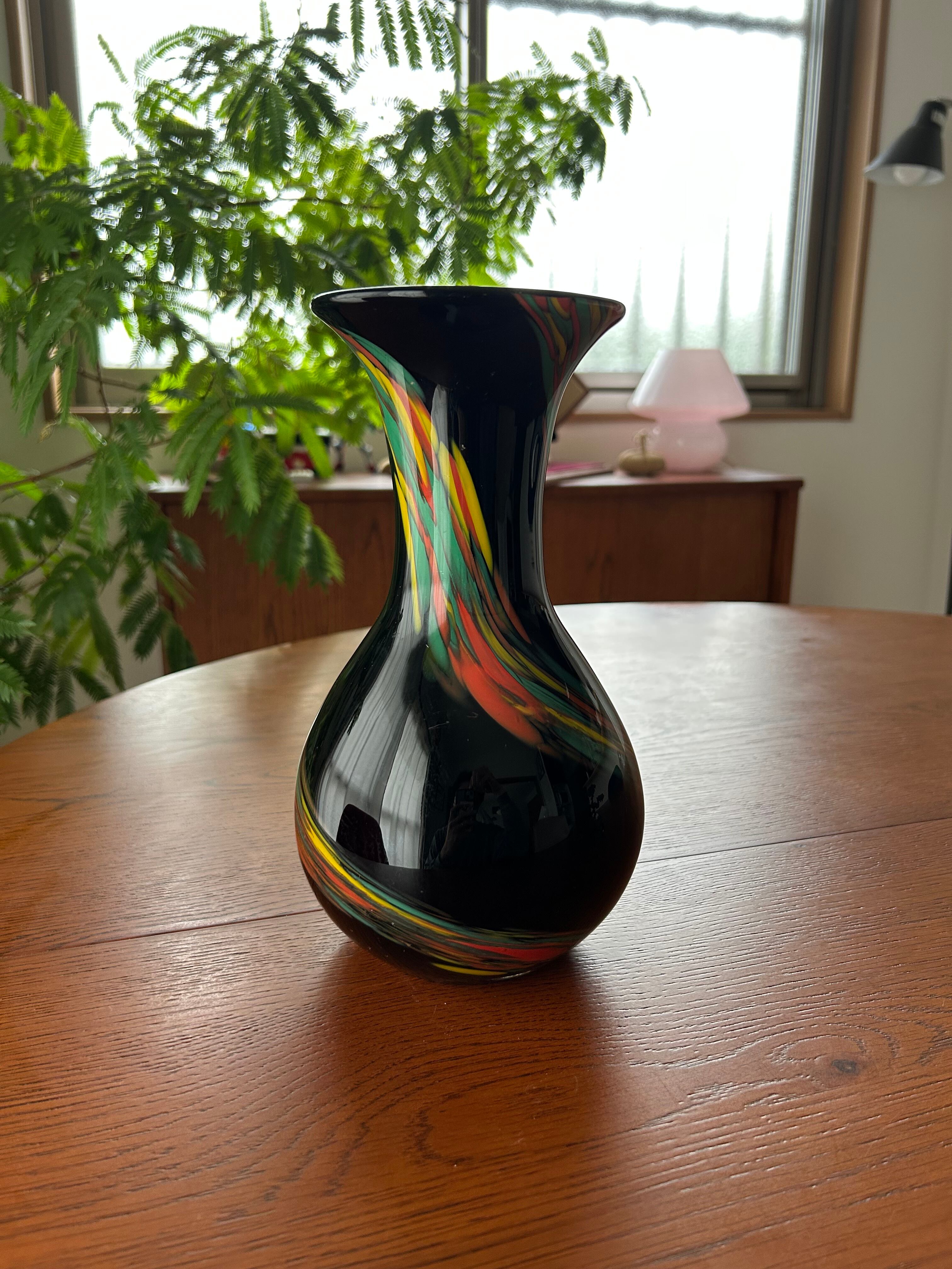 ガラス製の花器です。黒の下地に赤、緑、黄色の模様が入っています。