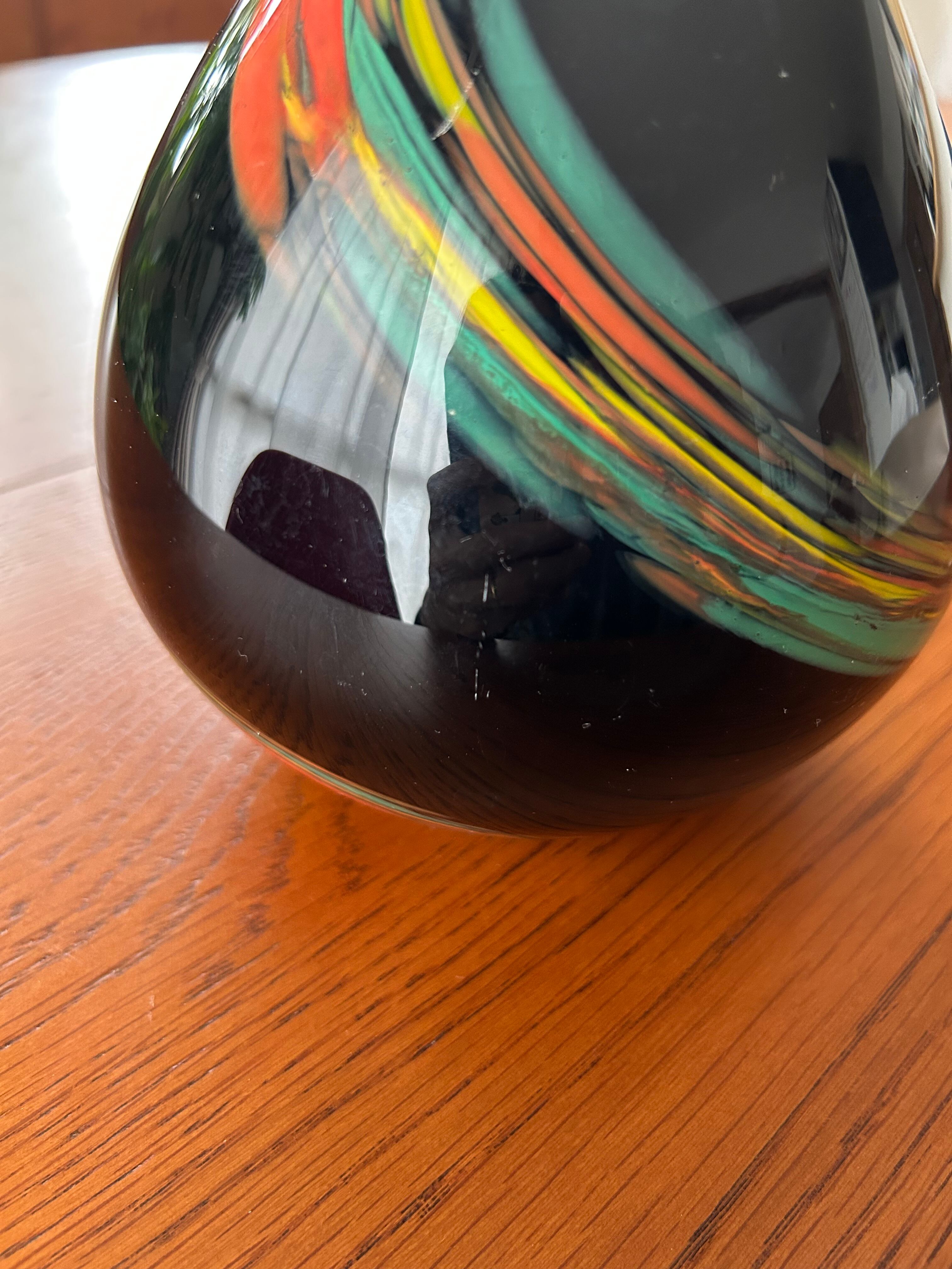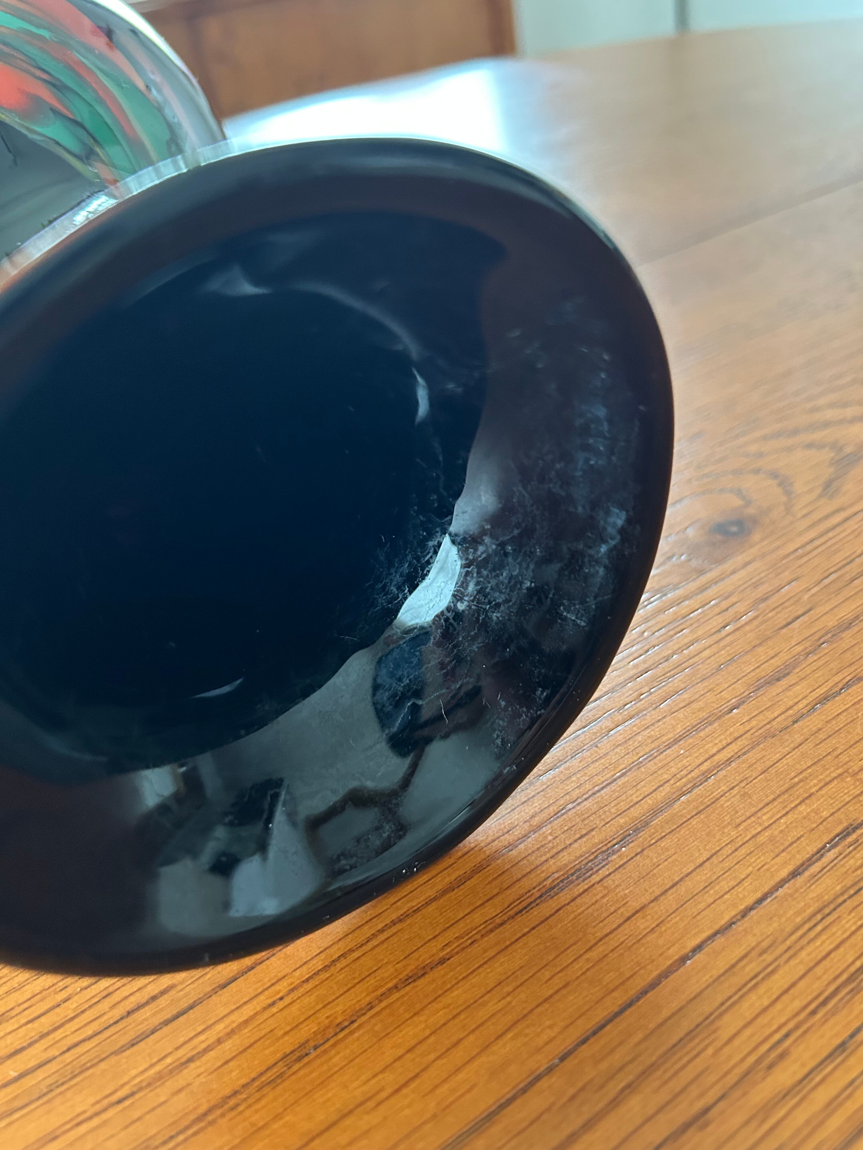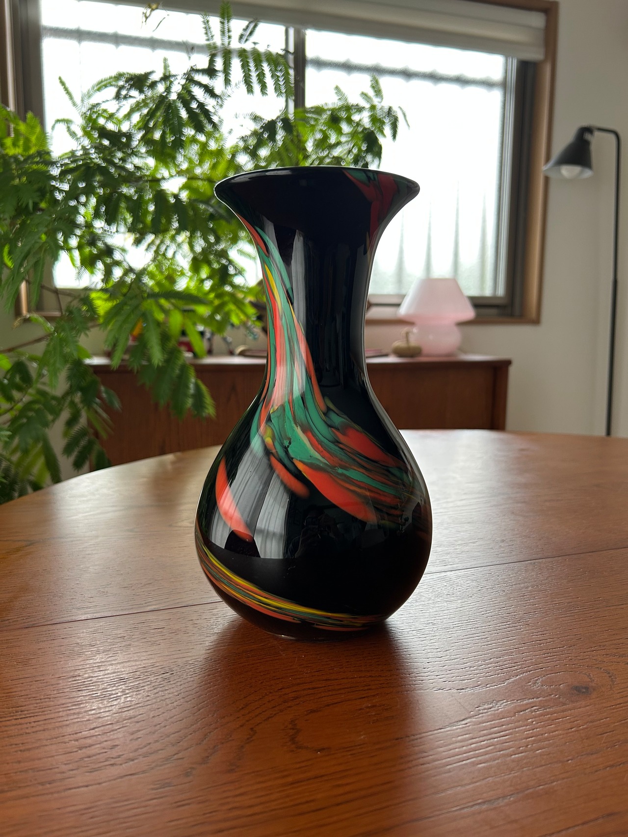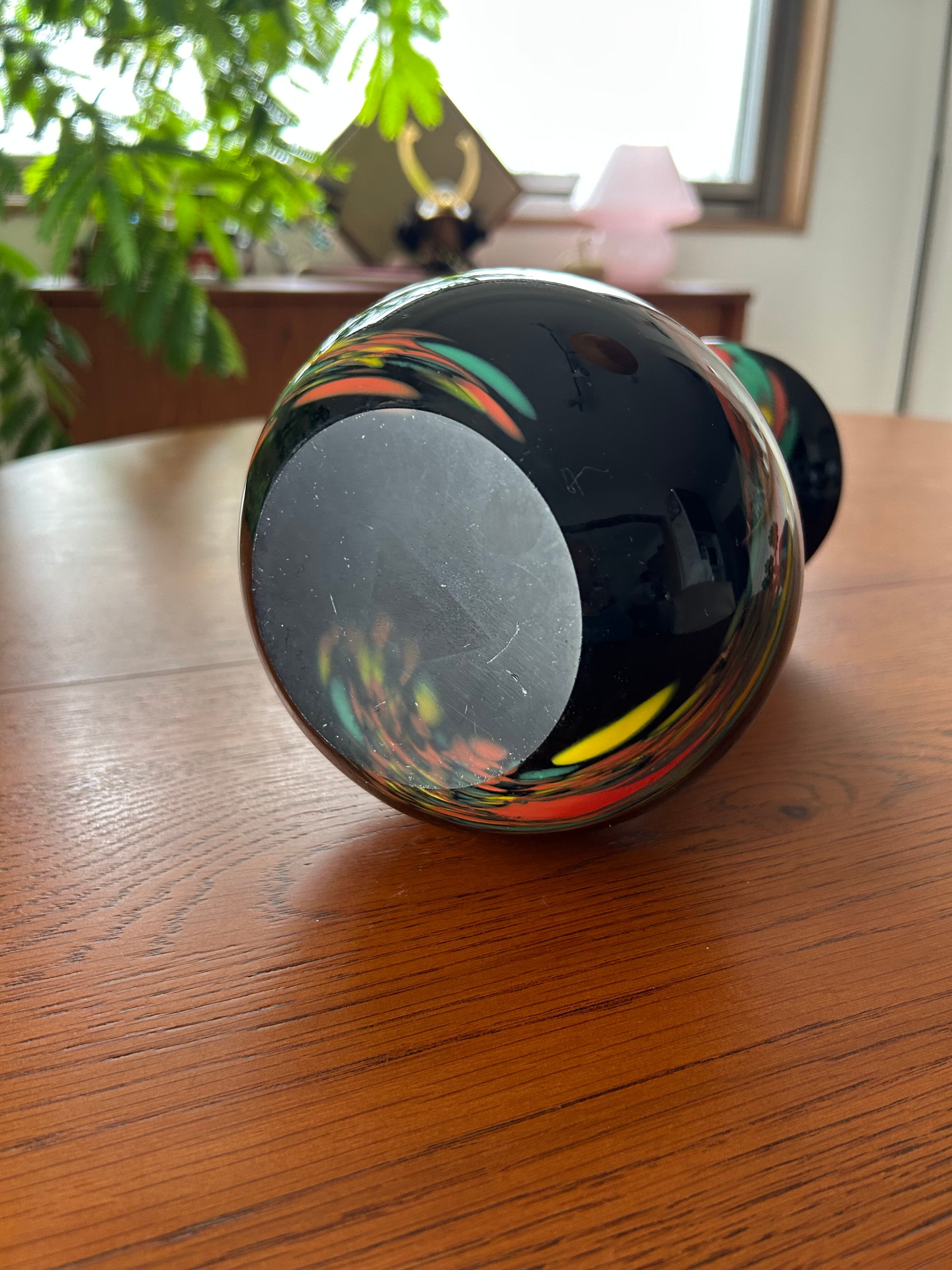 ガラス製の花器です。黒の下地に赤、緑、黄色の模様が入っています。
