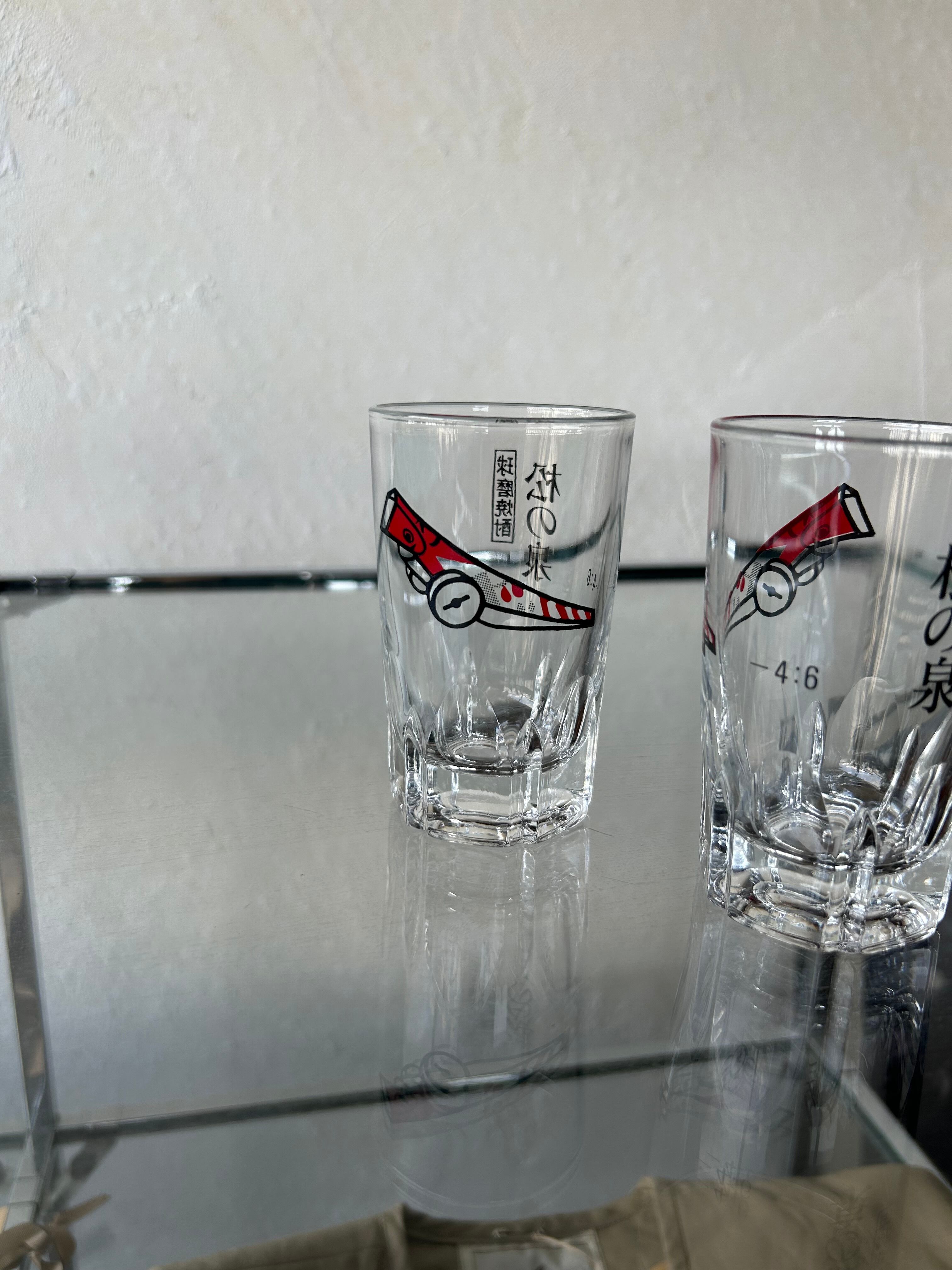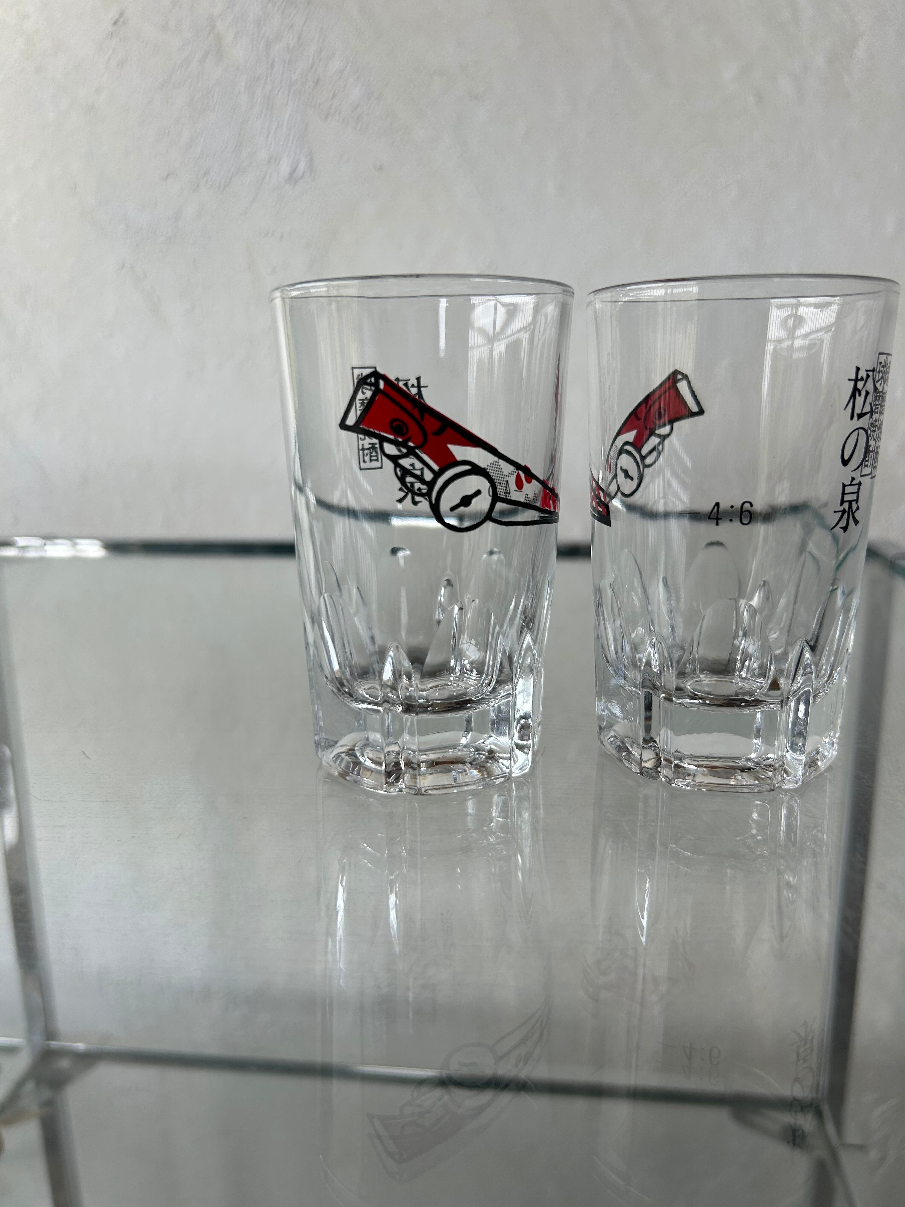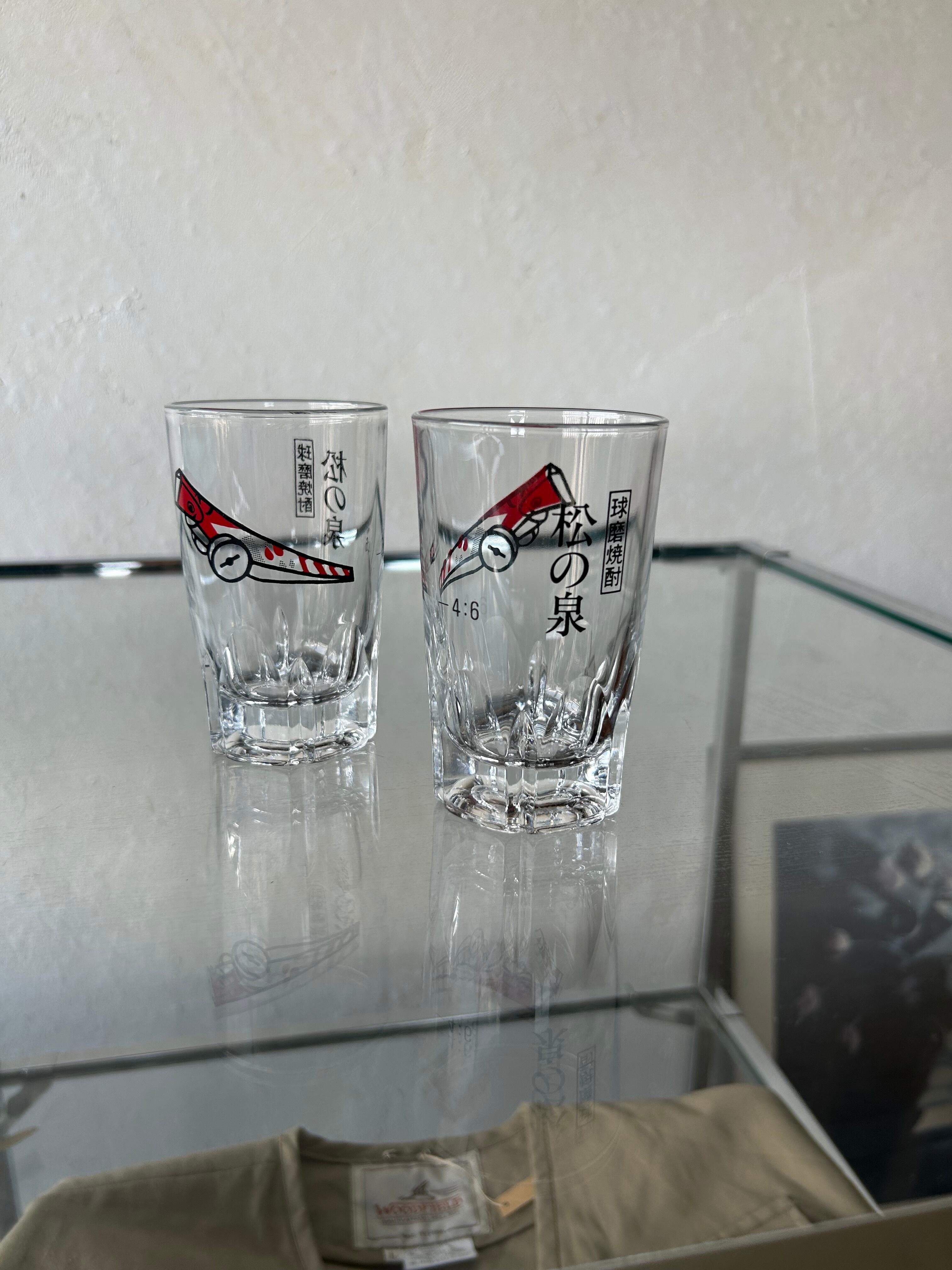 熊本県の南、人吉球磨地方の蔵元である松の泉酒造の焼酎グラスです。松の酒造とは、創業から120年以上にわたり、地元の人々に愛される晩酌焼酎を造られている蔵元さんです。グラスには、人吉球磨の伝統工芸品のきじうまの素朴なイラスト。「焼酎のロクヨン」と言われる、焼酎とお湯の割合が6:4になるようにお湯割りにする飲み方ができる目盛りつき。