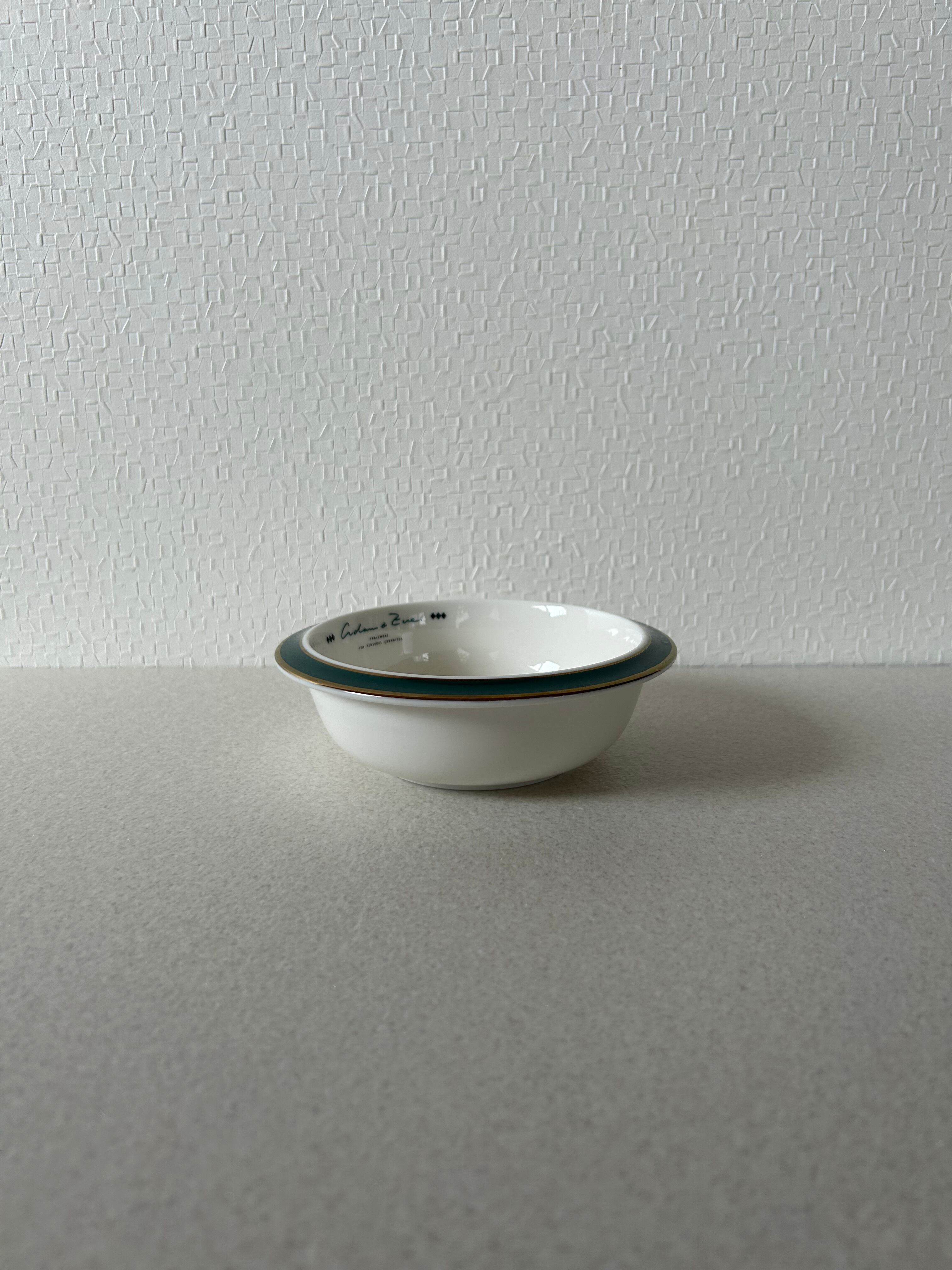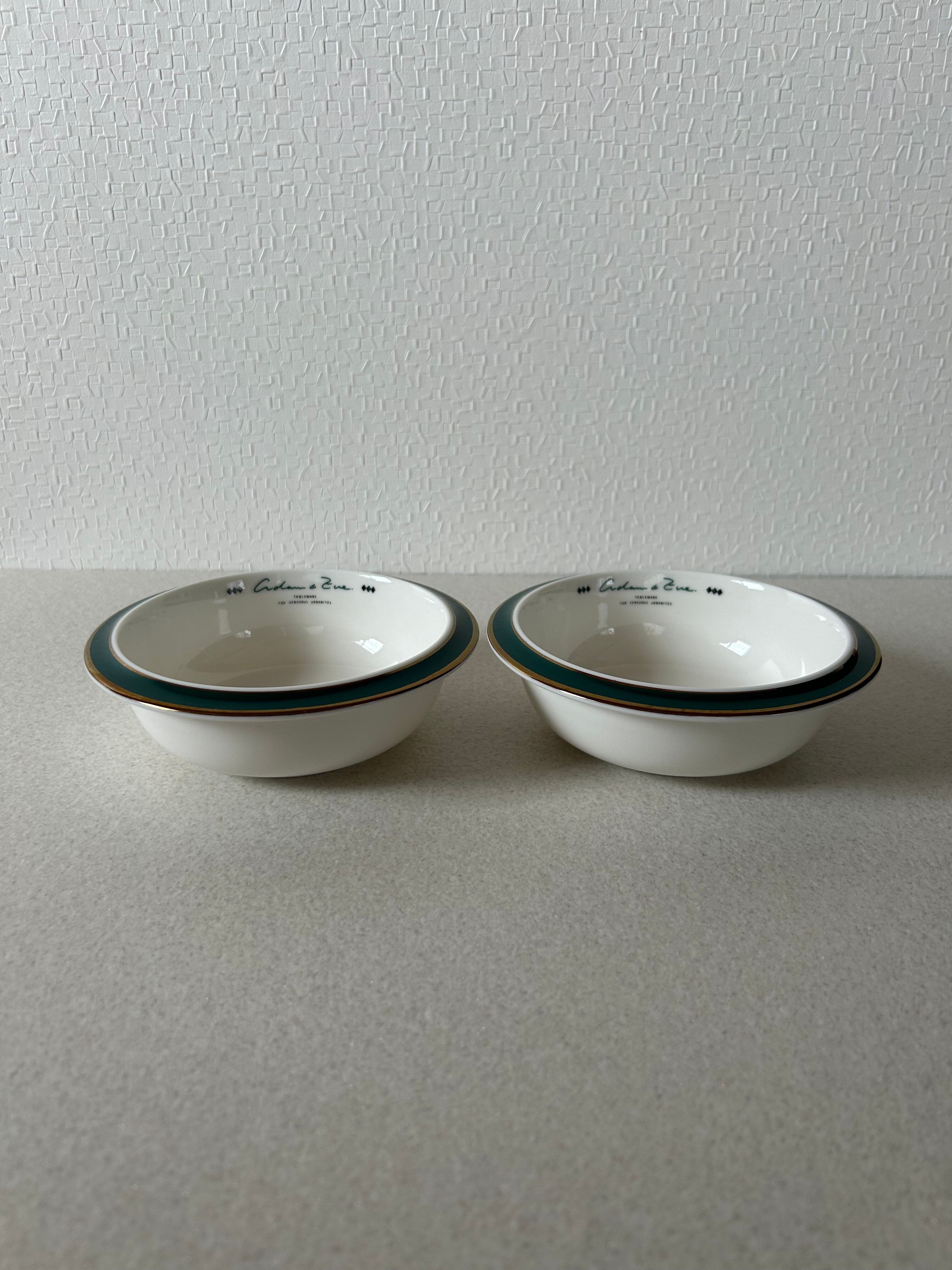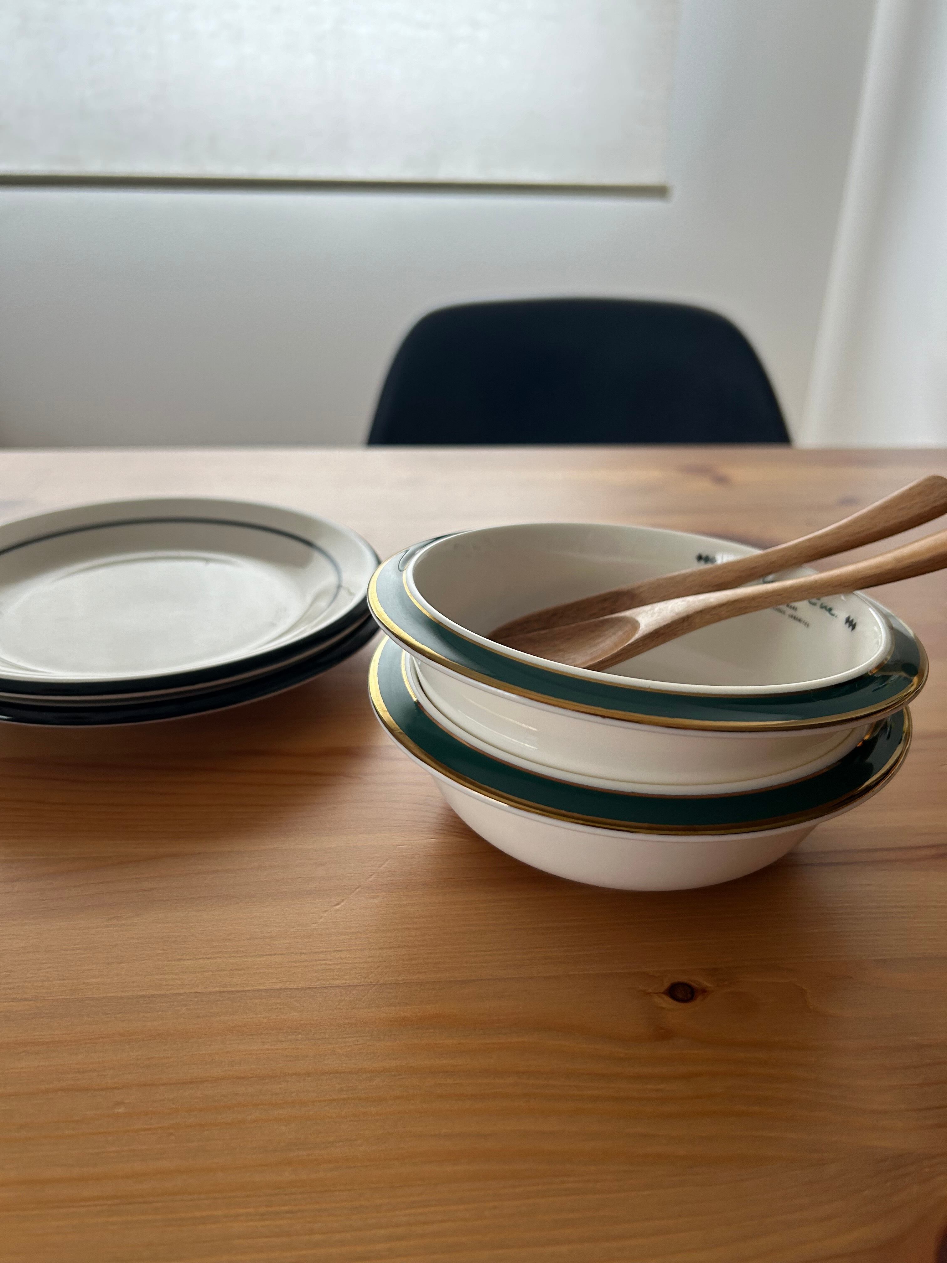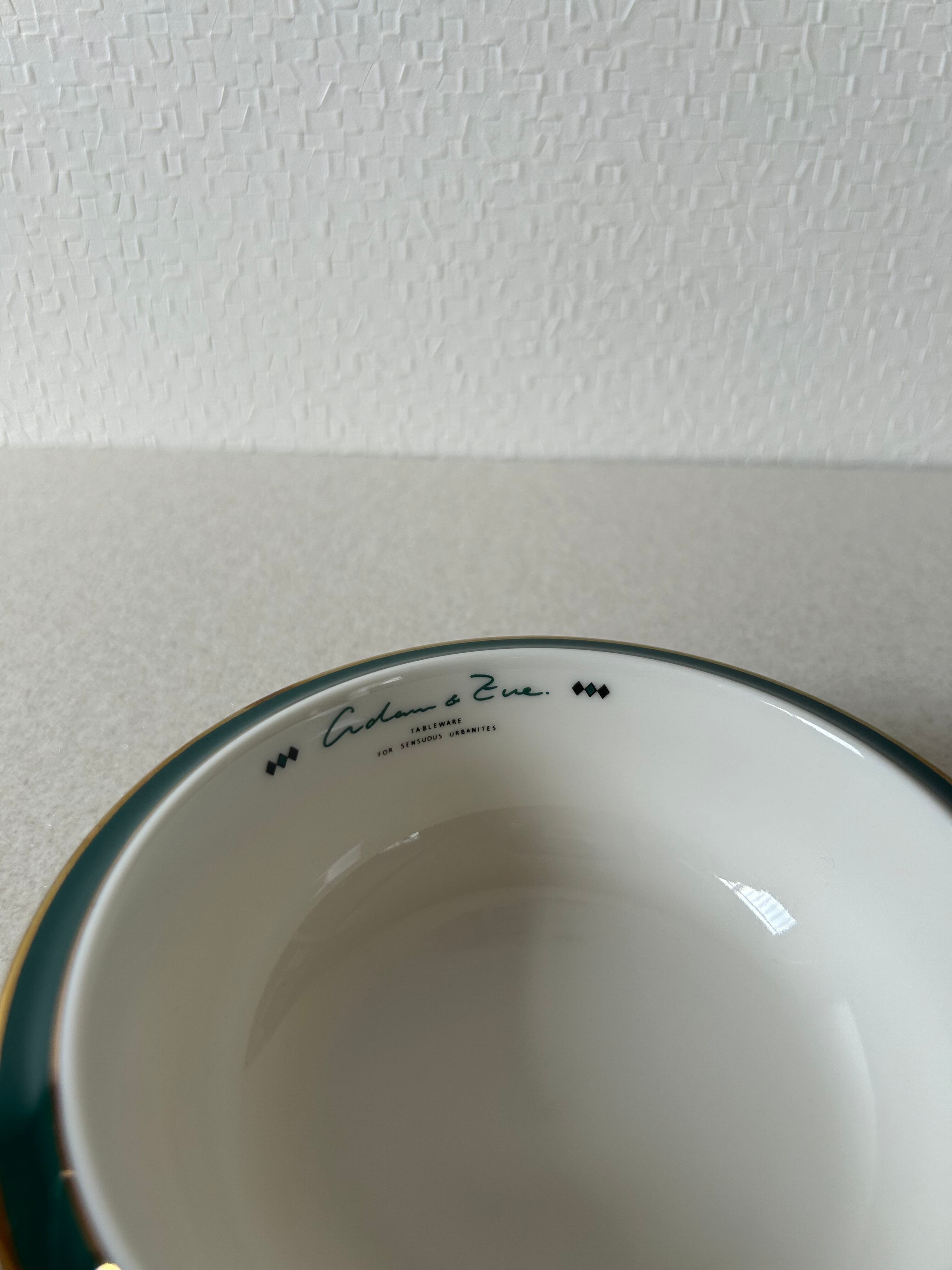 Adam&Eveの深さのあるお皿になります。リムはグリーンとゴールドのラインが入っており、内面にAdam&Eveのロゴがあります。深さがあるので、サラダやスープ、フルーツなどに。