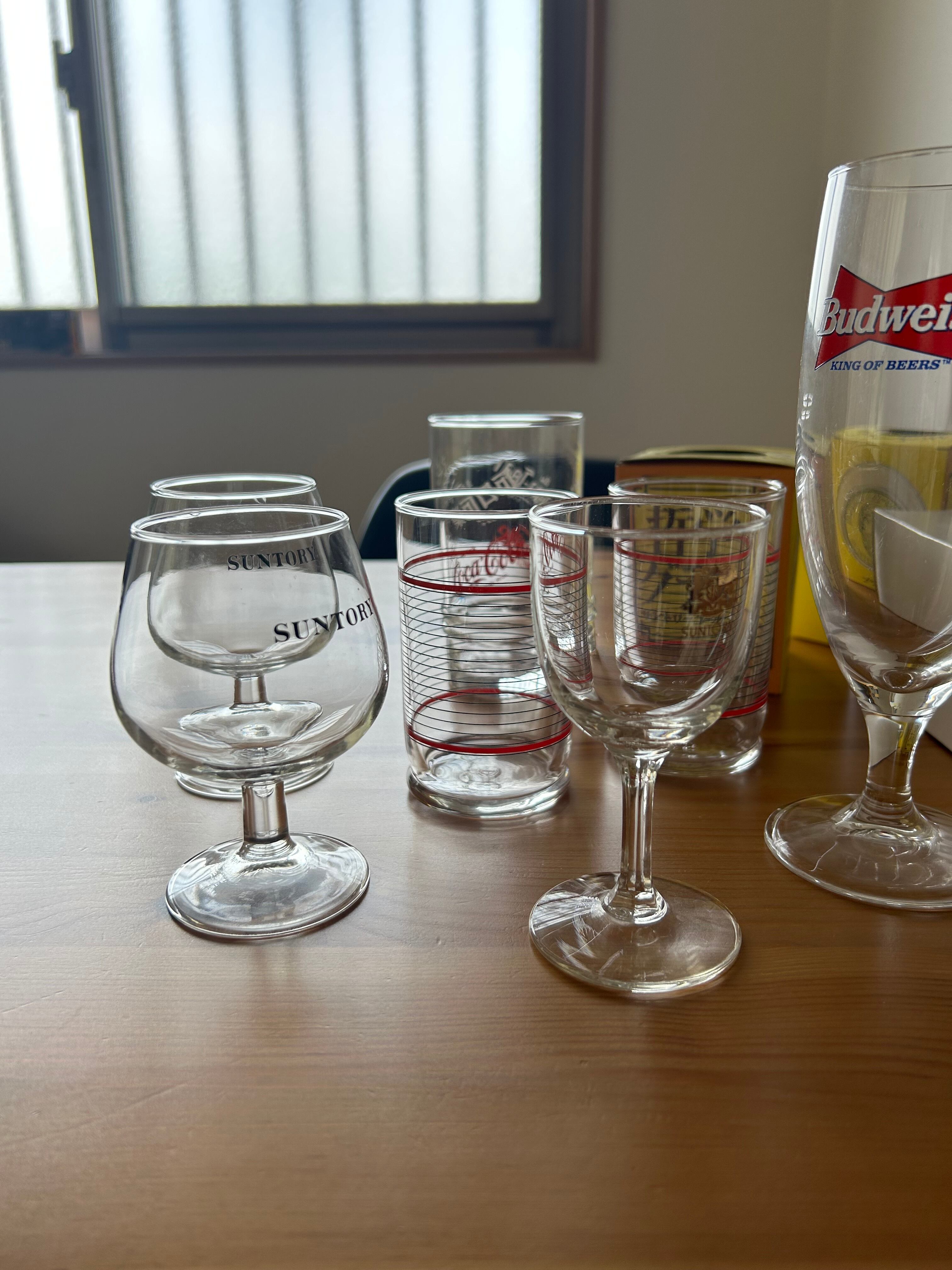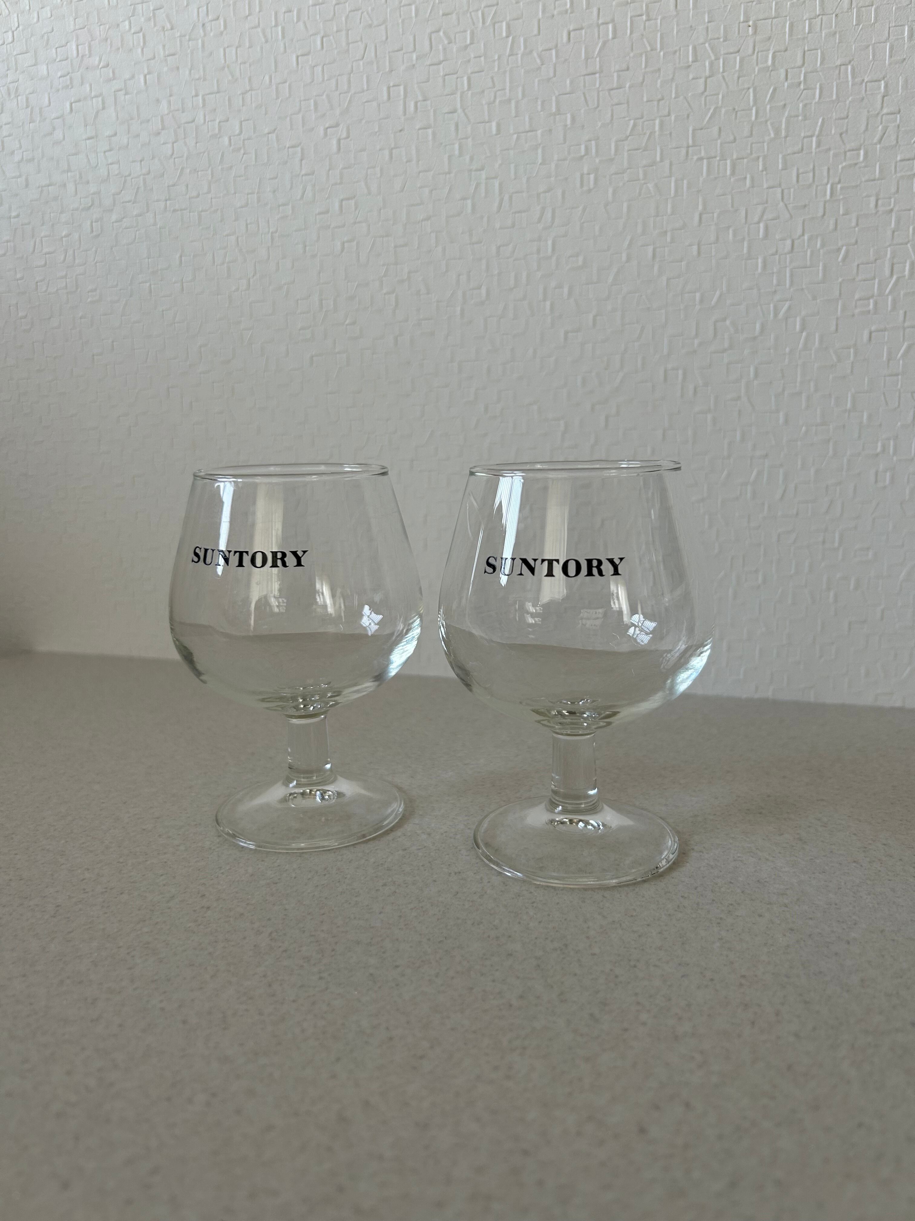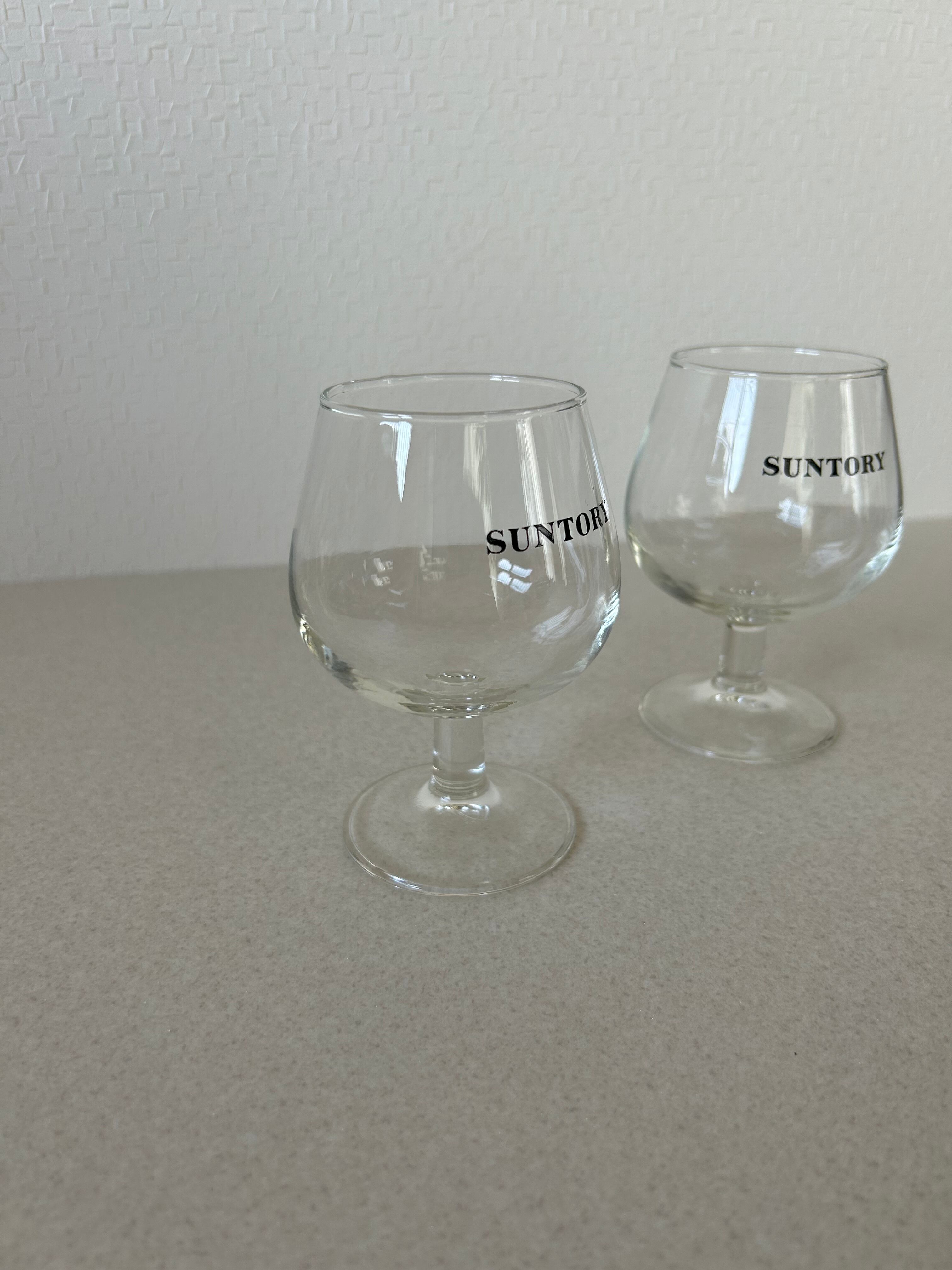 サントリーのロゴがかかれた小サイズのグラスになります。シンプルなsuntryのロゴに、ぽってりとした形です。お酒やアイスクリームを入れても、小さいお花を水に浮かべても◯。