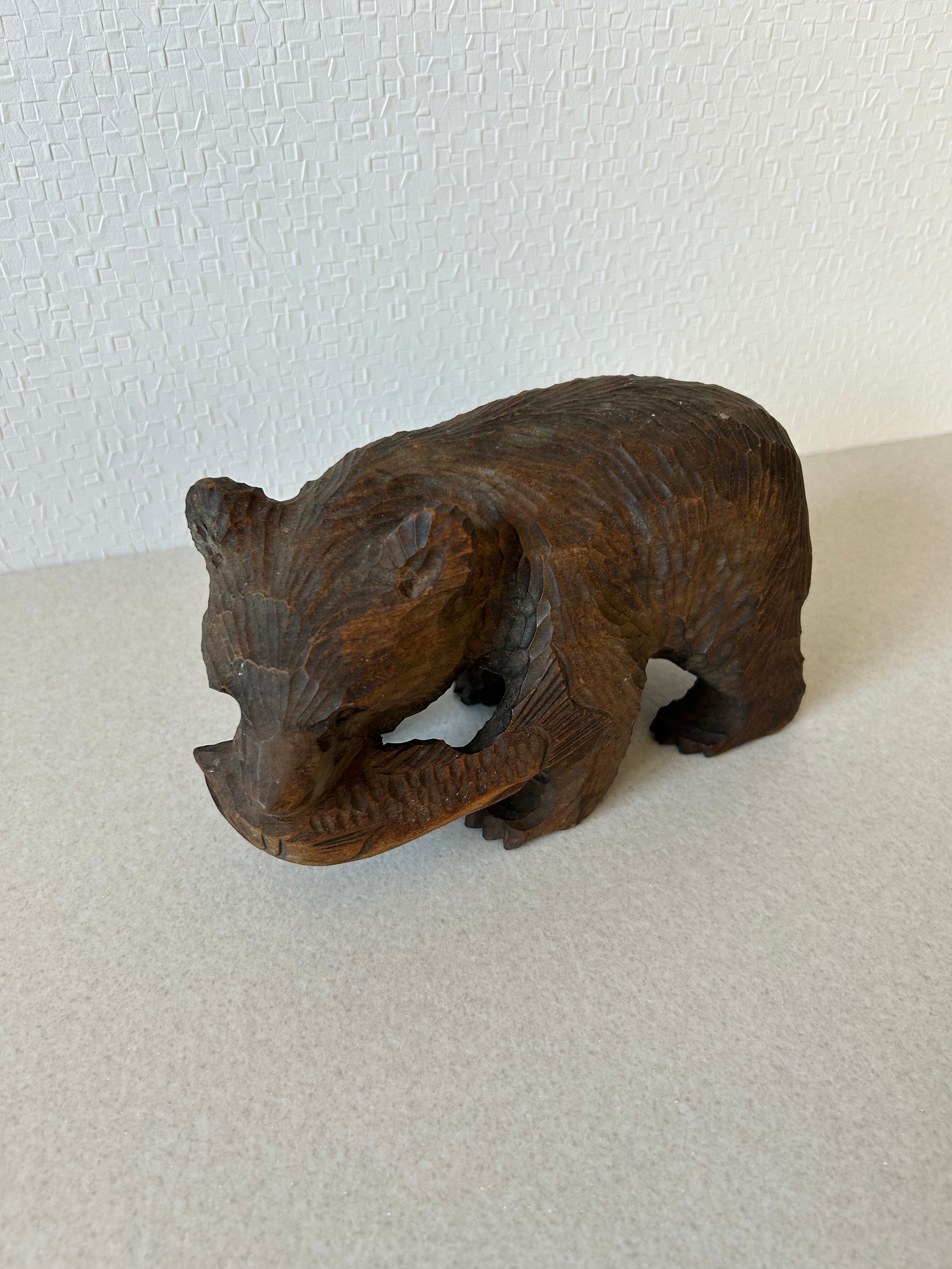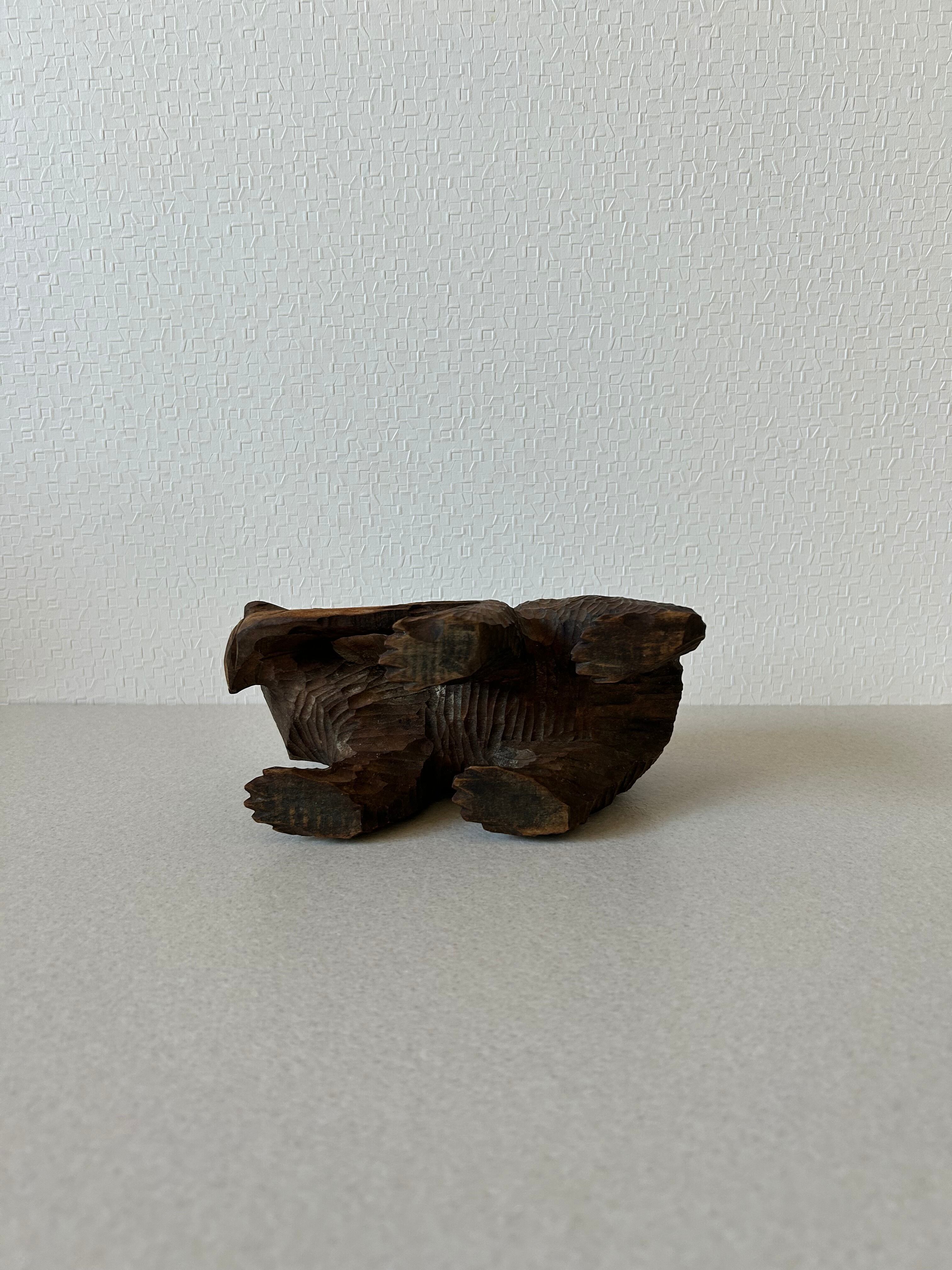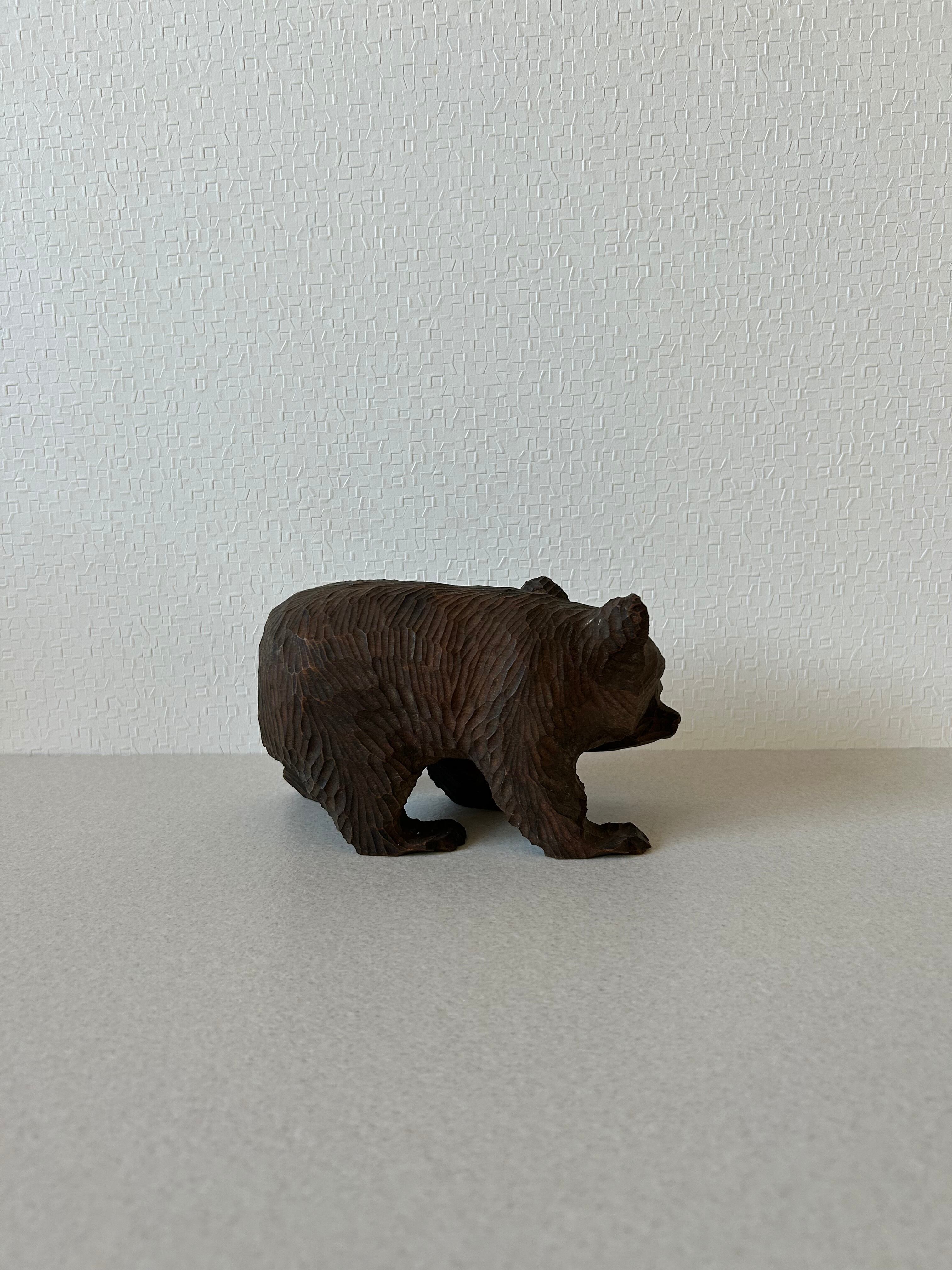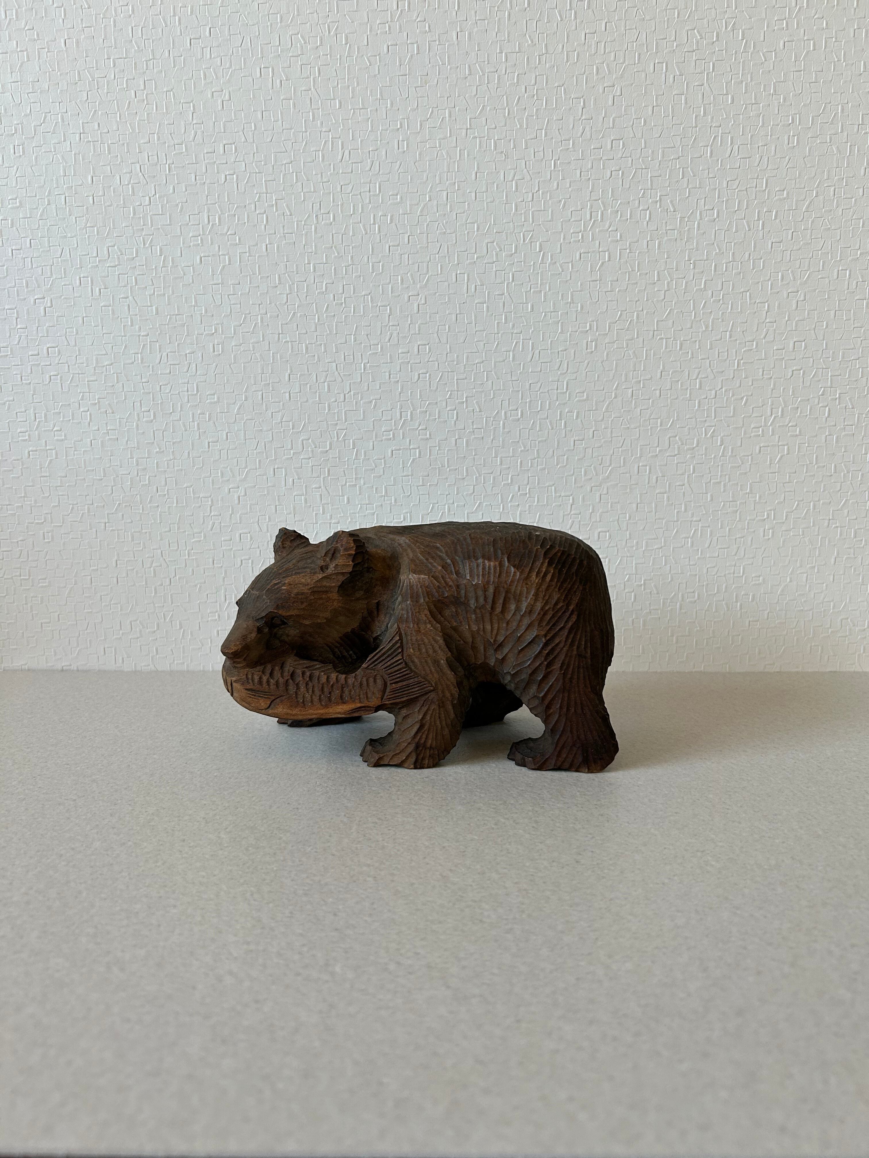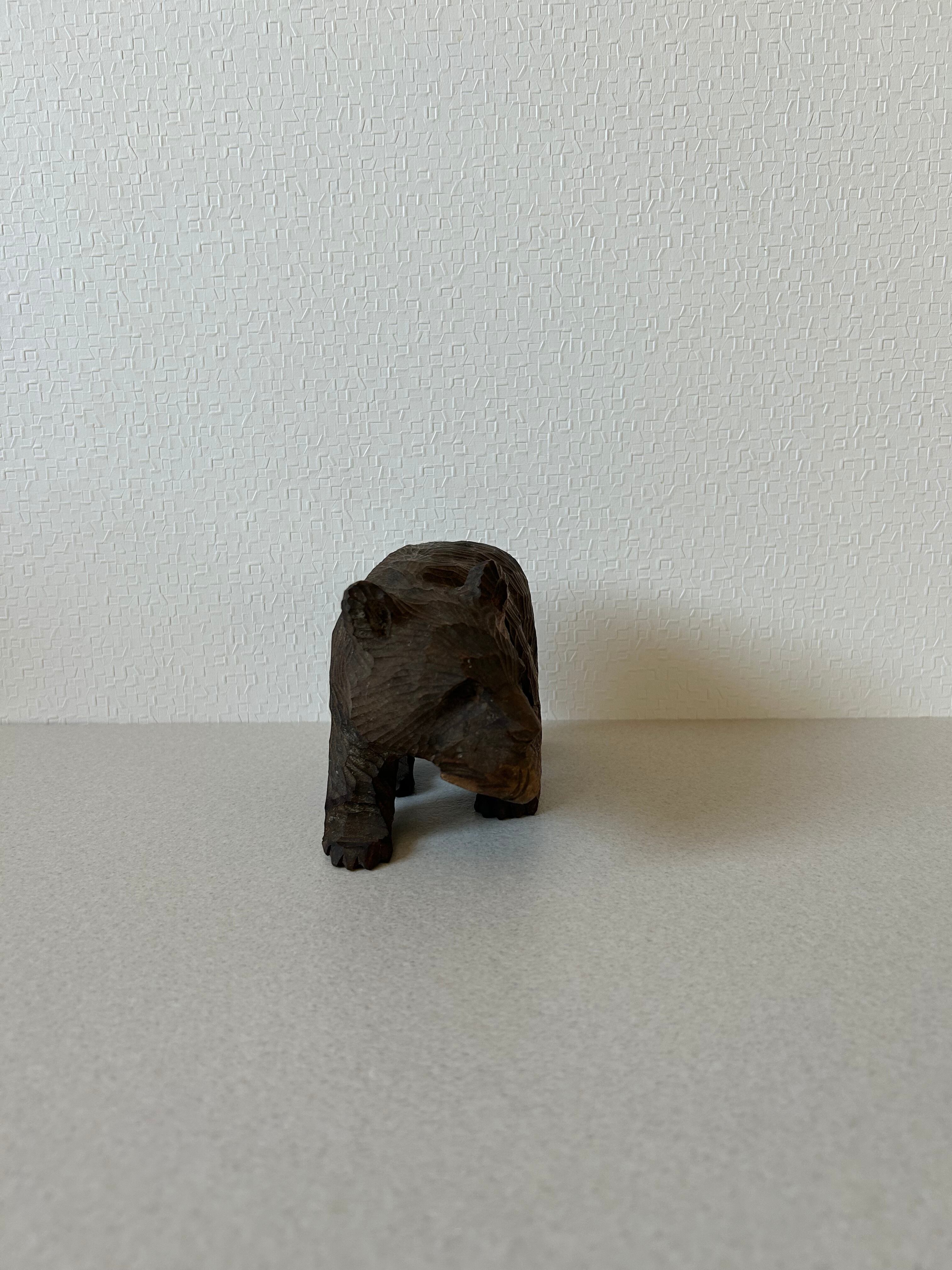 木彫りの熊の置き物になります。比較的大きなサイズの木彫り熊はよく見られますが、この熊は小ぶりですので場所を選ばず置いていただけるかと思います。