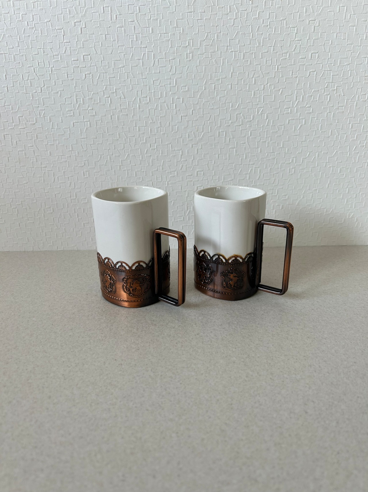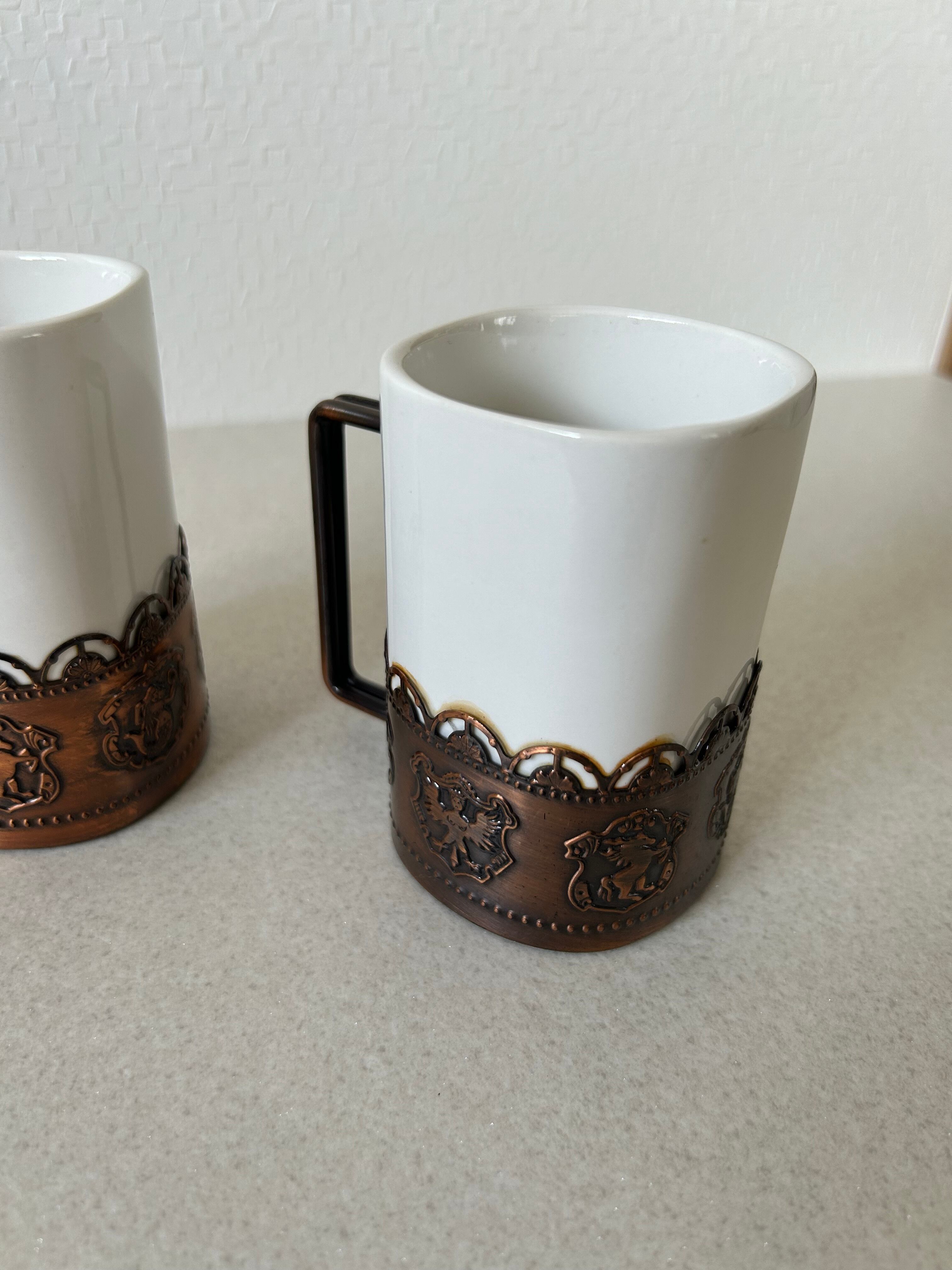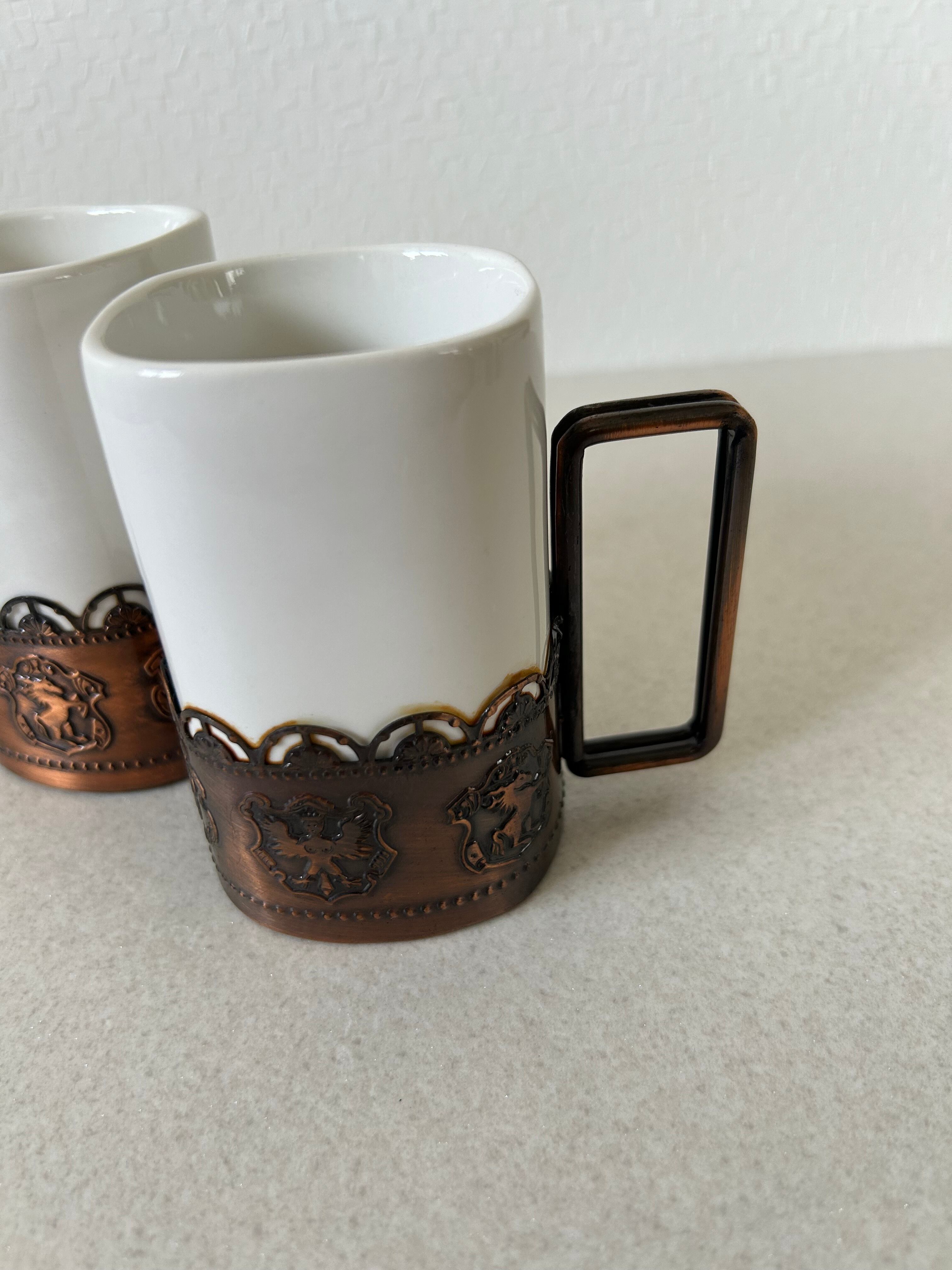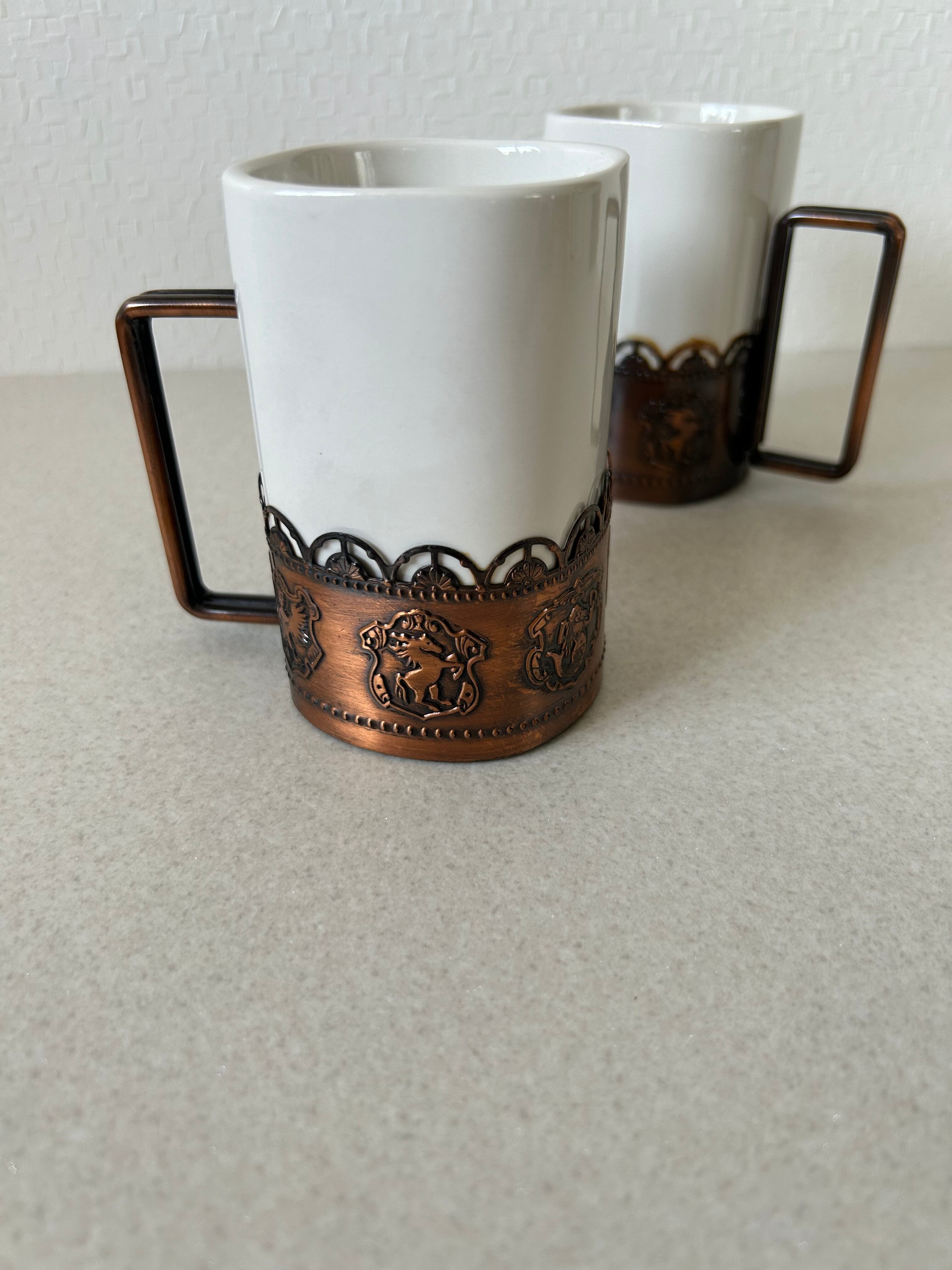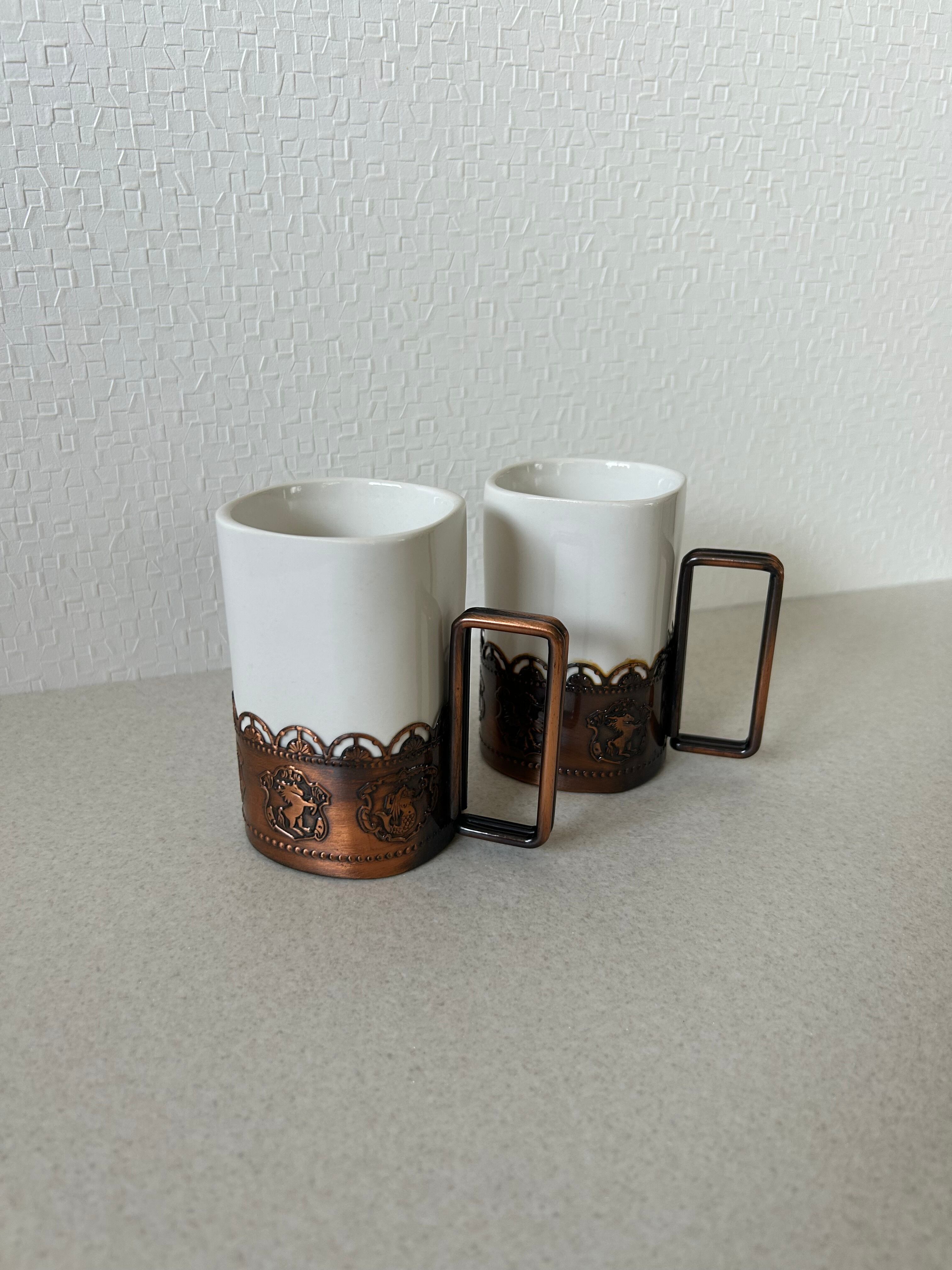 金属フレームのついたマグカップ、ペアでの販売となります。容器部は陶器かと思われ、少し重みのあるコップです。金属部にはエンブレムが描かれており、インテリアとしても◯。