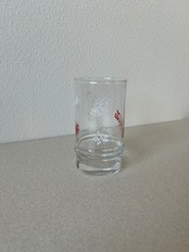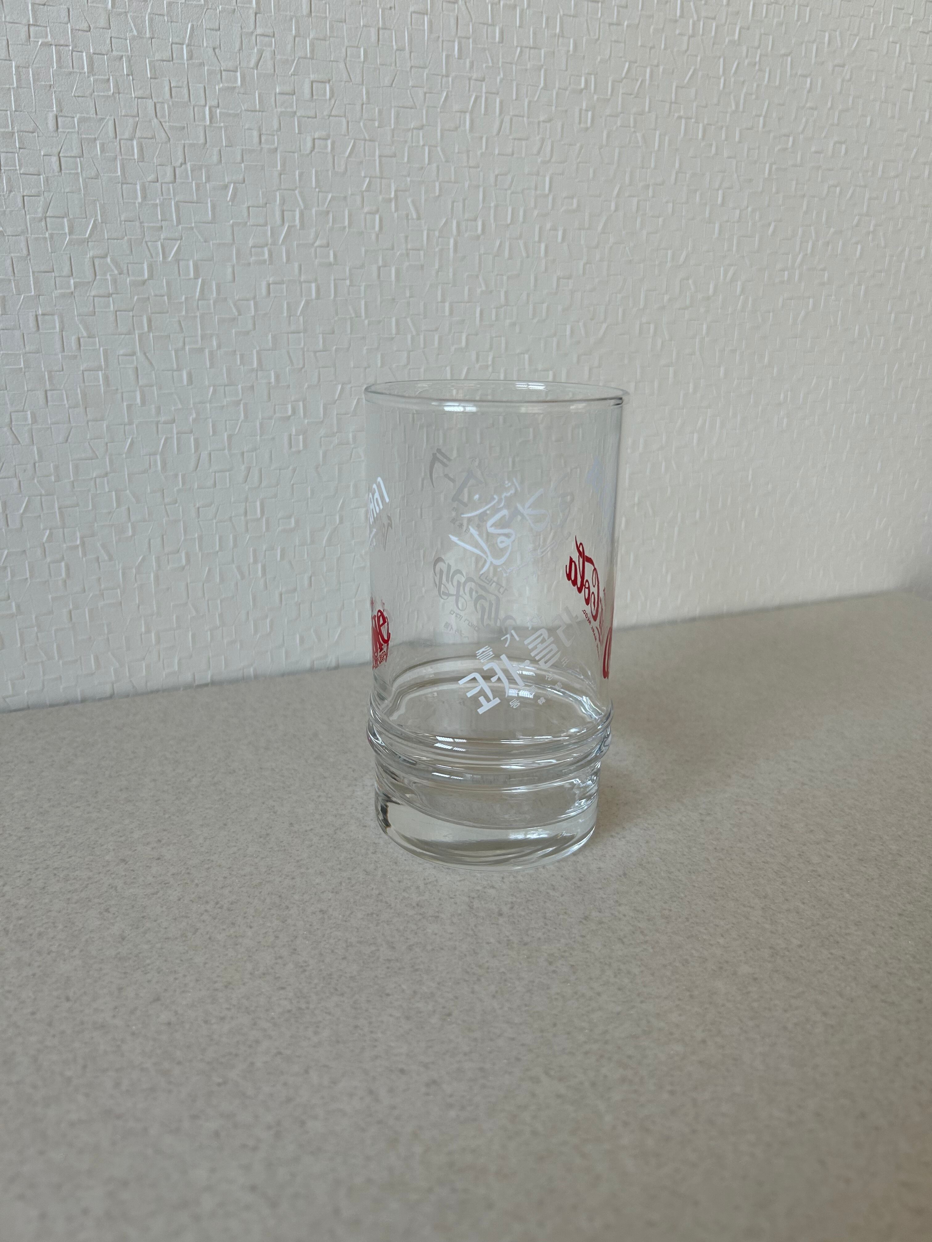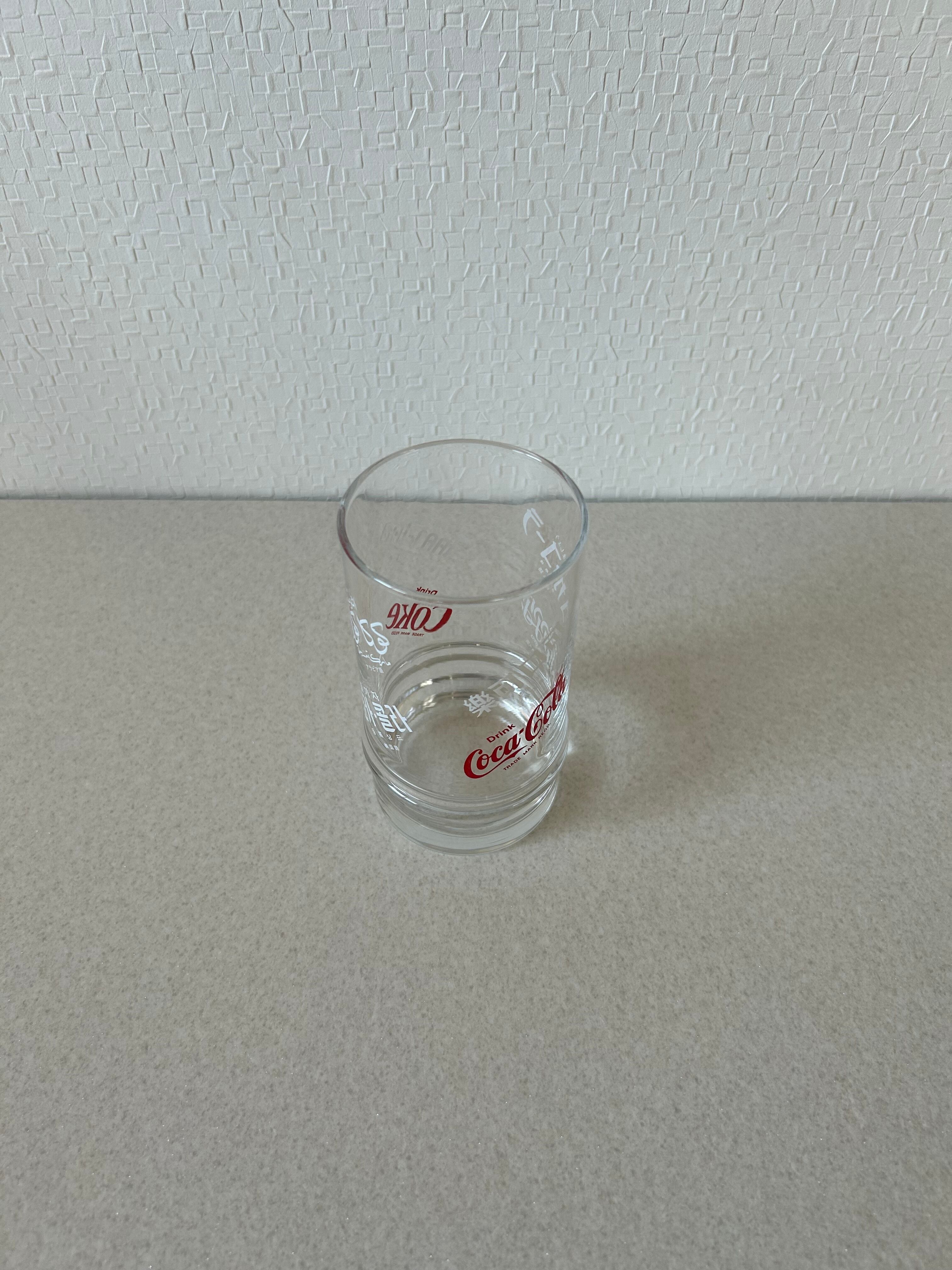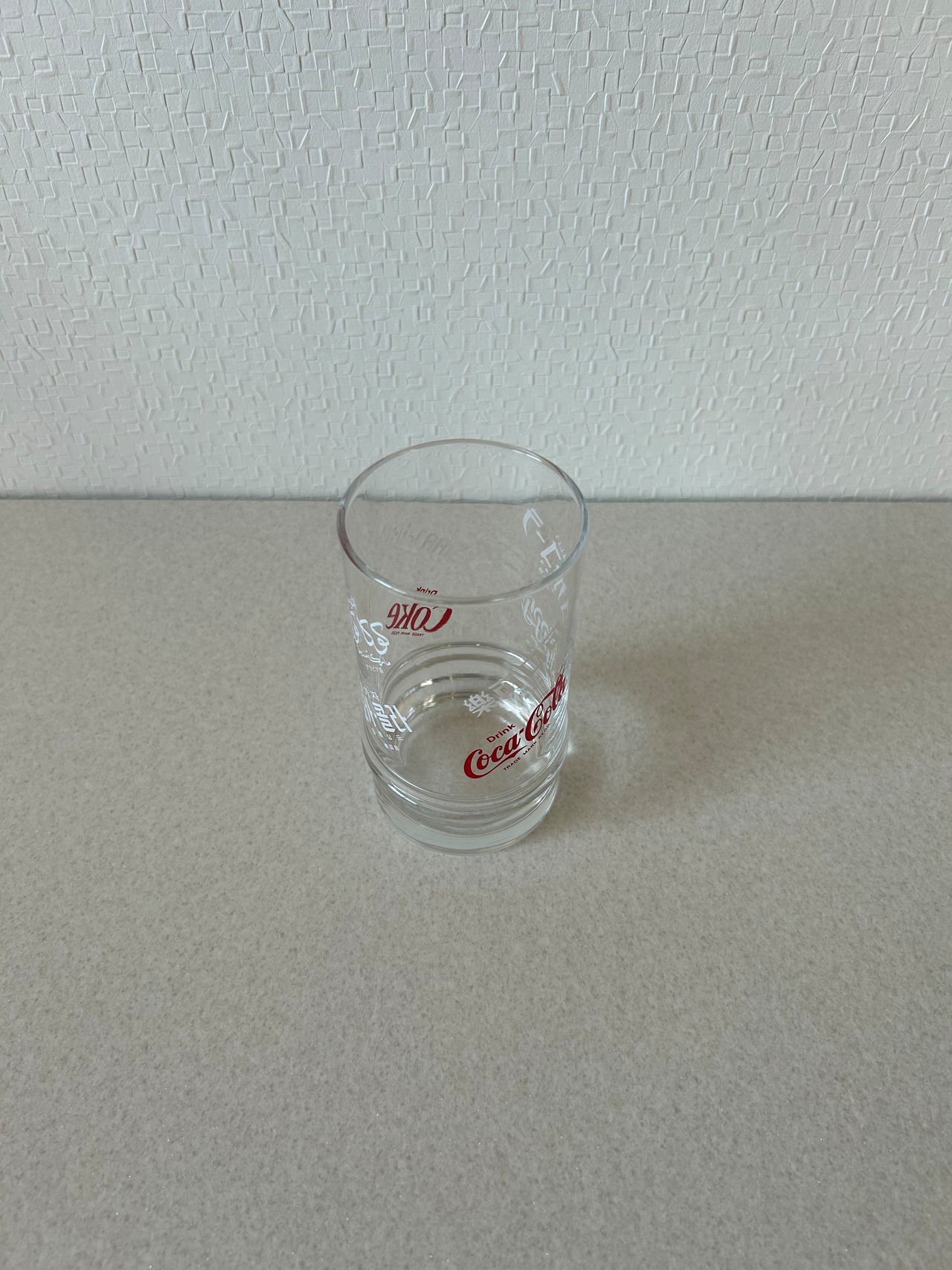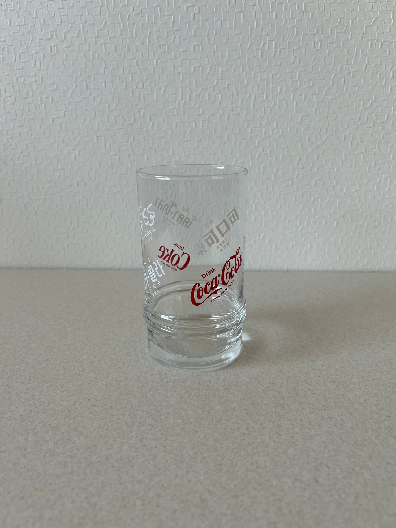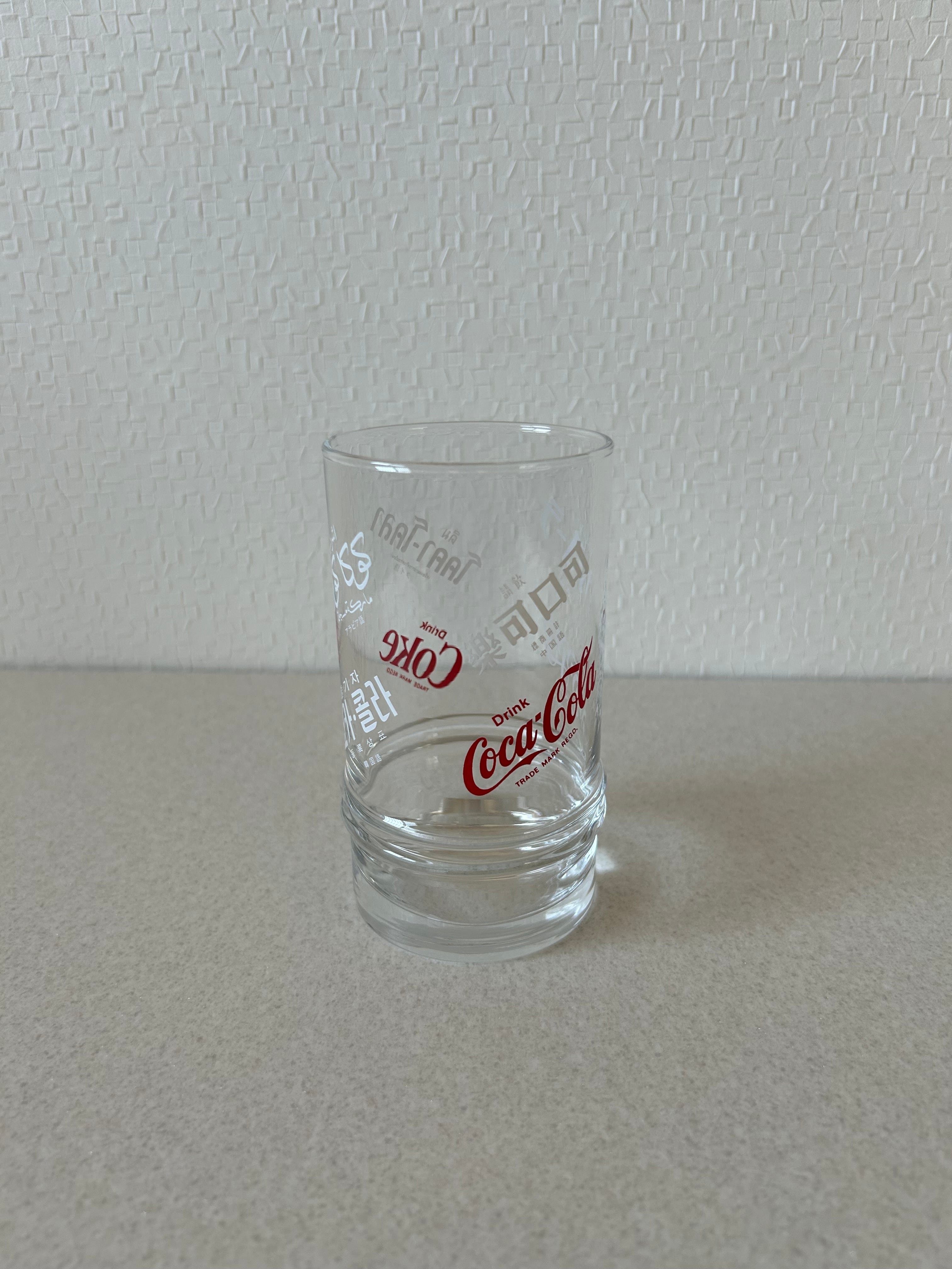 コカコーラの文字が多言語で書かれたガラス製のコップ、タンブラーになります。赤と白でランダムに書かれたデザインが魅力的です。