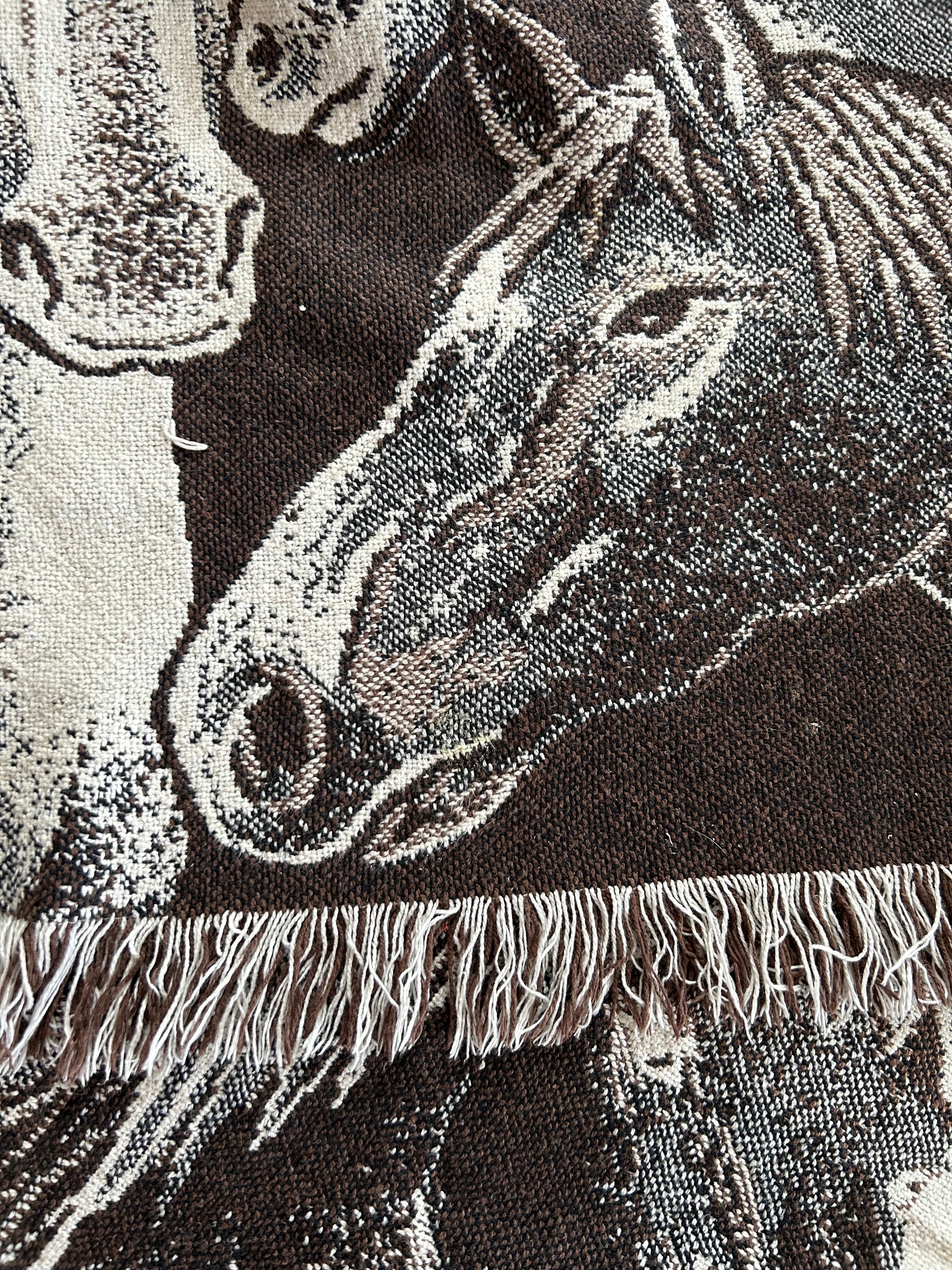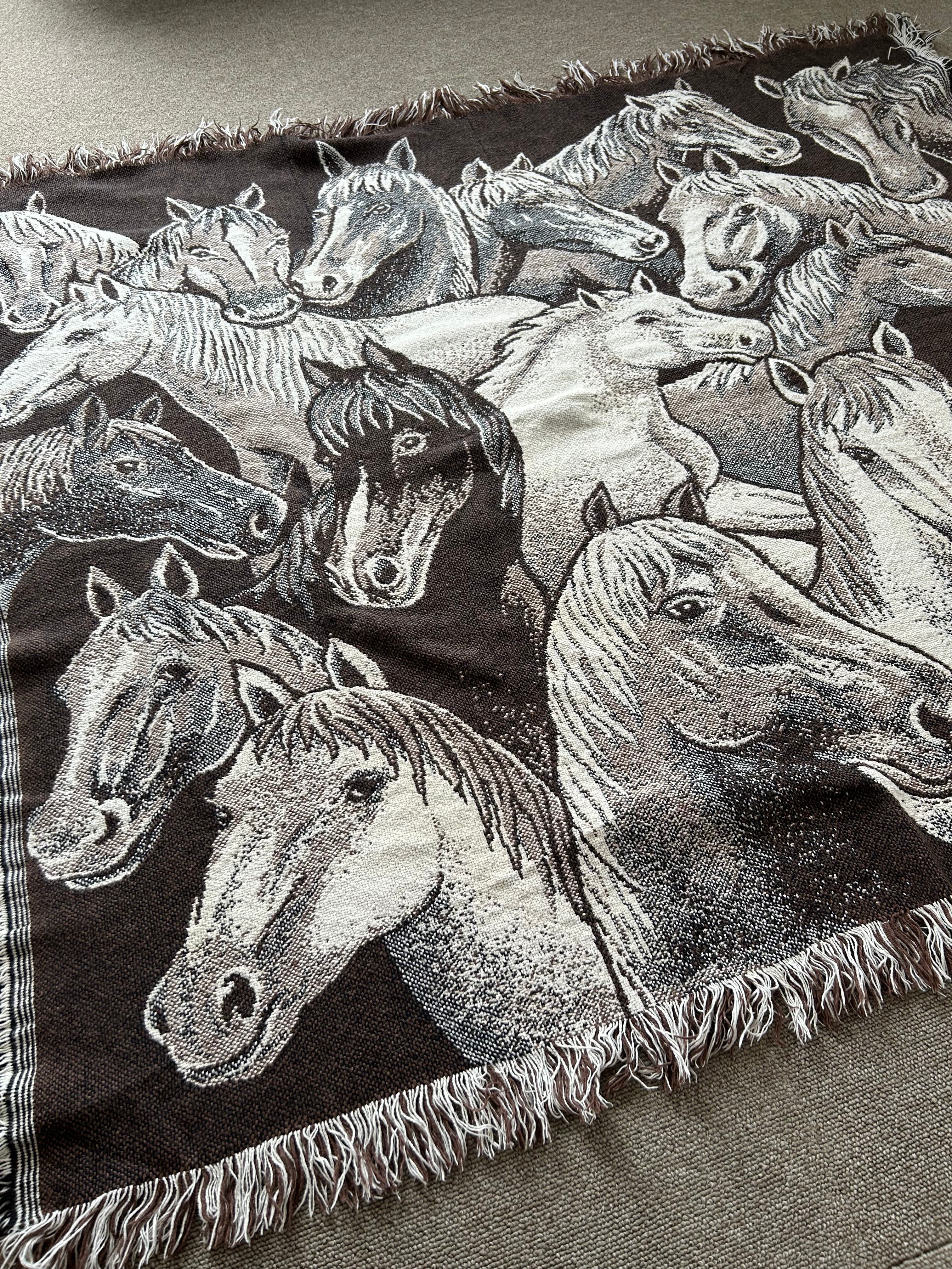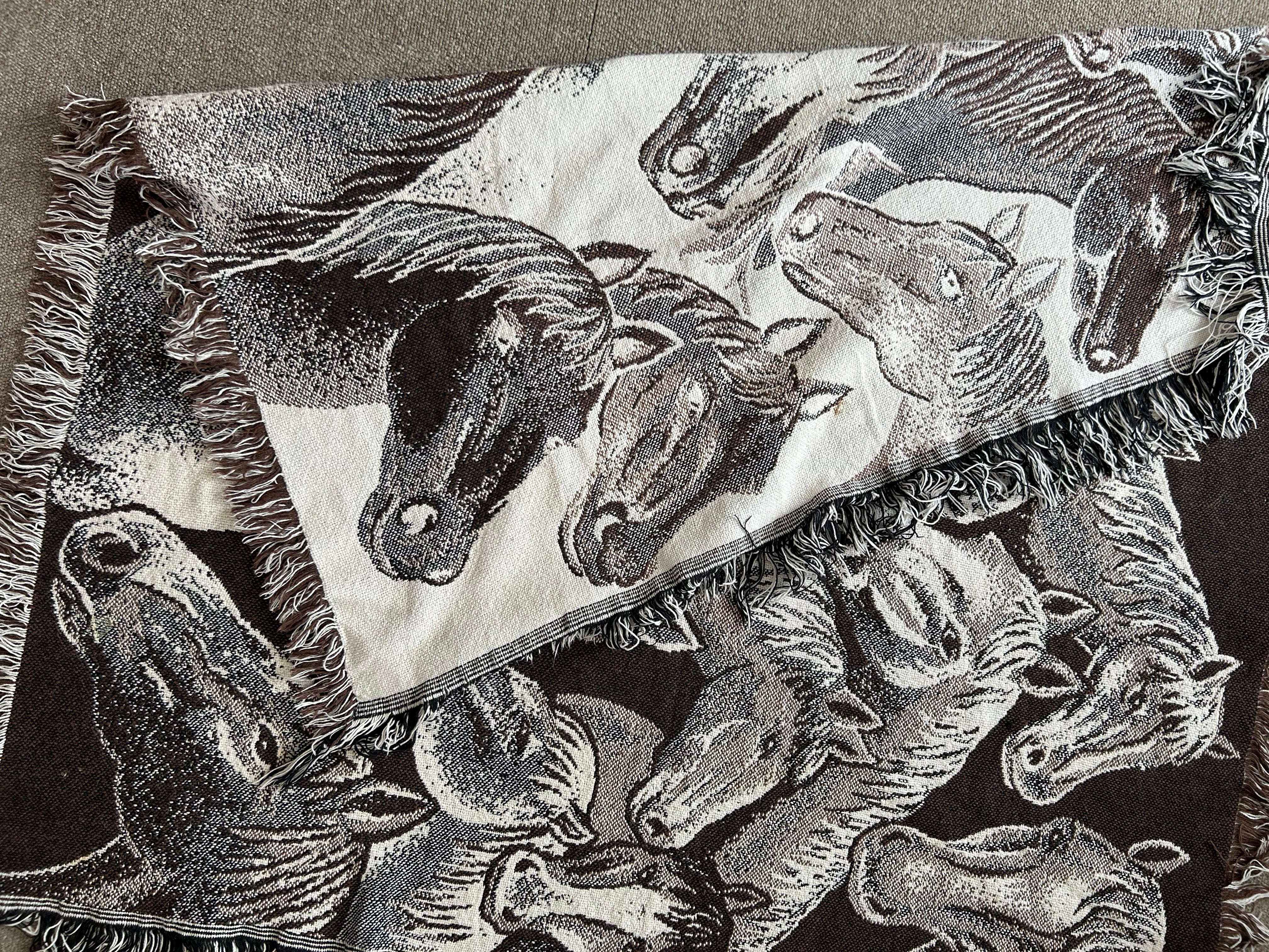 大判のブランケットです。多くの馬が描かれておりますが、落ち着いた配色であるためインテリアとして馴染みやすいかと思います。