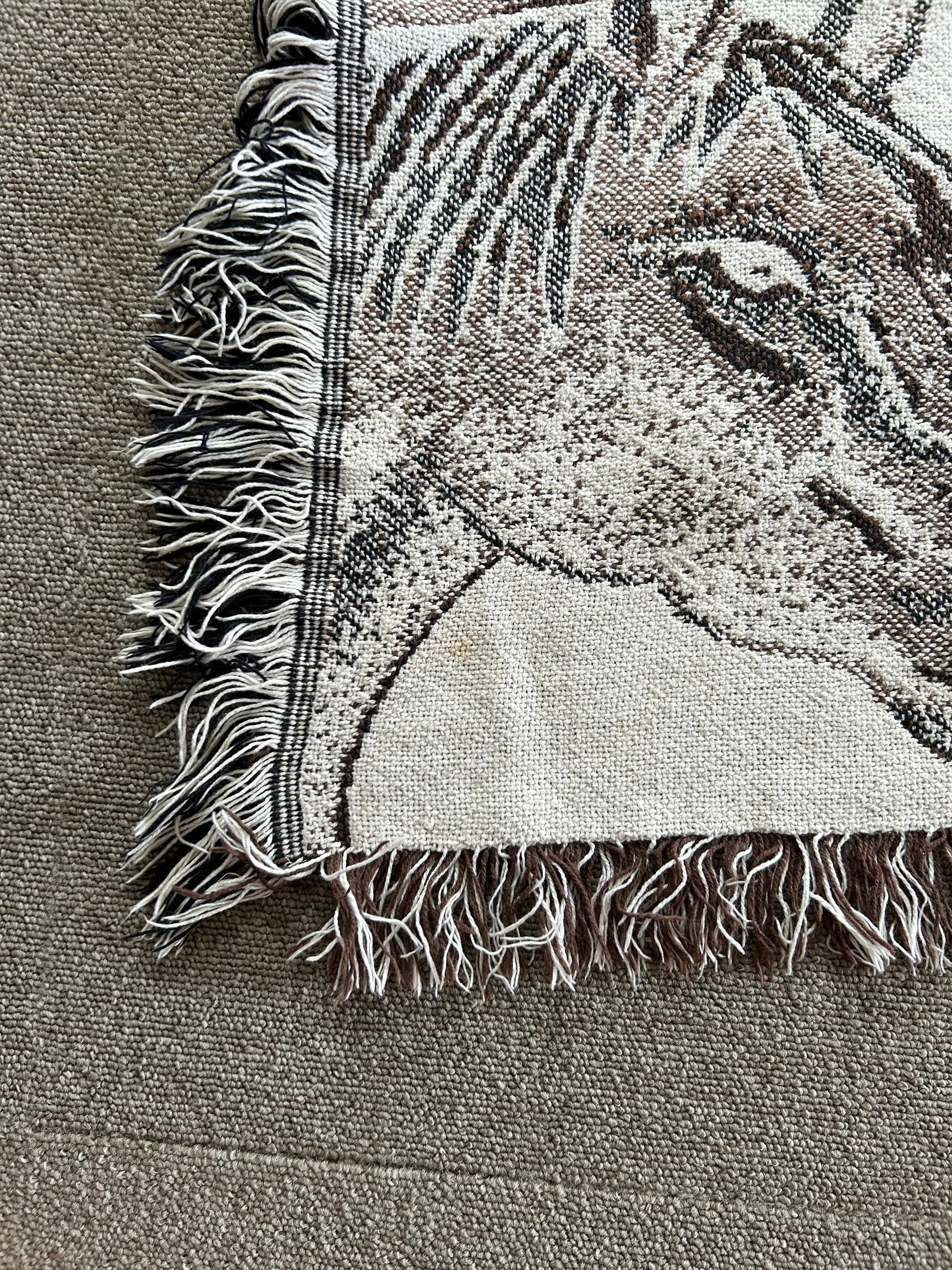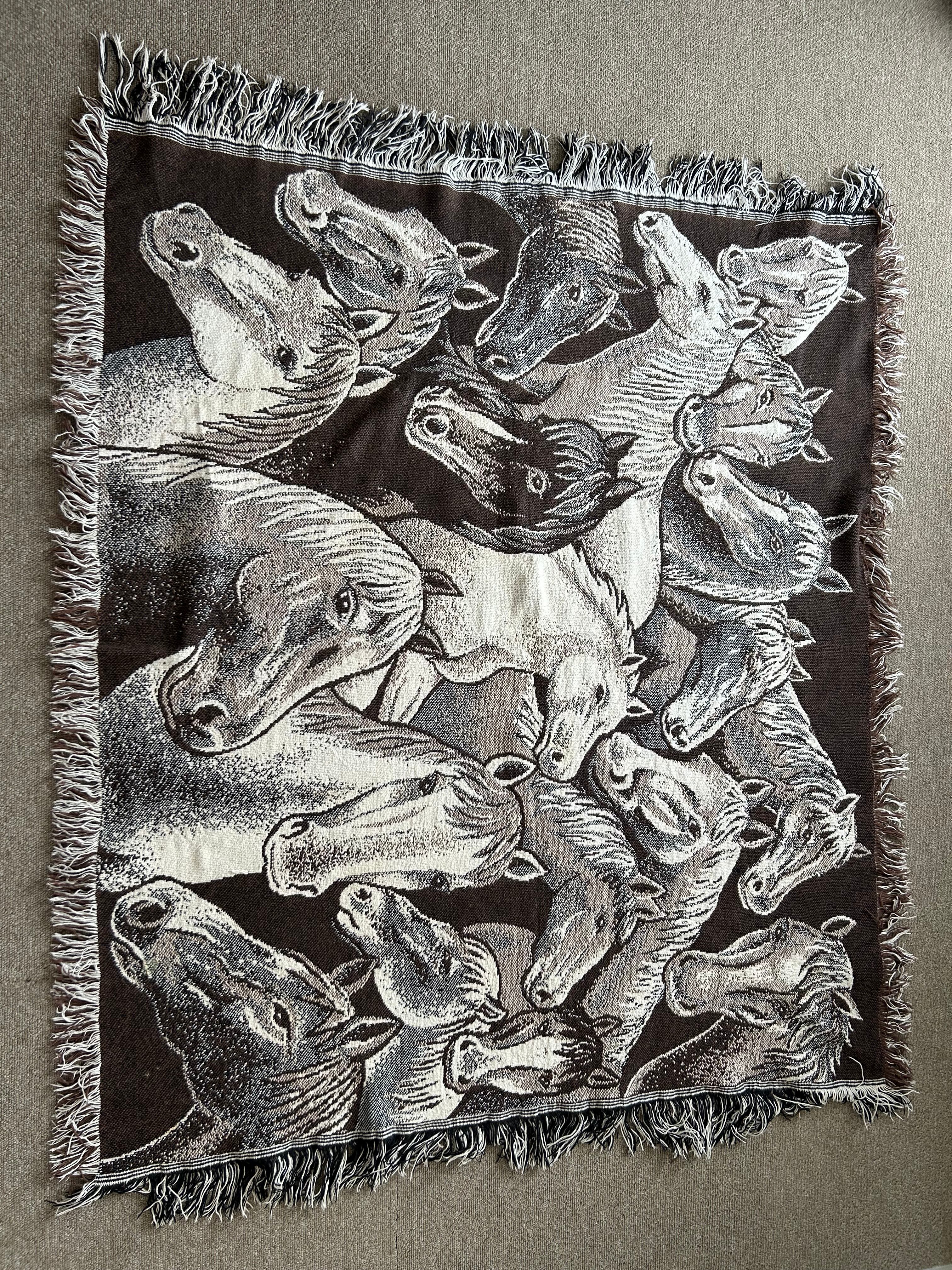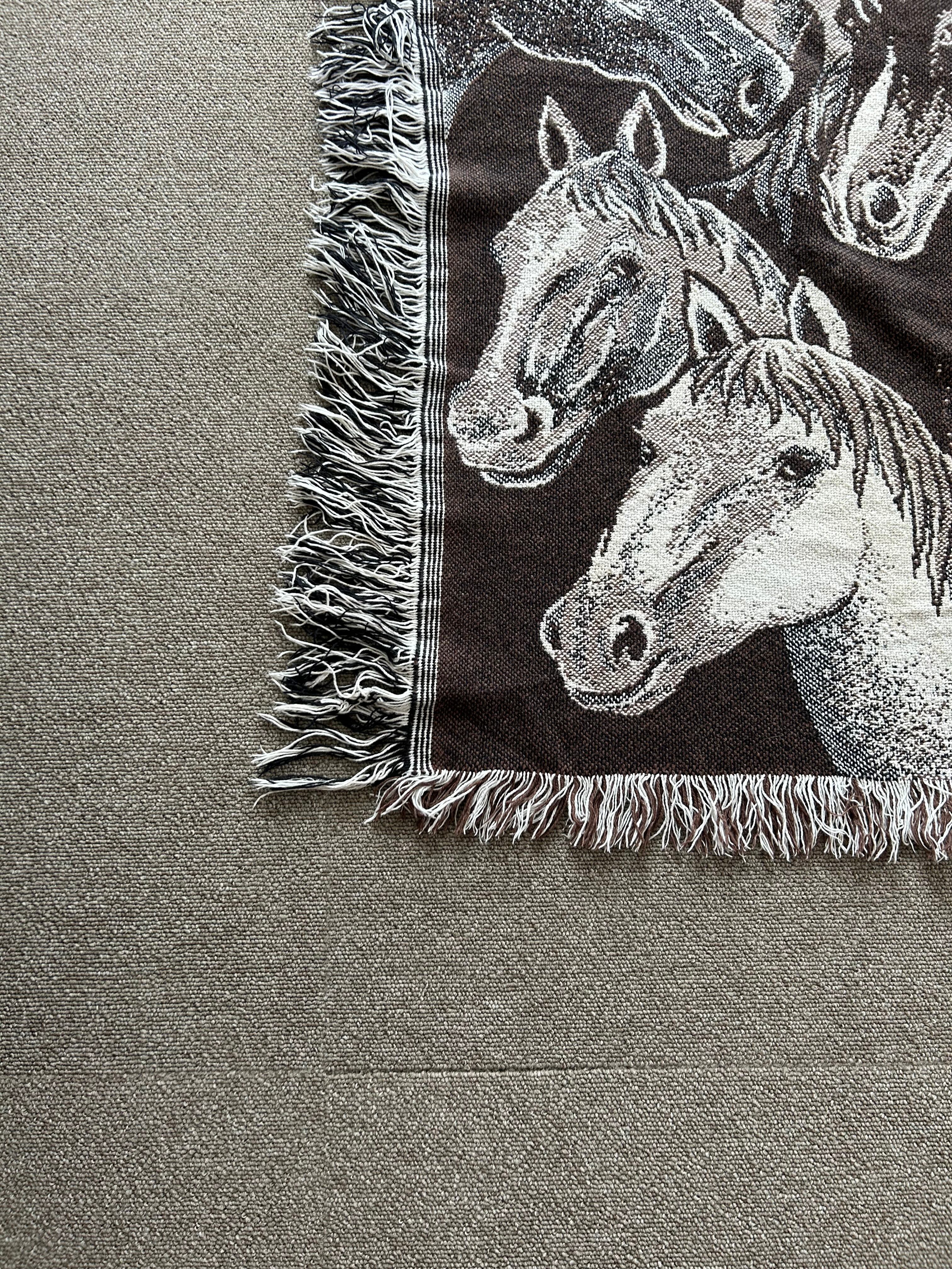 大判のブランケットです。多くの馬が描かれておりますが、落ち着いた配色であるためインテリアとして馴染みやすいかと思います。