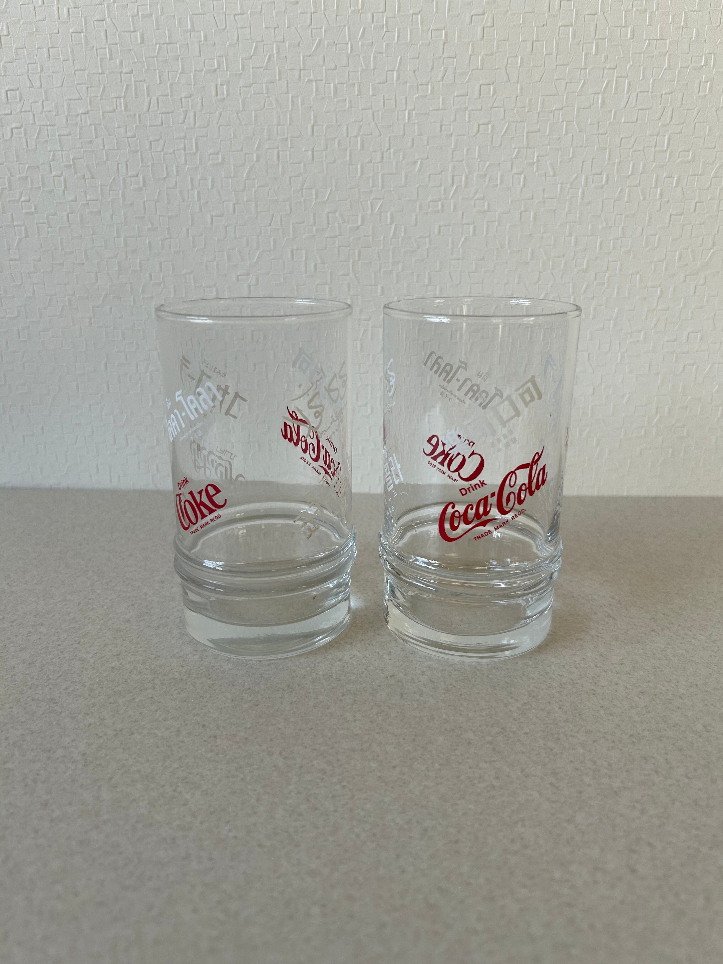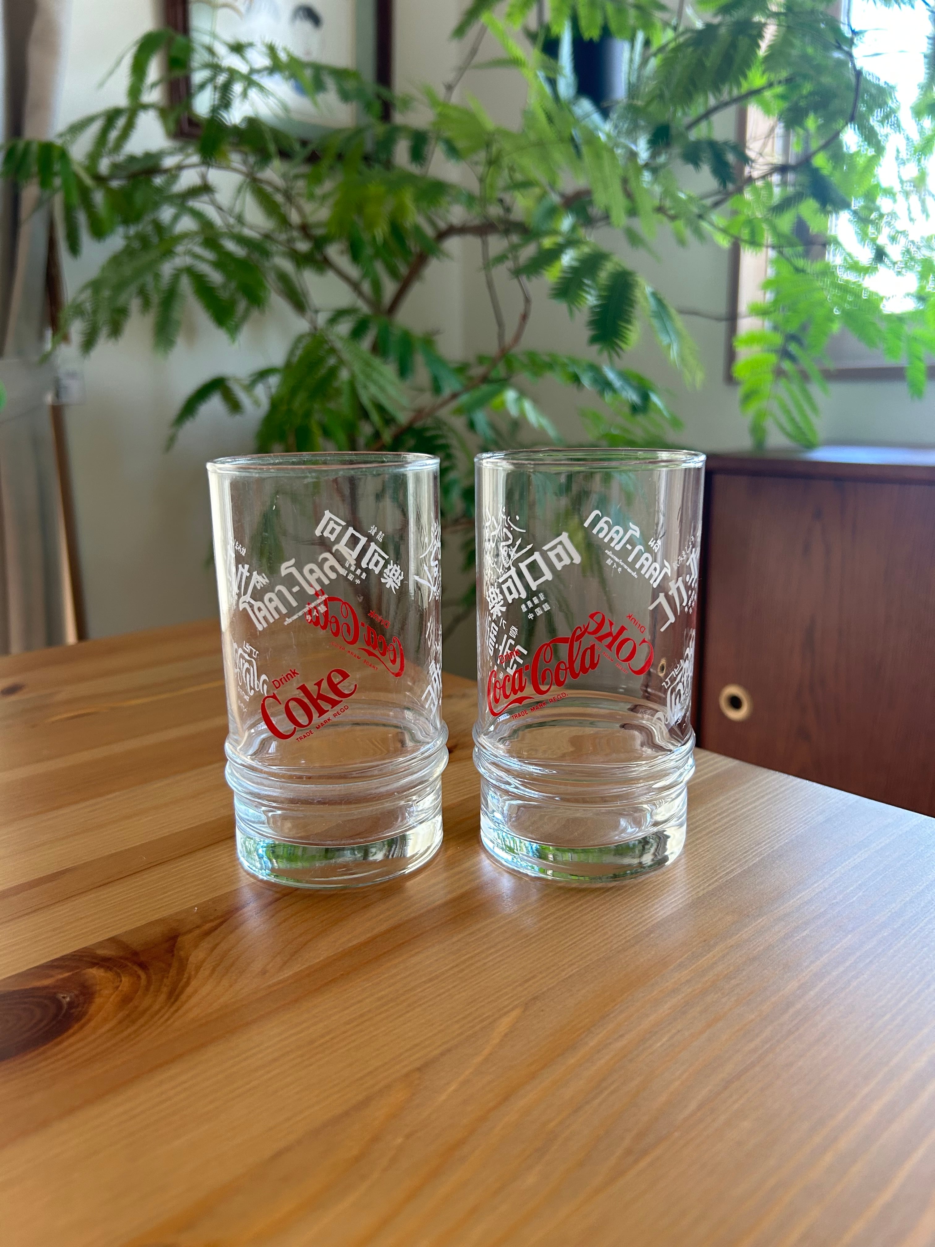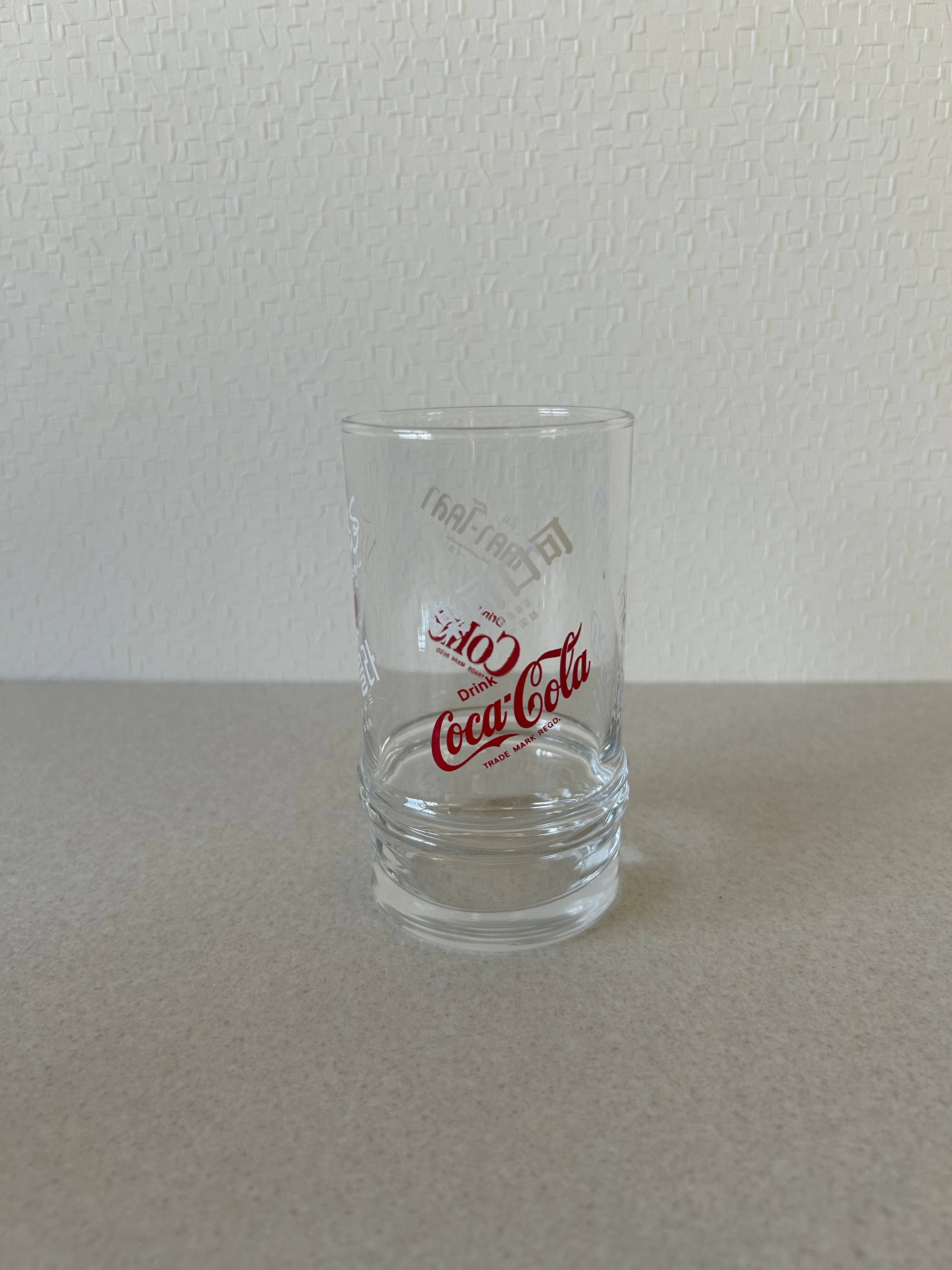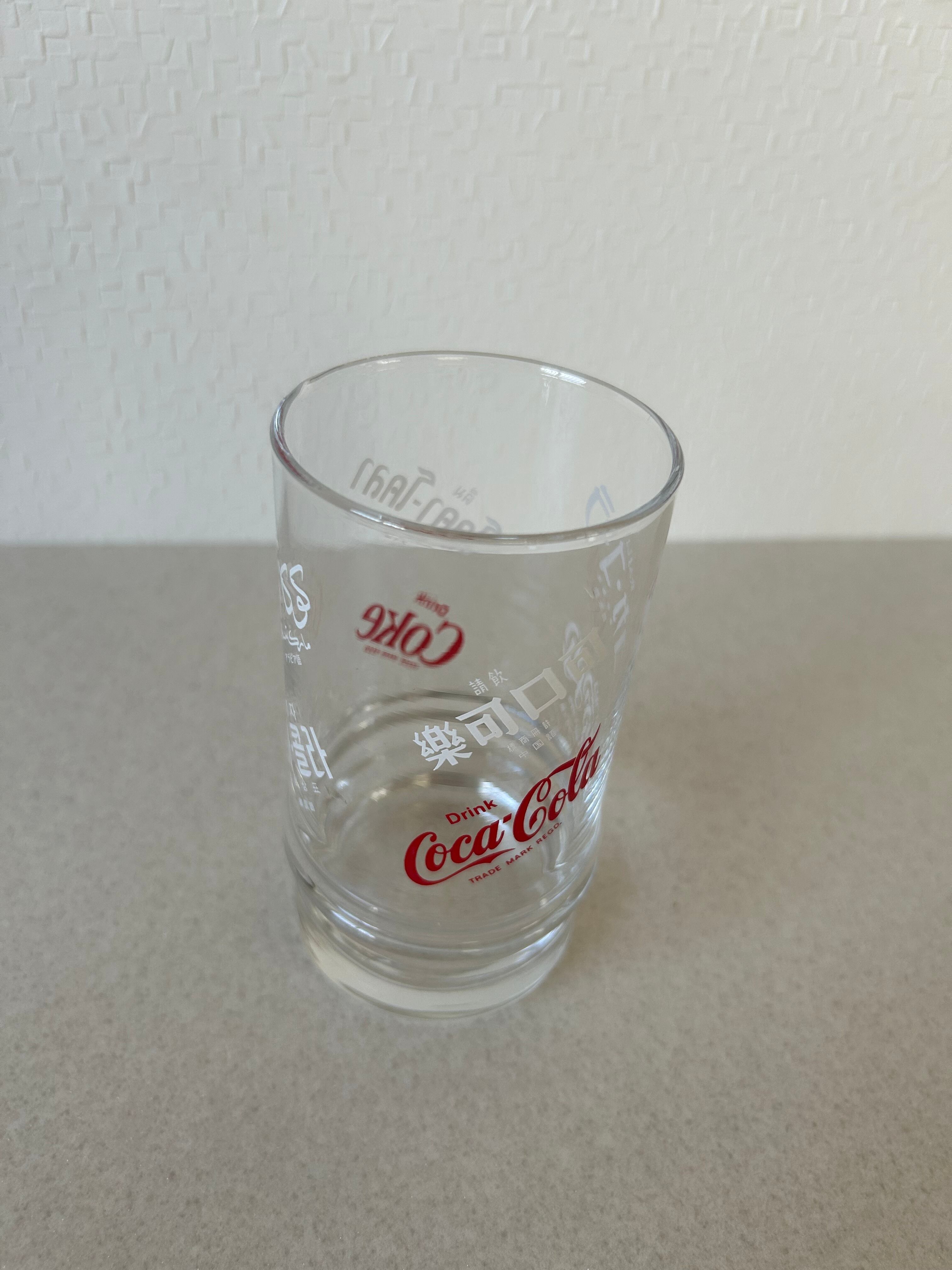 コカコーラの文字が多言語で書かれたガラス製のコップ、タンブラーになります。赤と白でランダムに書かれたデザインが魅力的です。