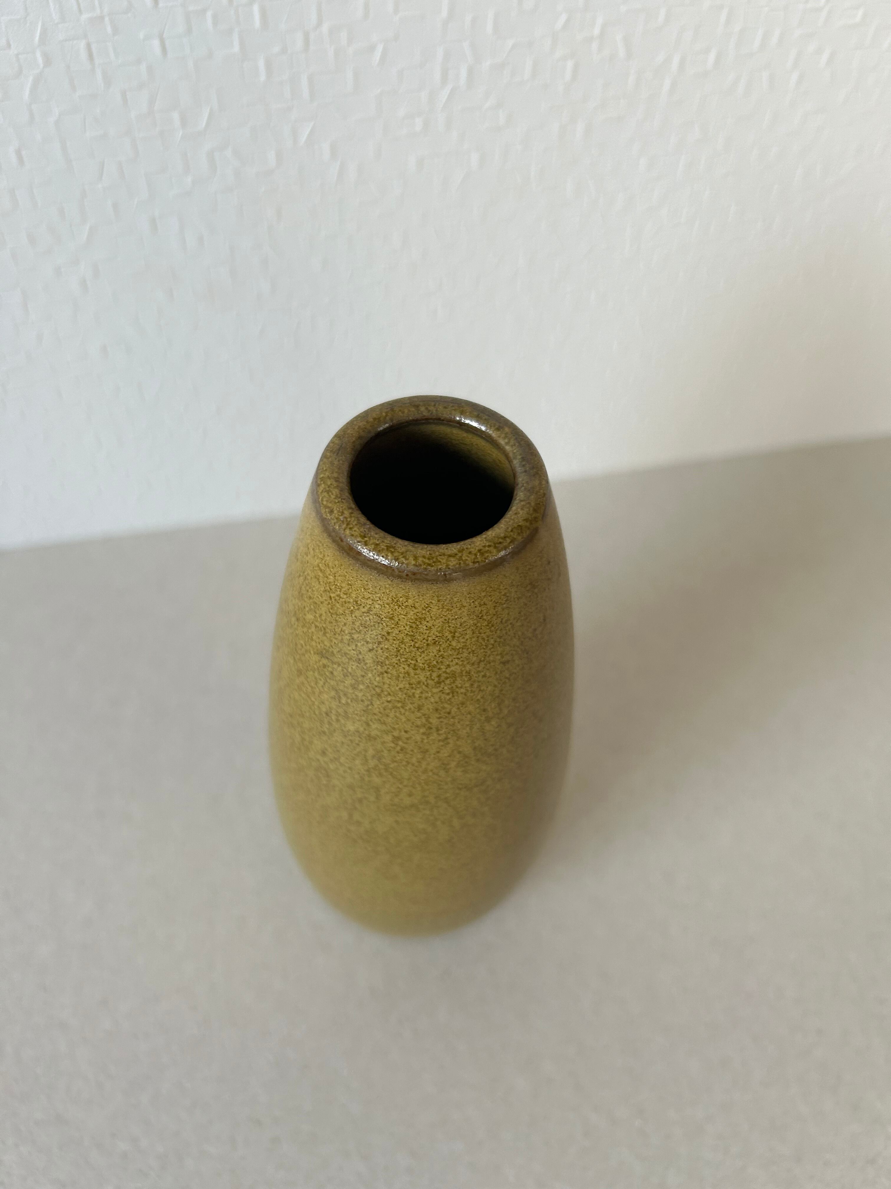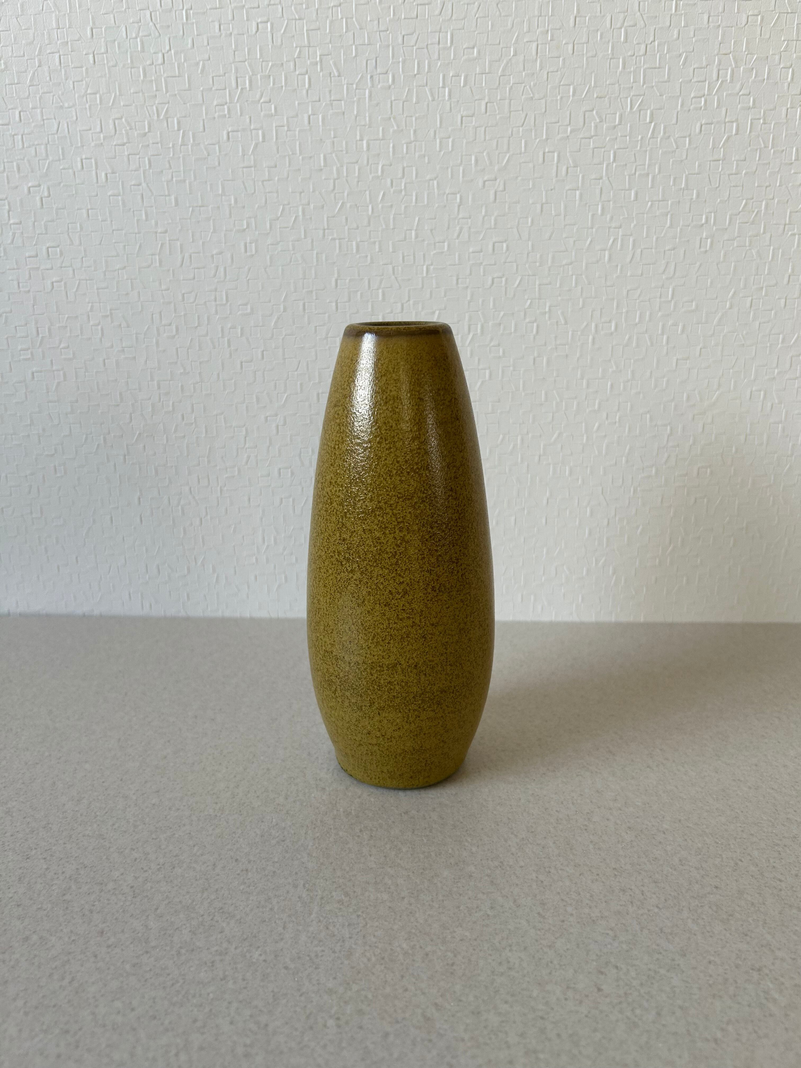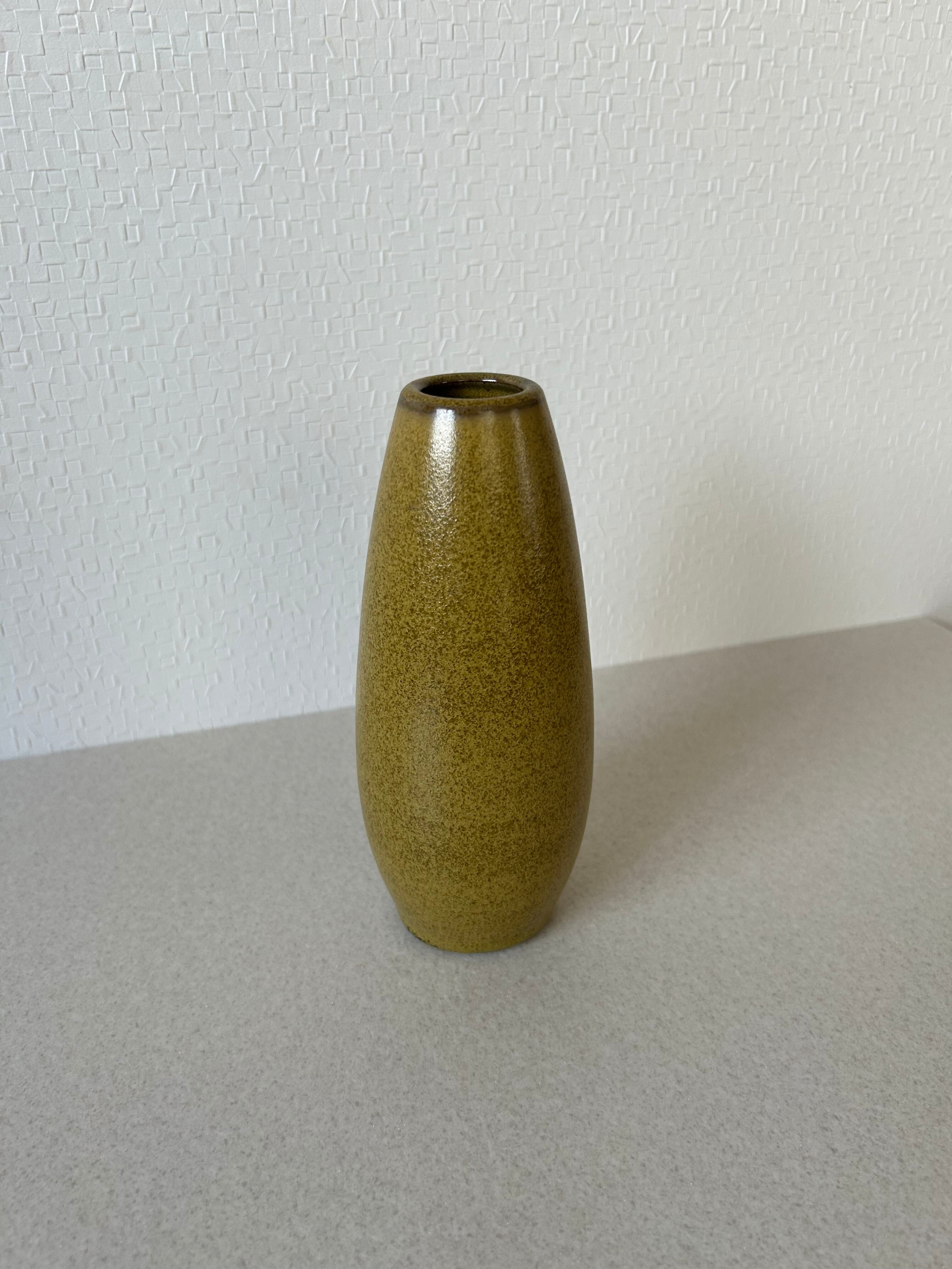 縦に長い楕円形のような形の陶器でできた花器です。