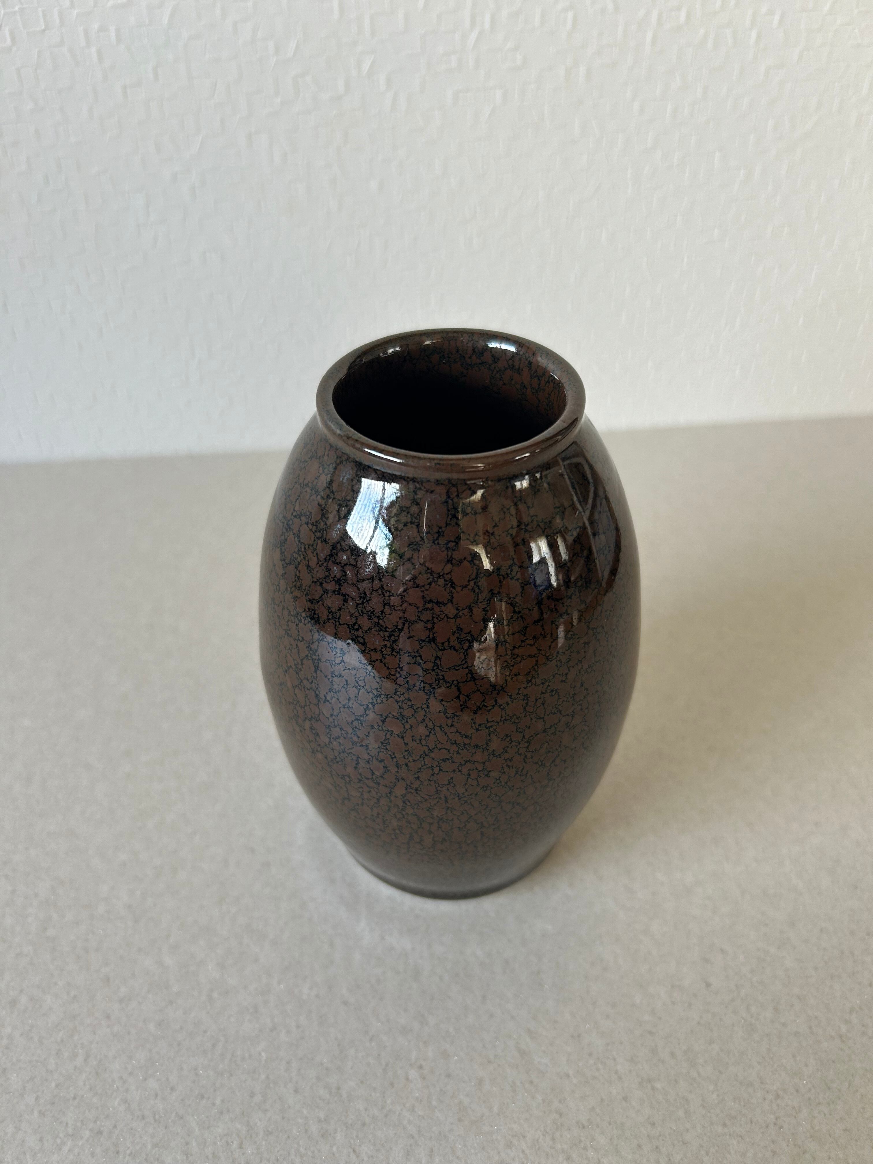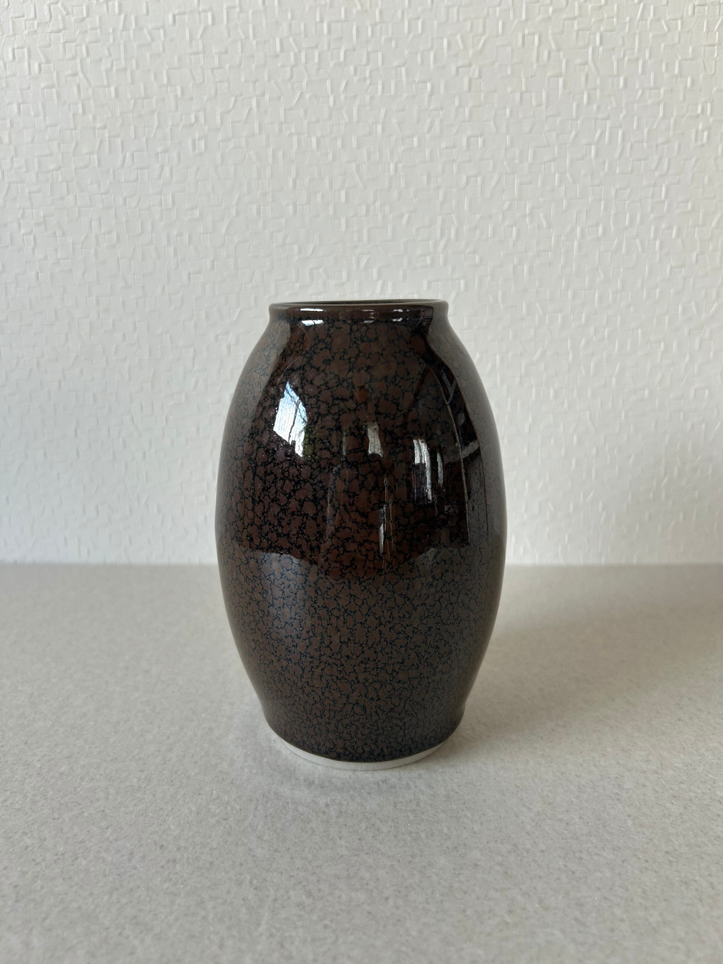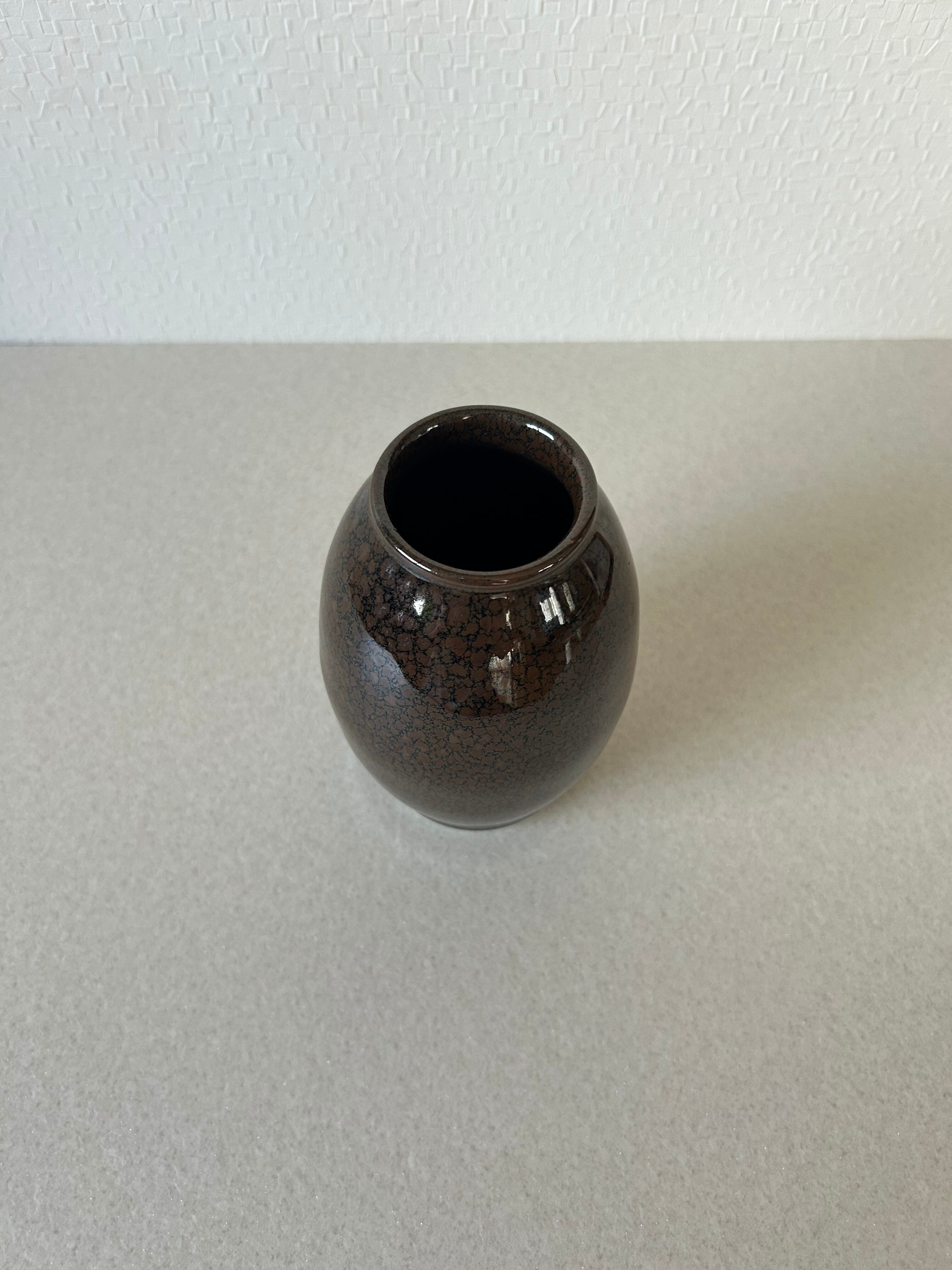 黒地に焦げ茶色の模様がはいった花器です。表面はツヤがあるコーティングがされています。