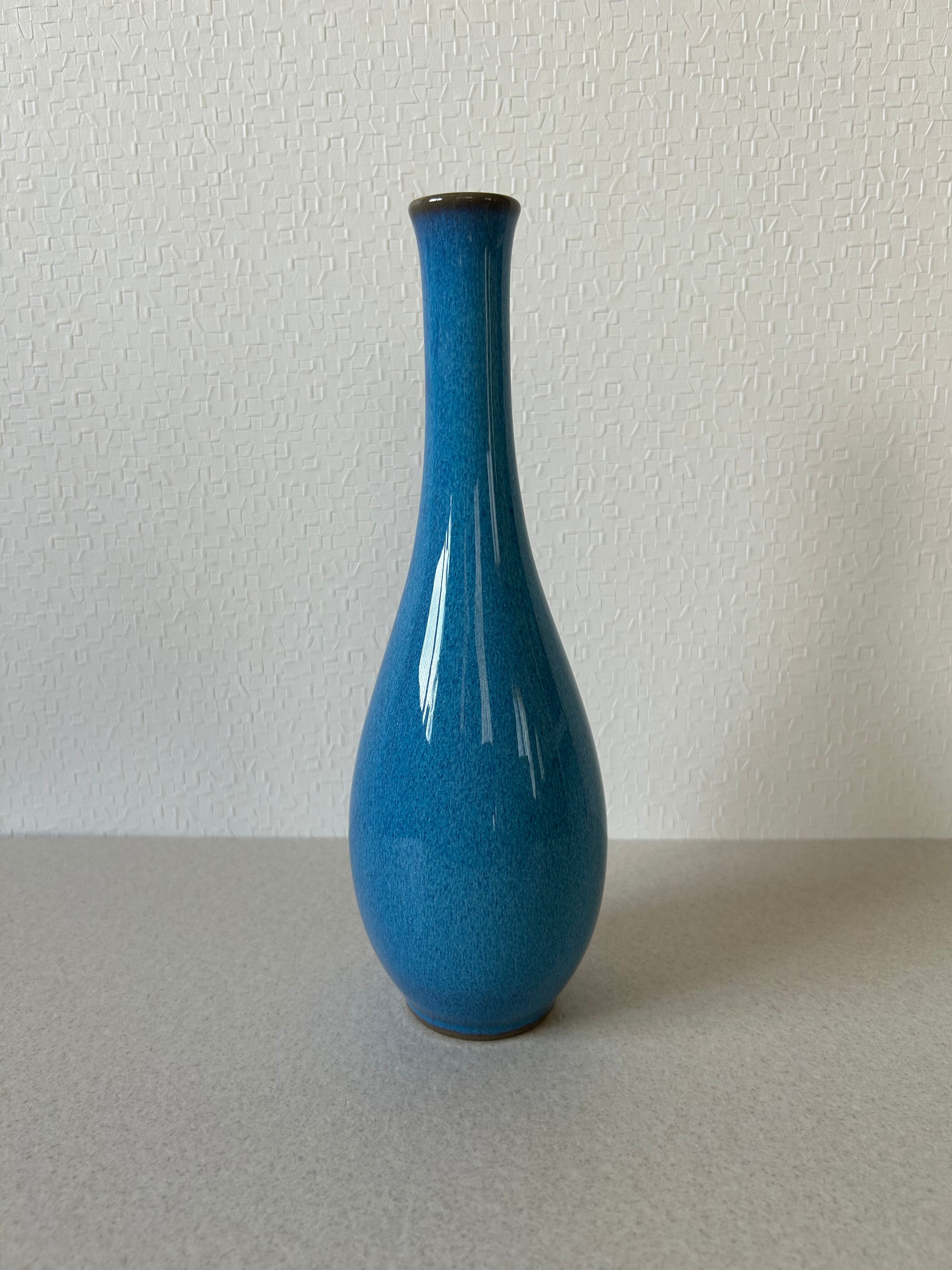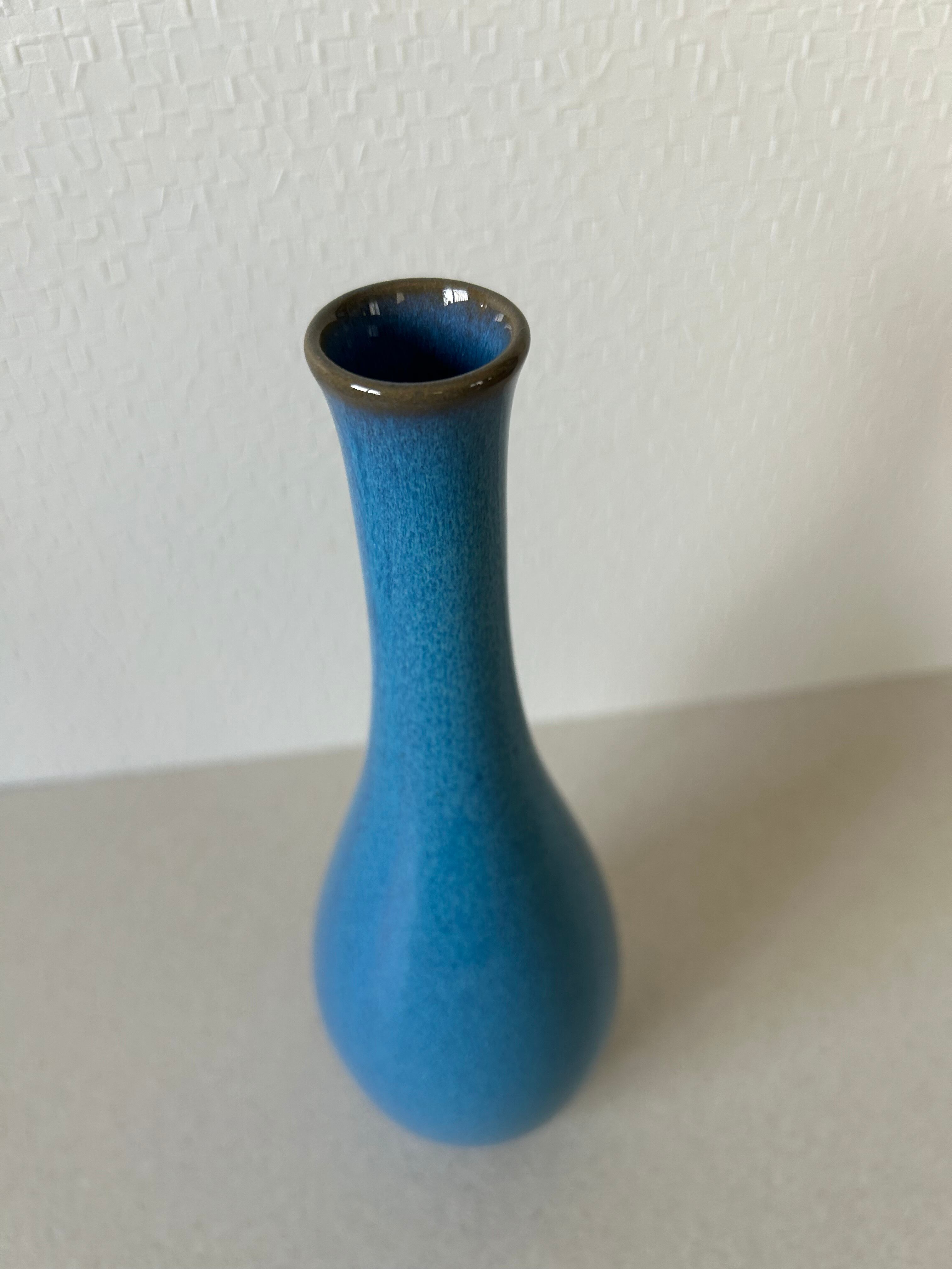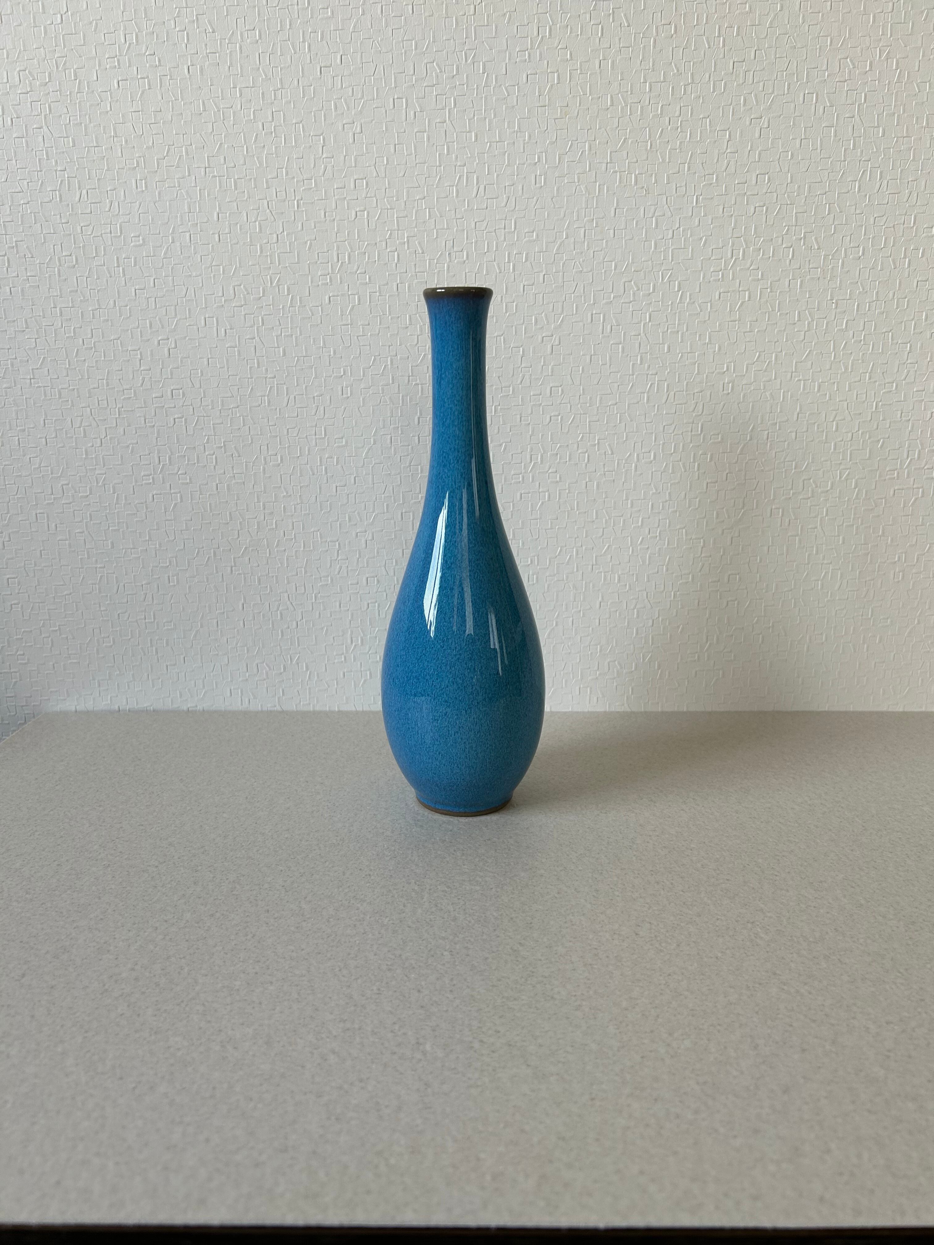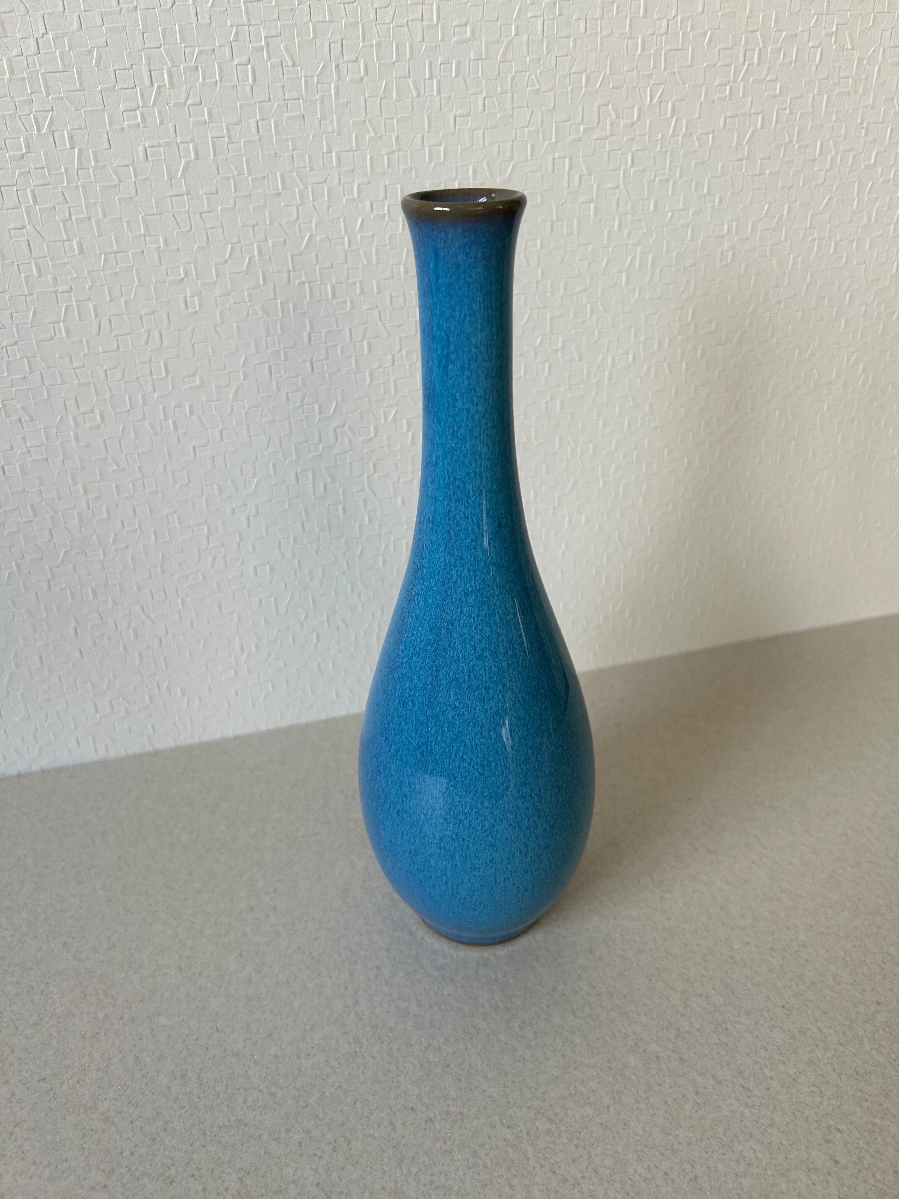 細長く伸びた形の陶器でてきたフラワーベースです。口が広くなく縦長なので、長いお花でも安定して挿すことができます。