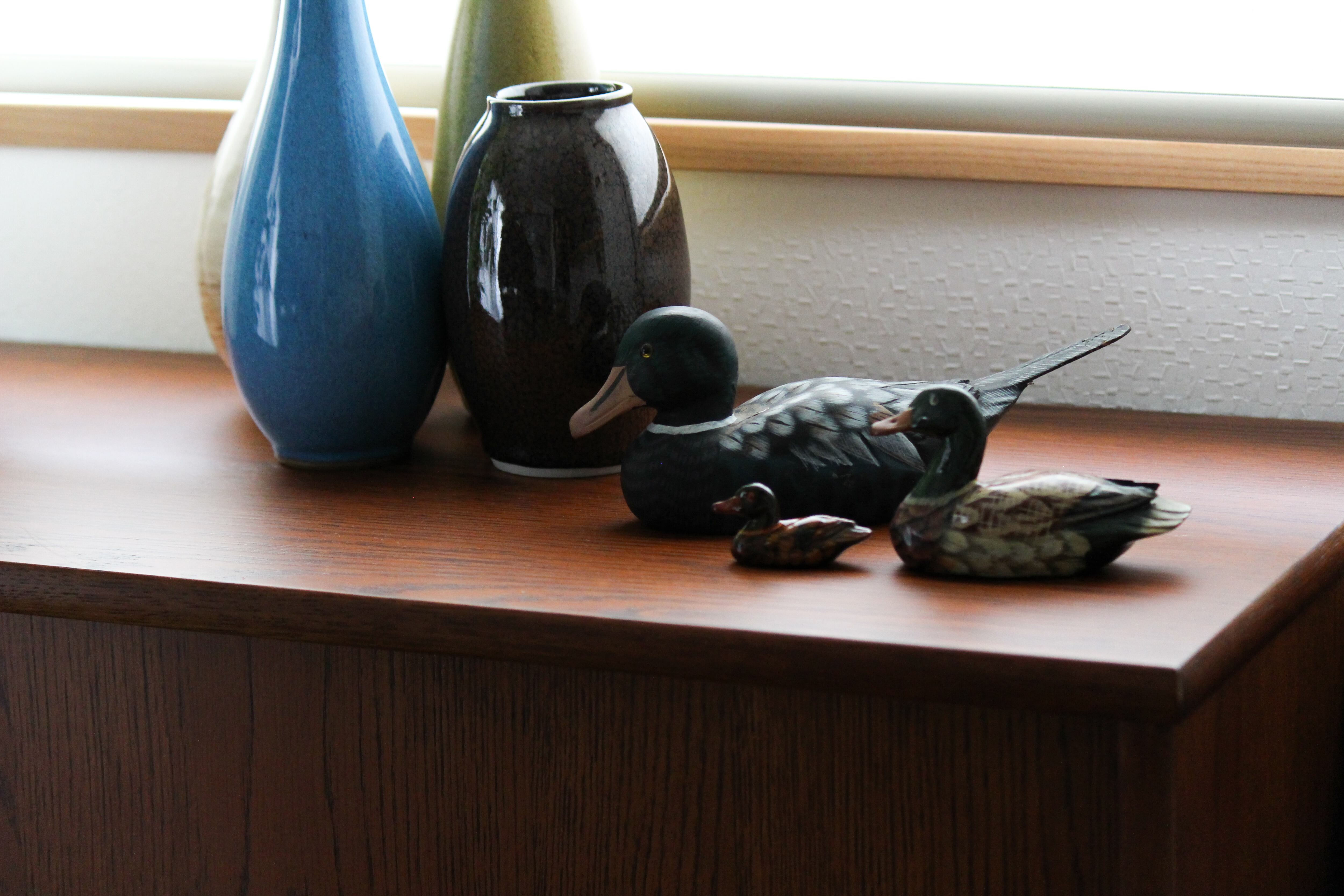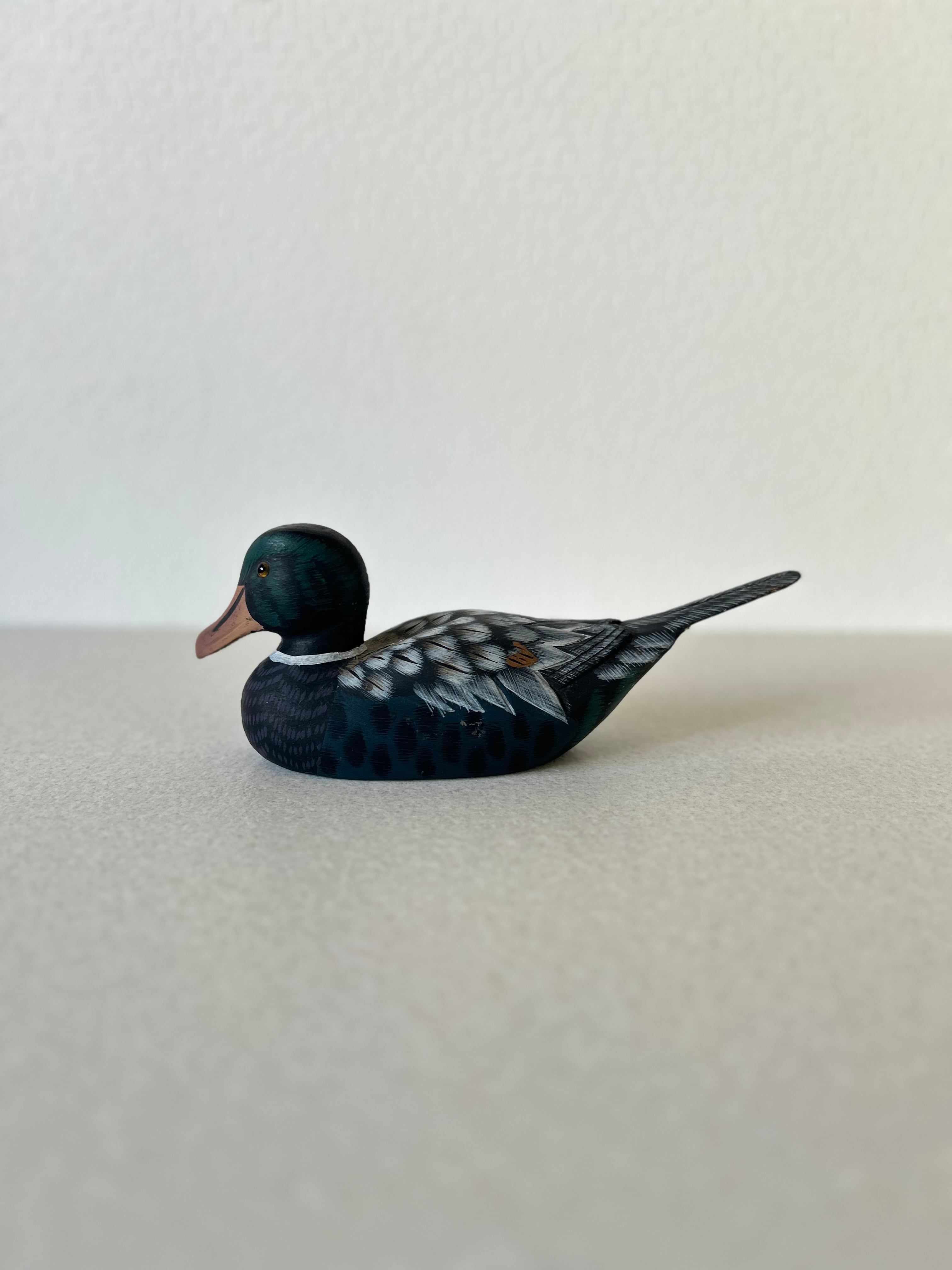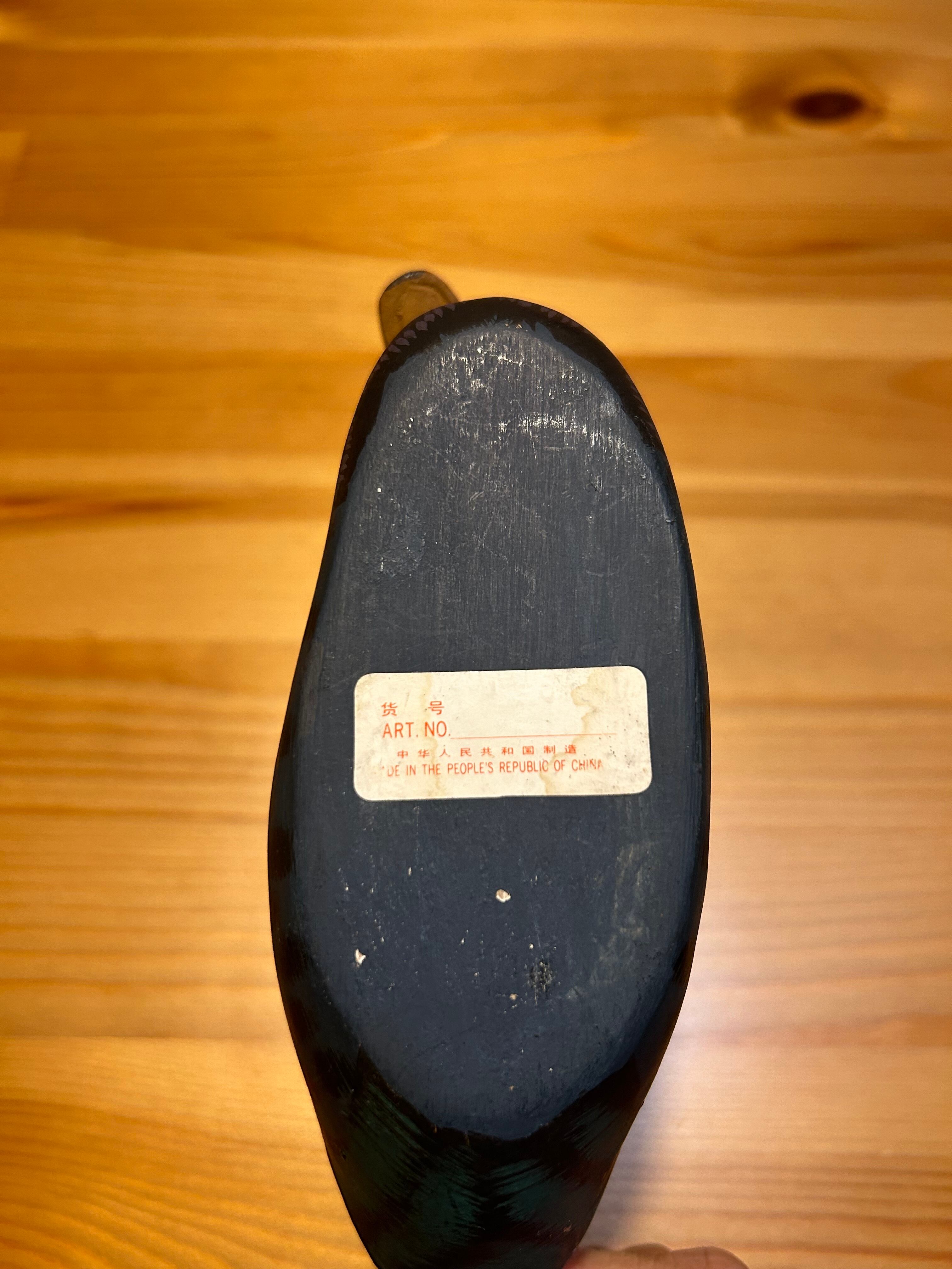 木彫りに塗装された鴨の置き物になります。深緑、黒、紫などの落ち着いたら色で塗装されています。