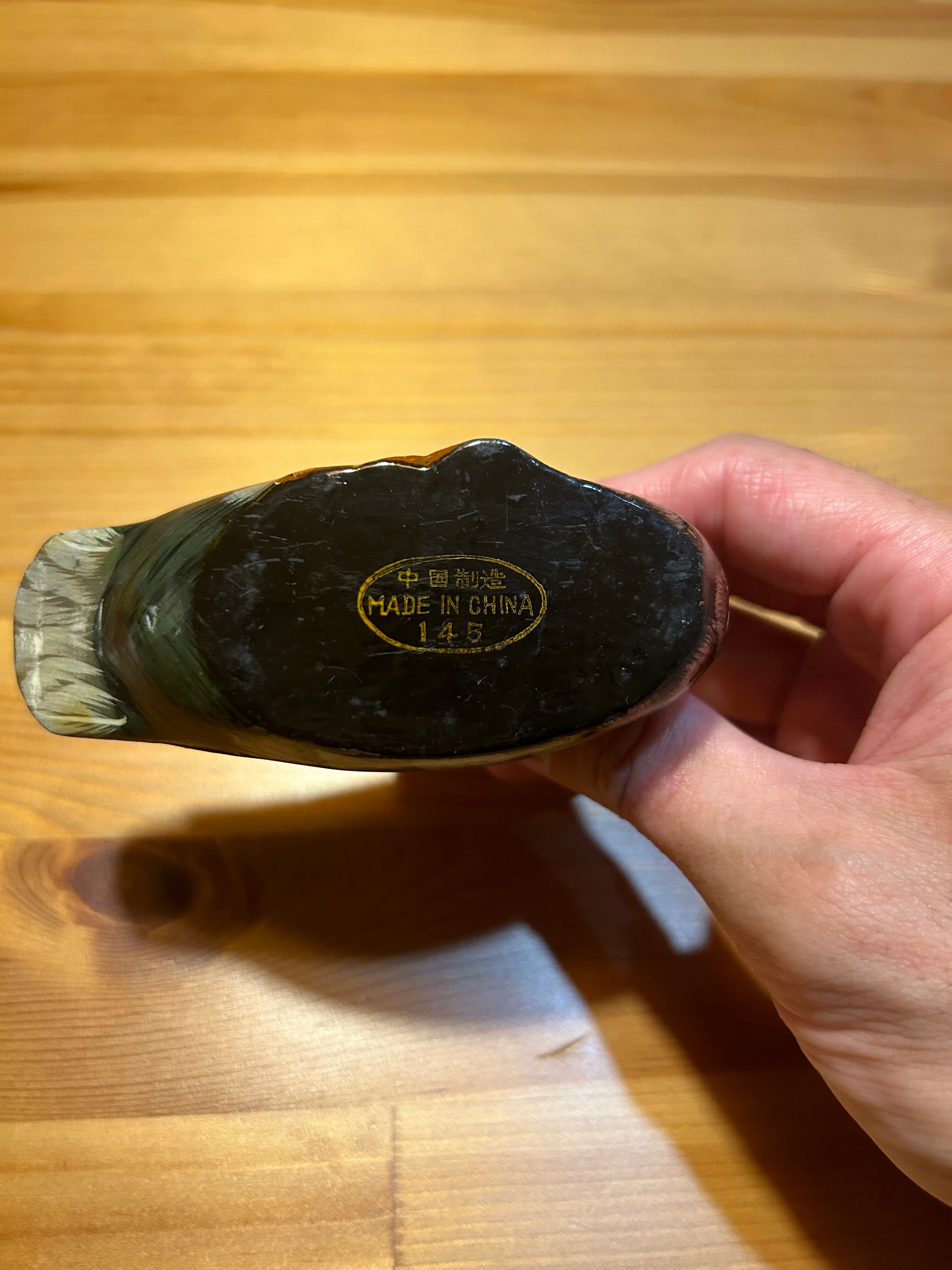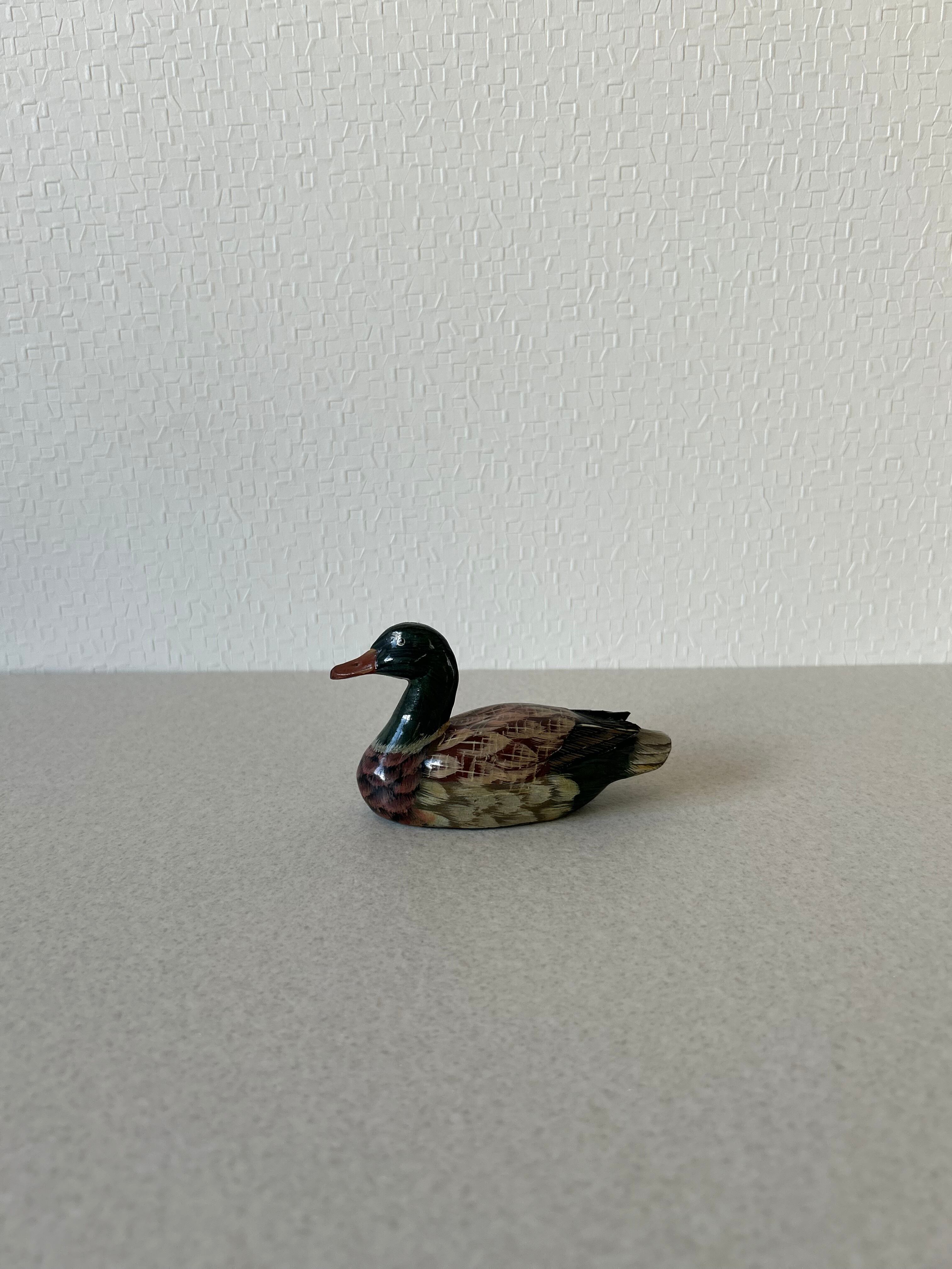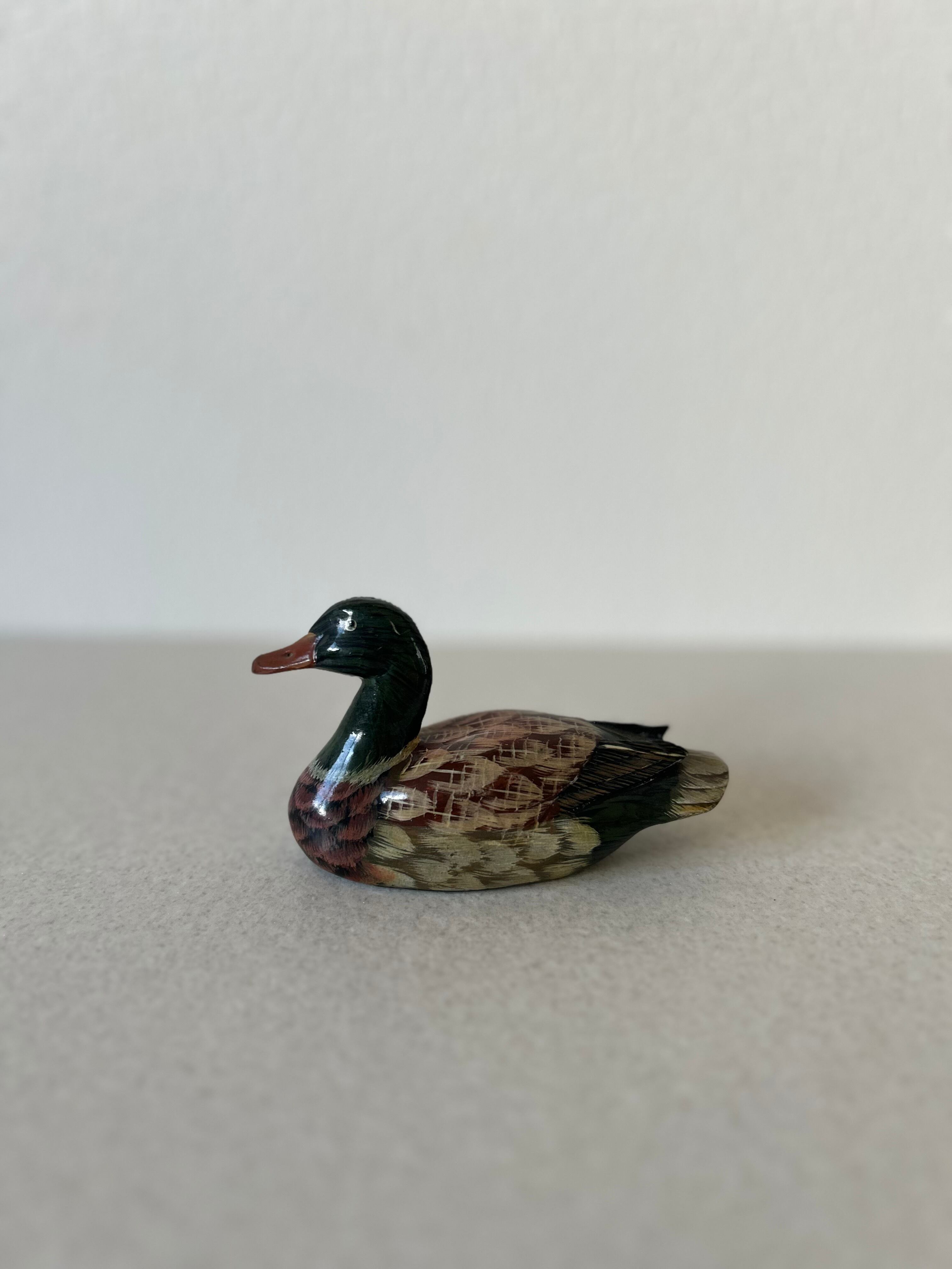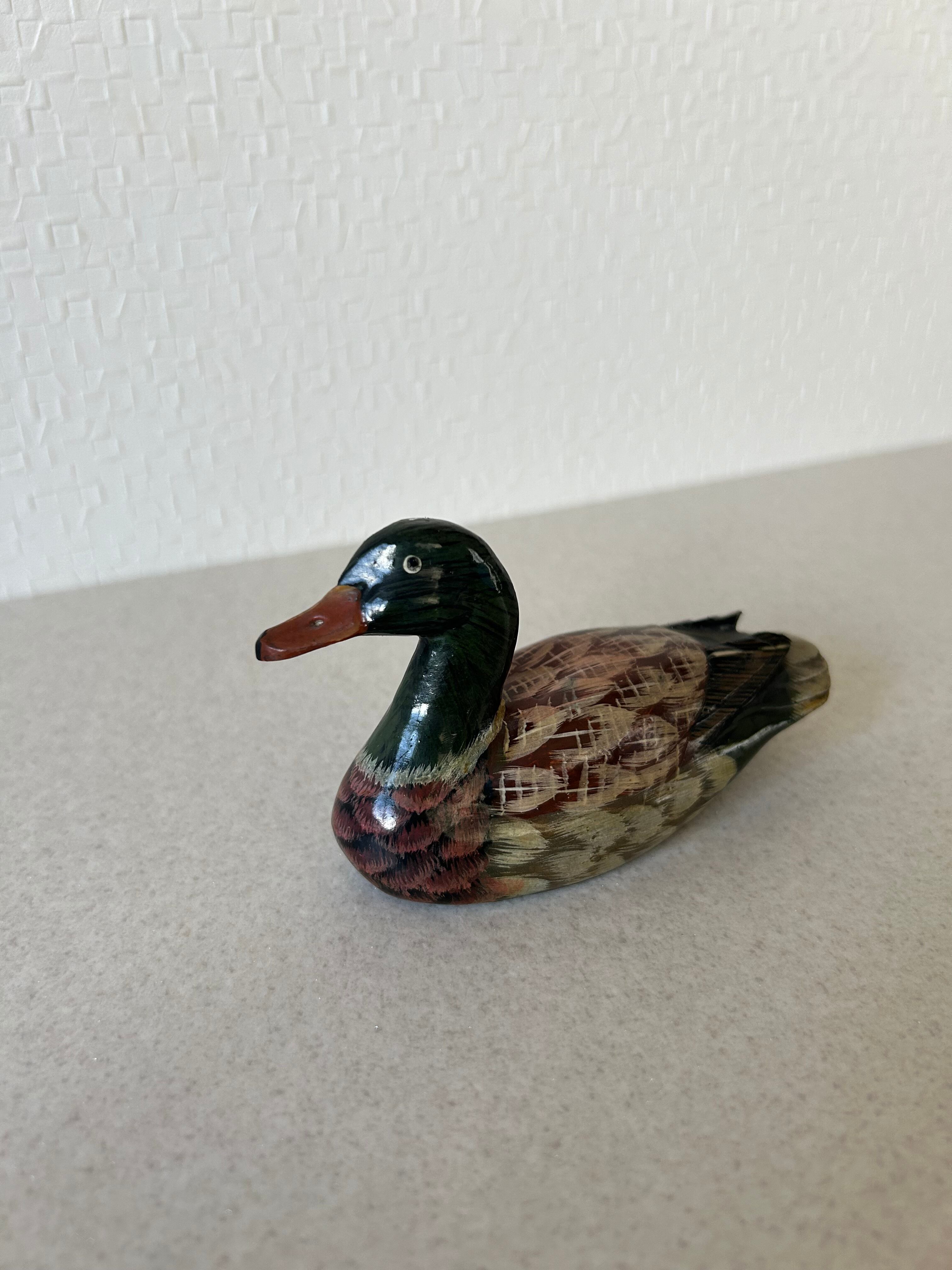 木彫りでできた鴨の置き物になります。表面は少し艶のある仕上げがされています。