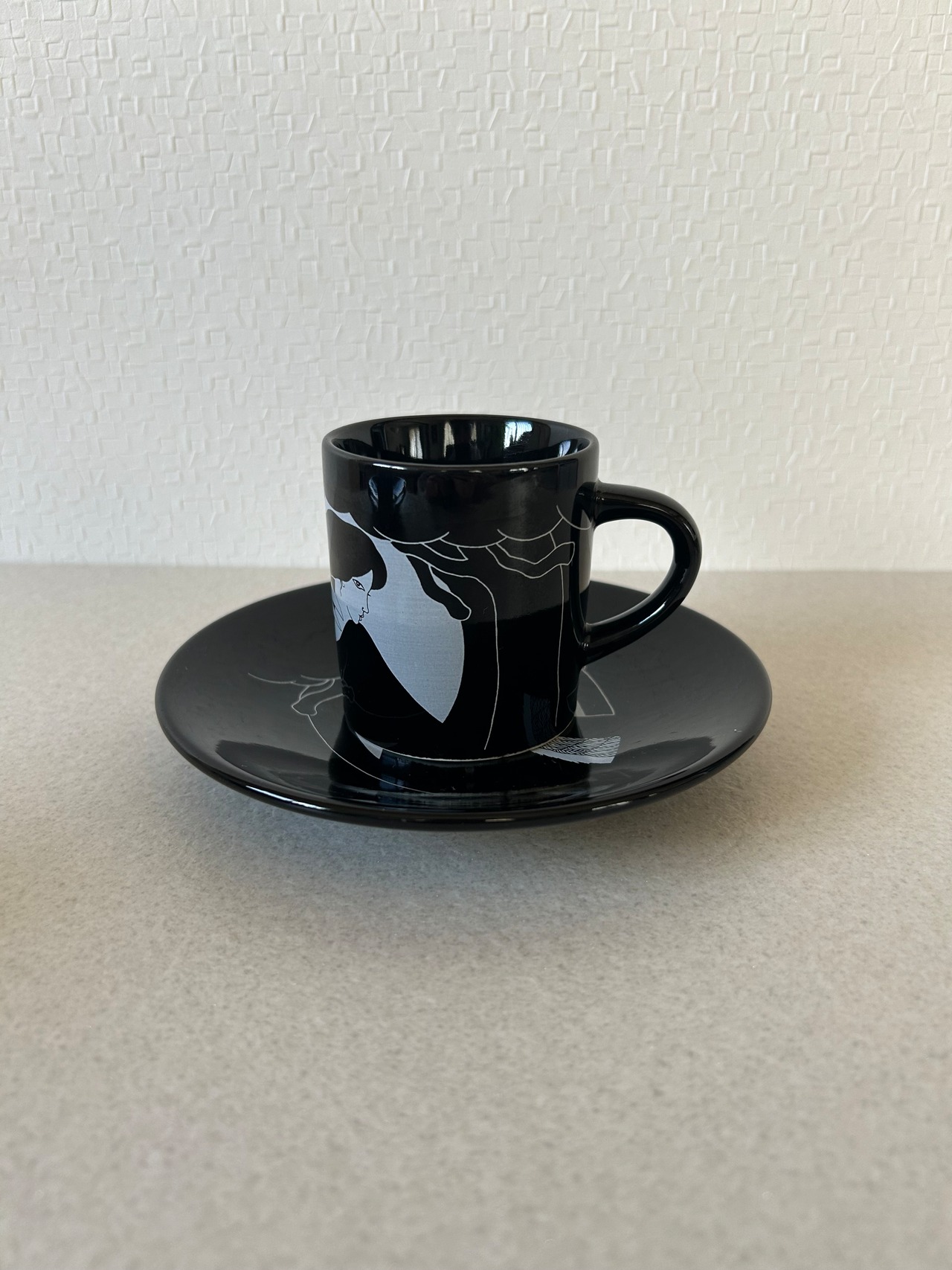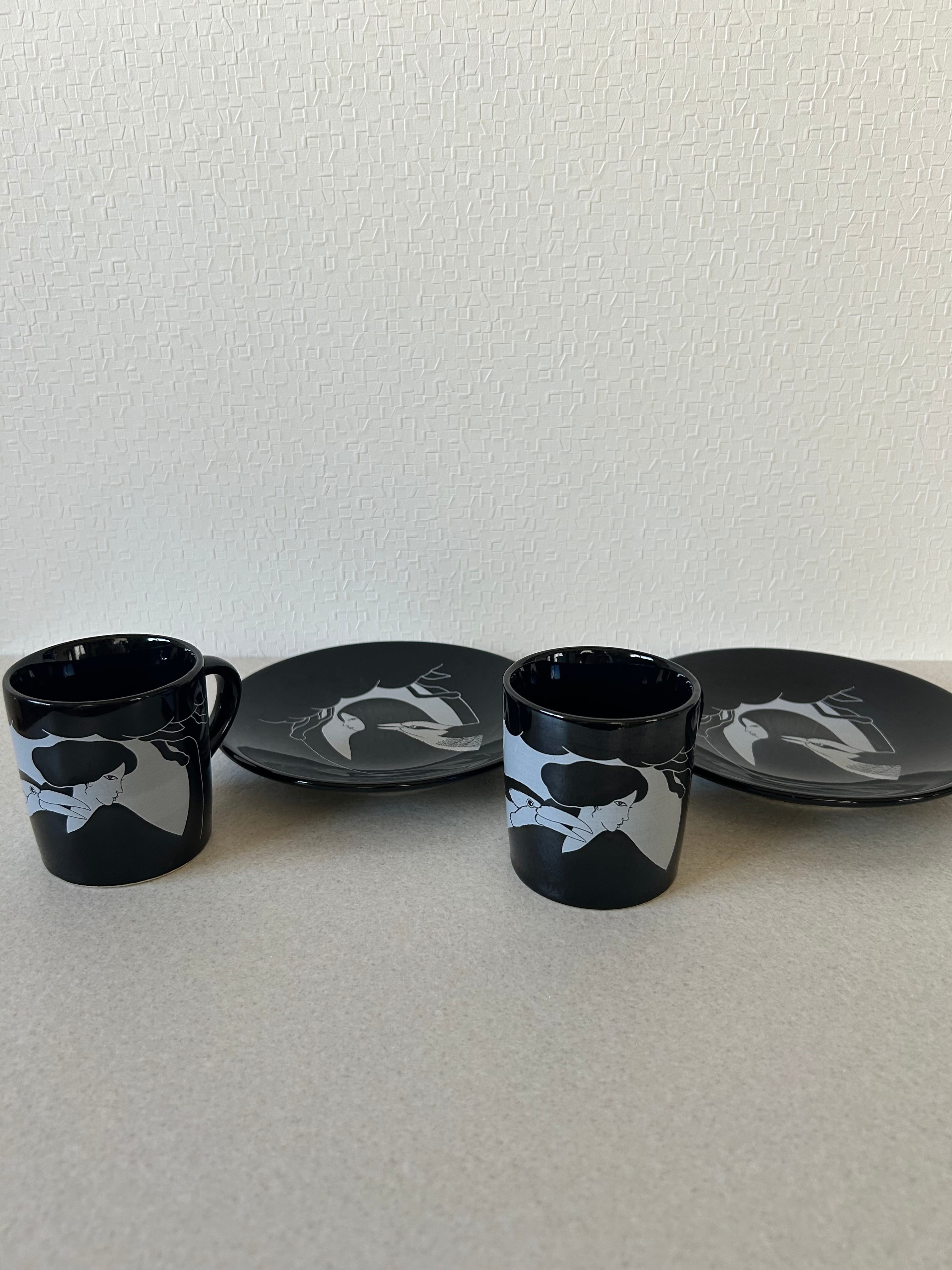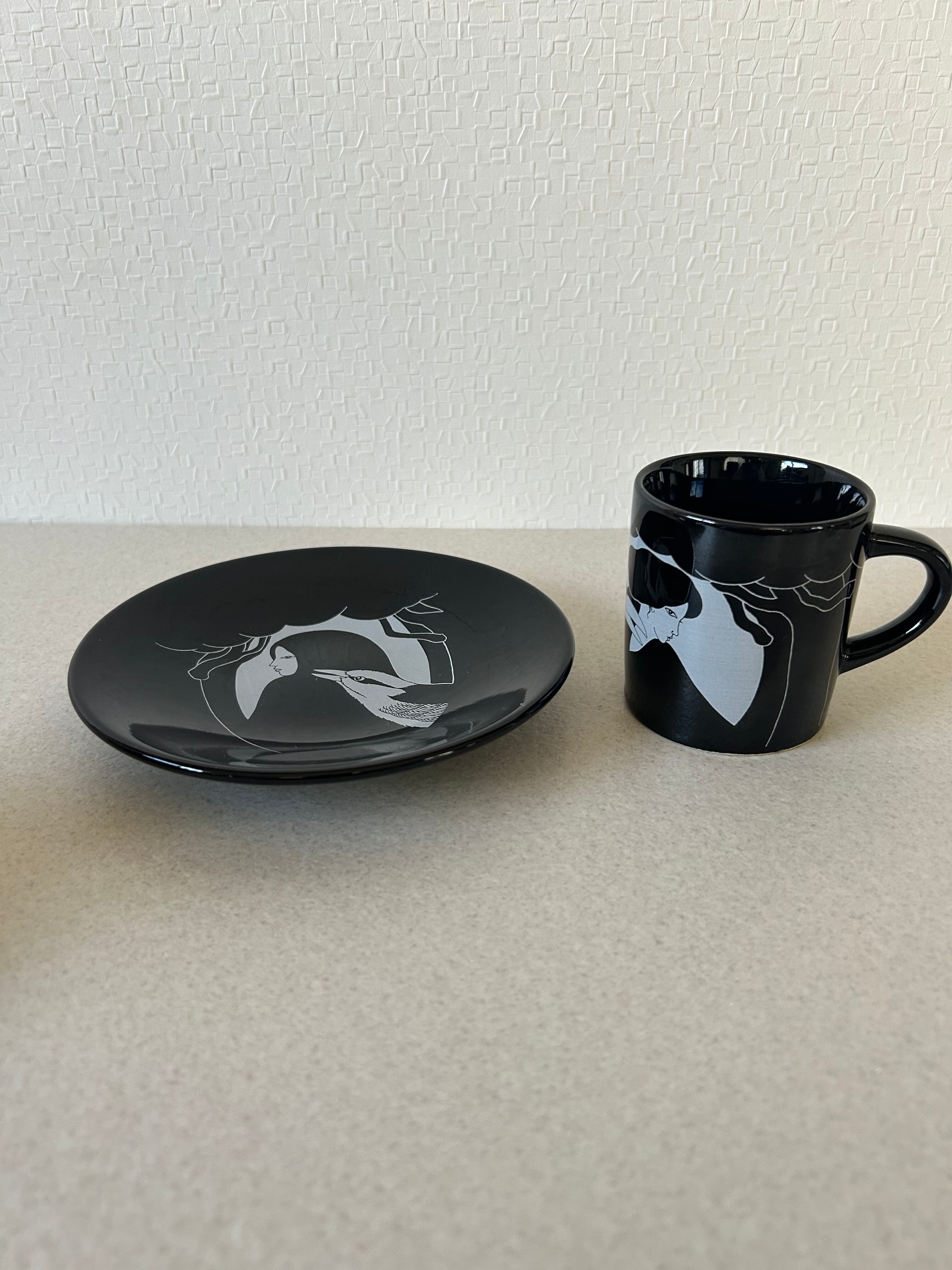女性と鳥が描かれています。モノトーンでアート絵画のような上品な雰囲気の食器です。