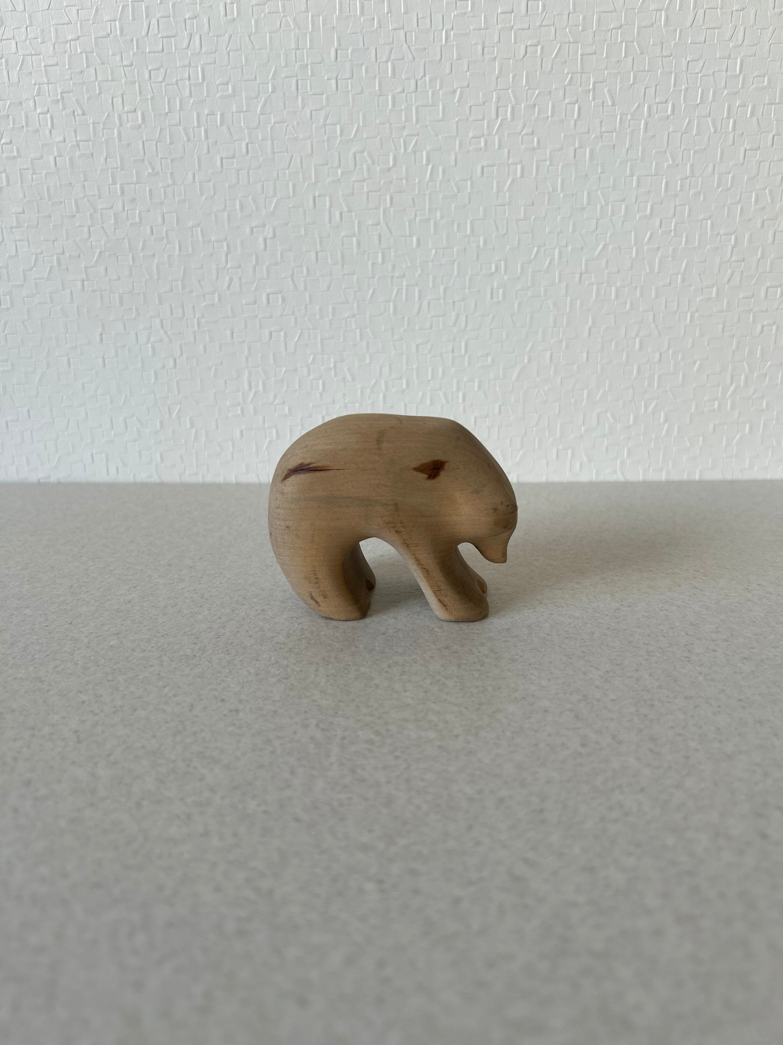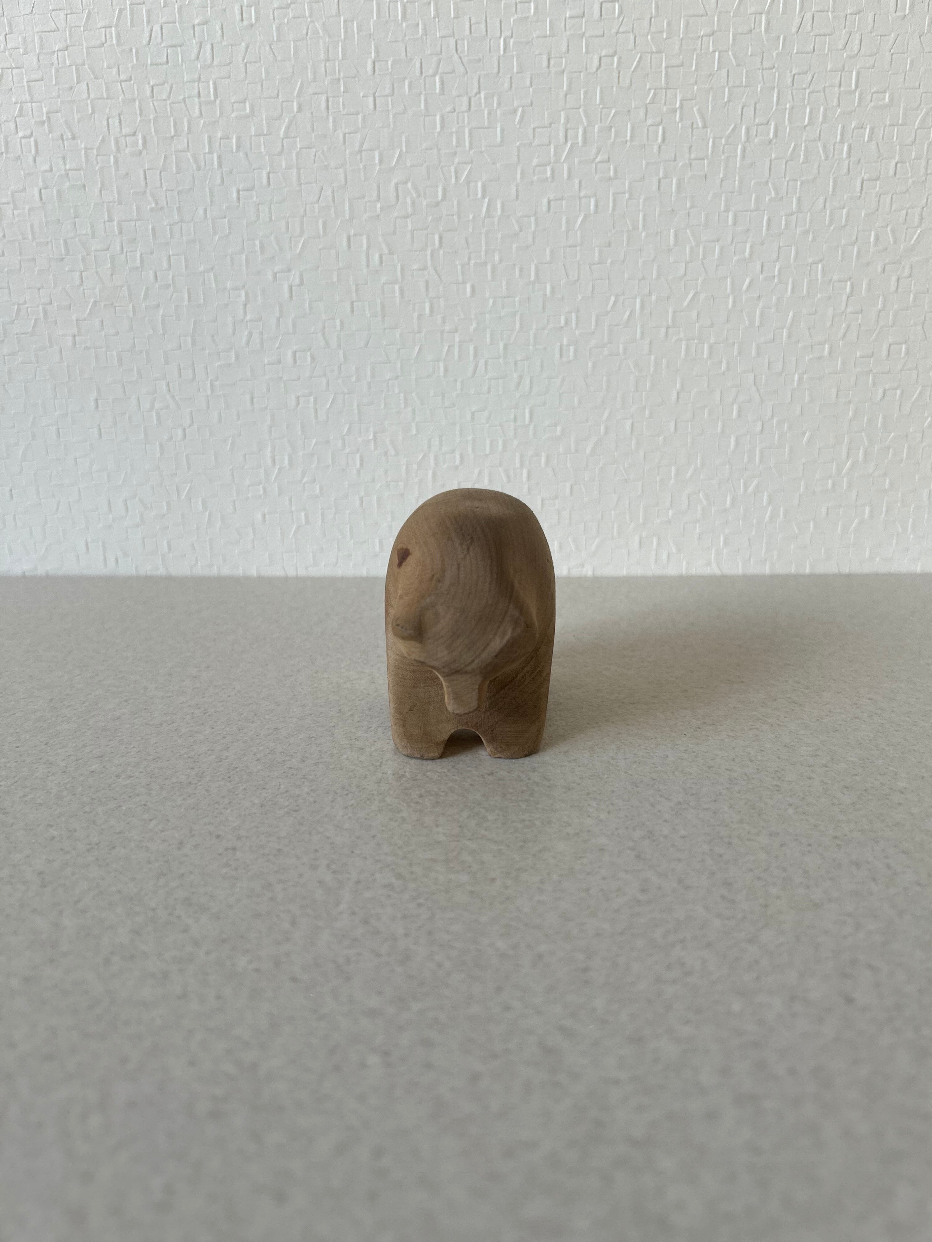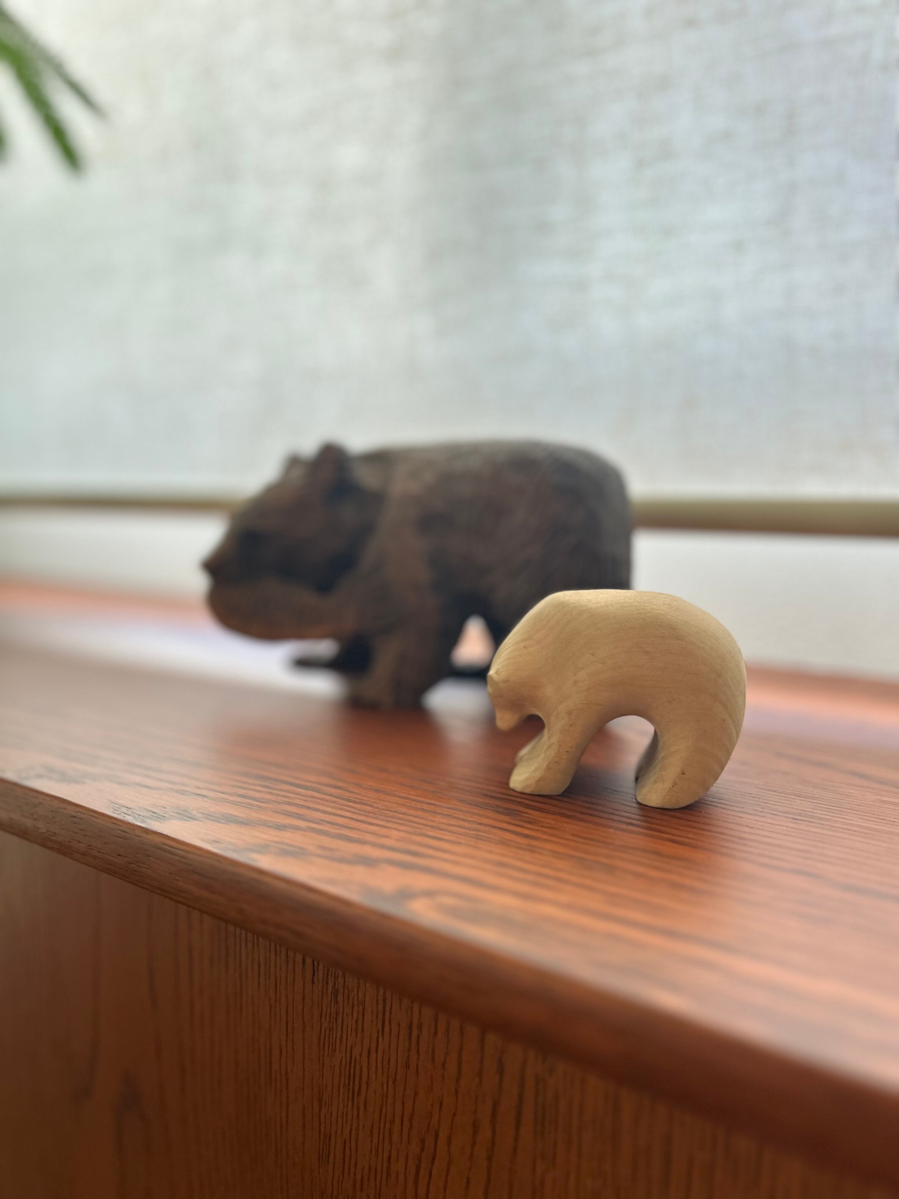 熊の木彫りになります。熊の木彫りと言えば、荒々しく迫力あるものが多いと思われますが、これは丸っこい姿が可愛らしいデザインです。