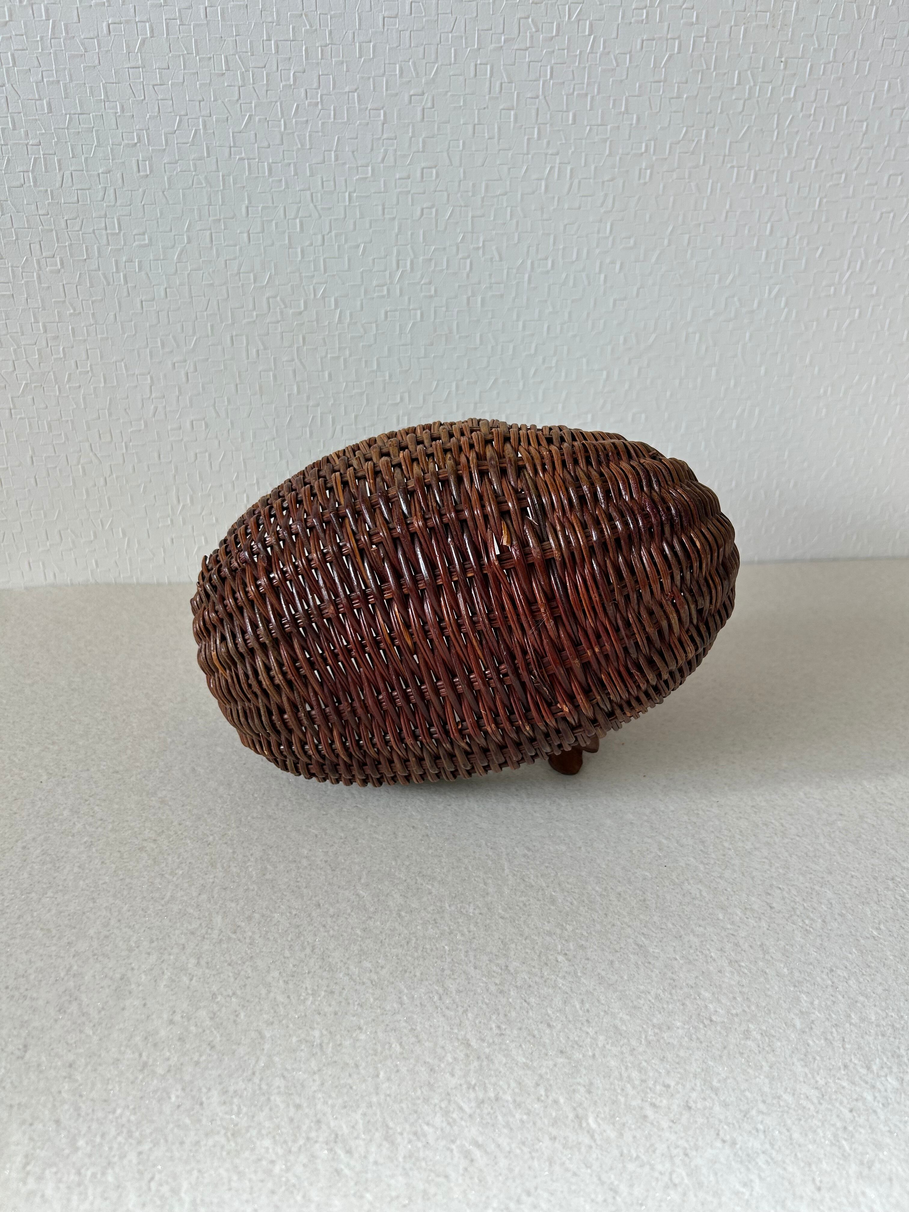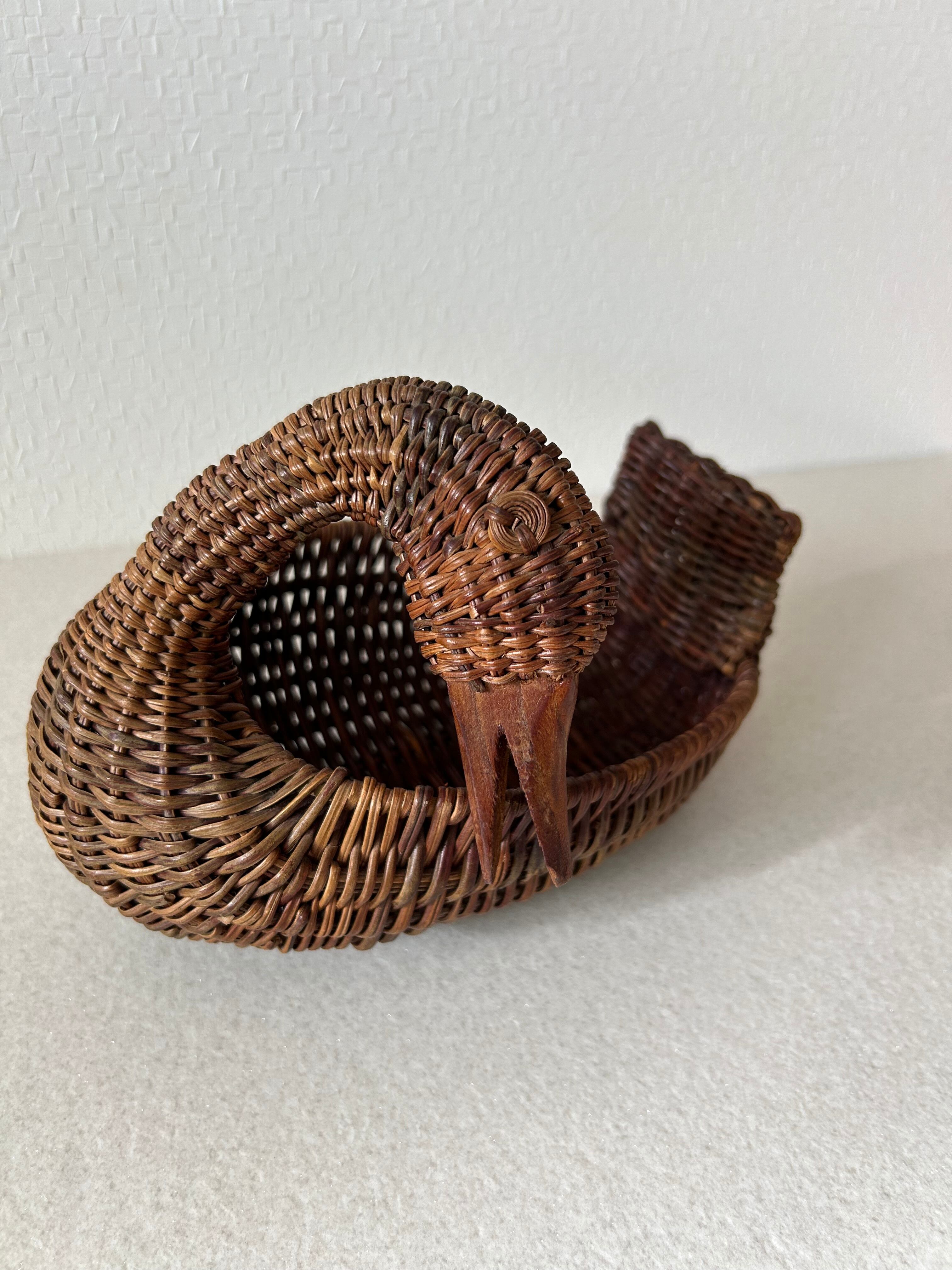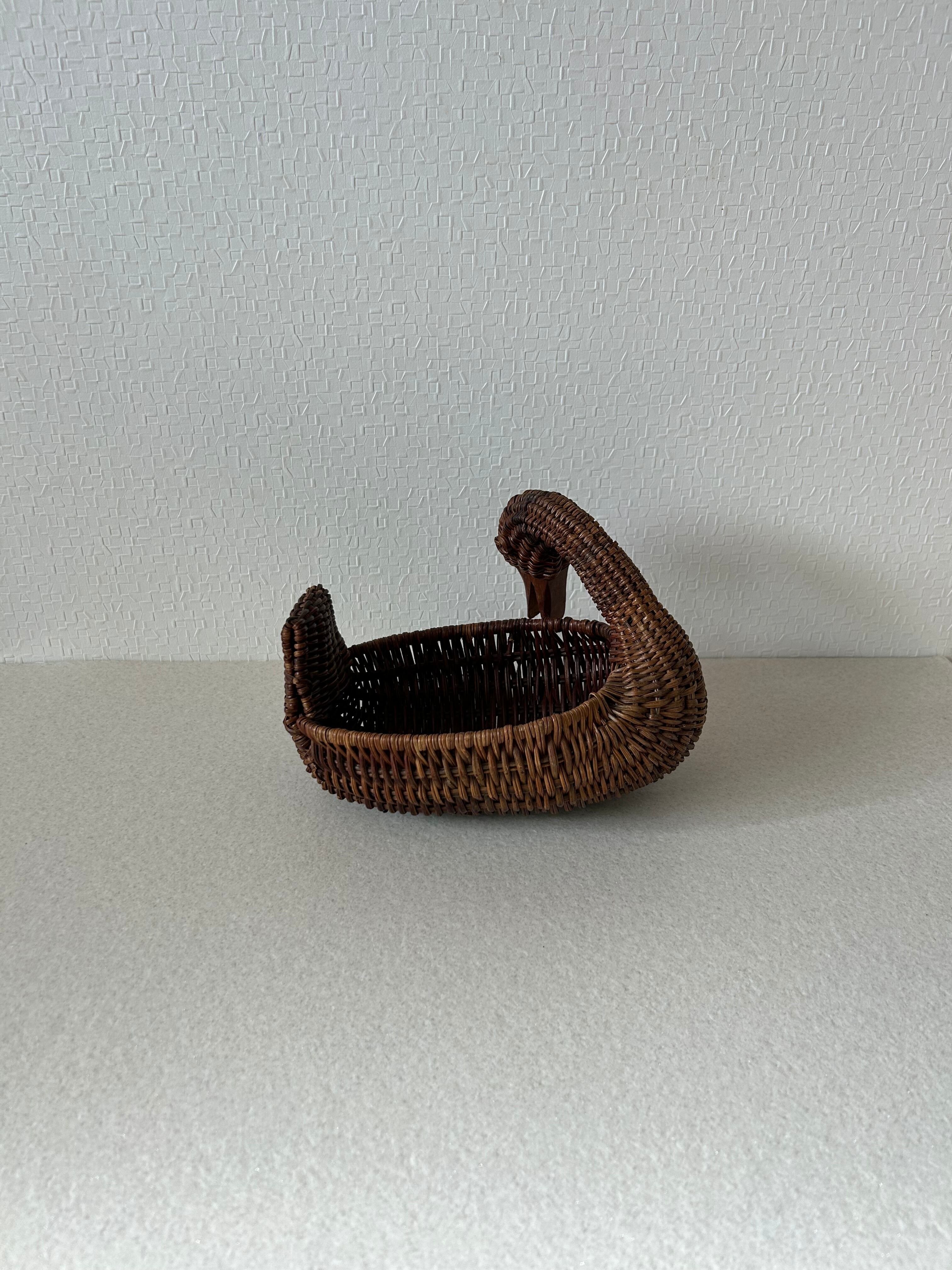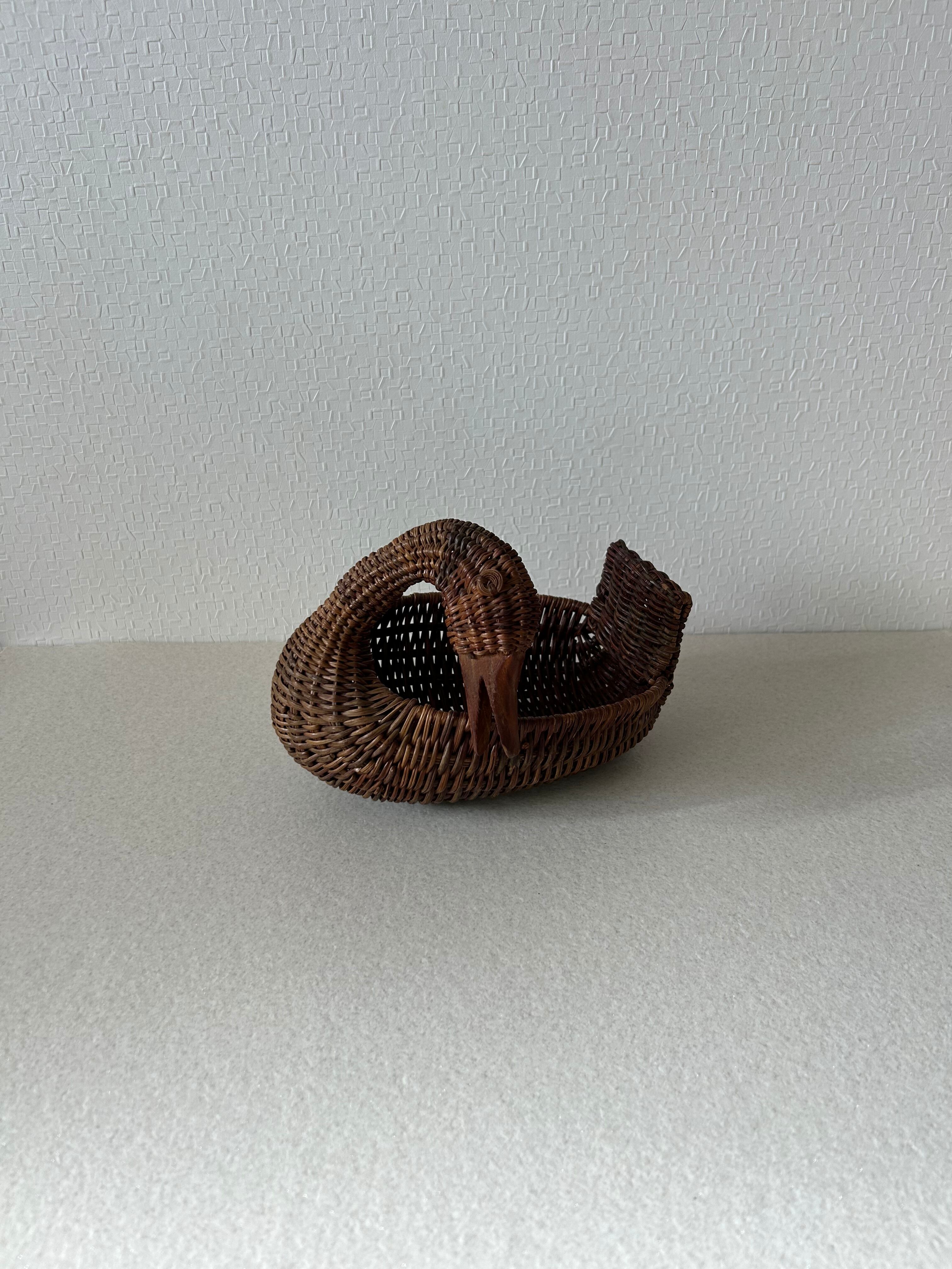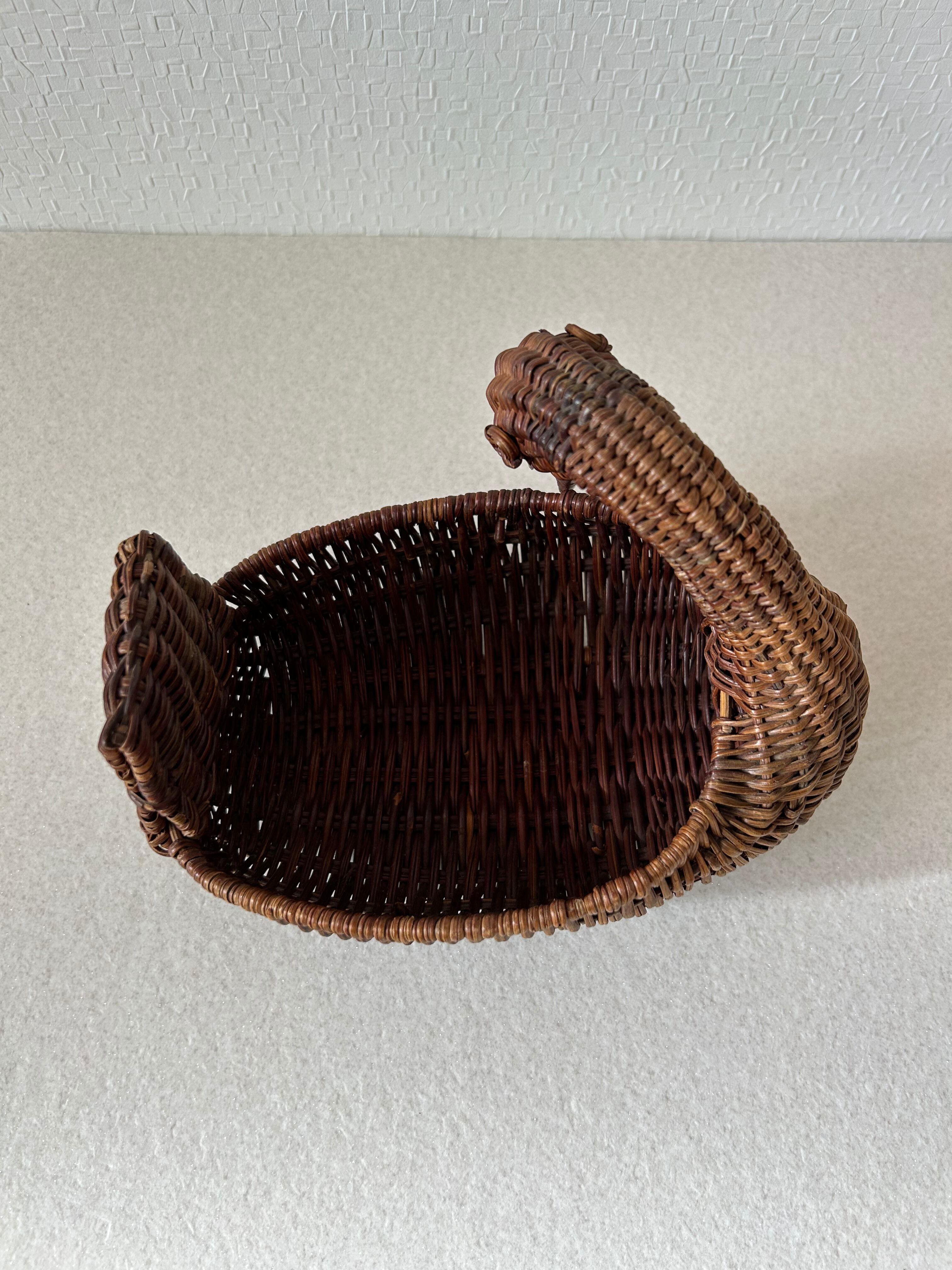 鴨モチーフの籐製の籠。先日ご紹介した商品より少し大きめのサイズ。また首がくるっと巻いているのも特徴的です。
