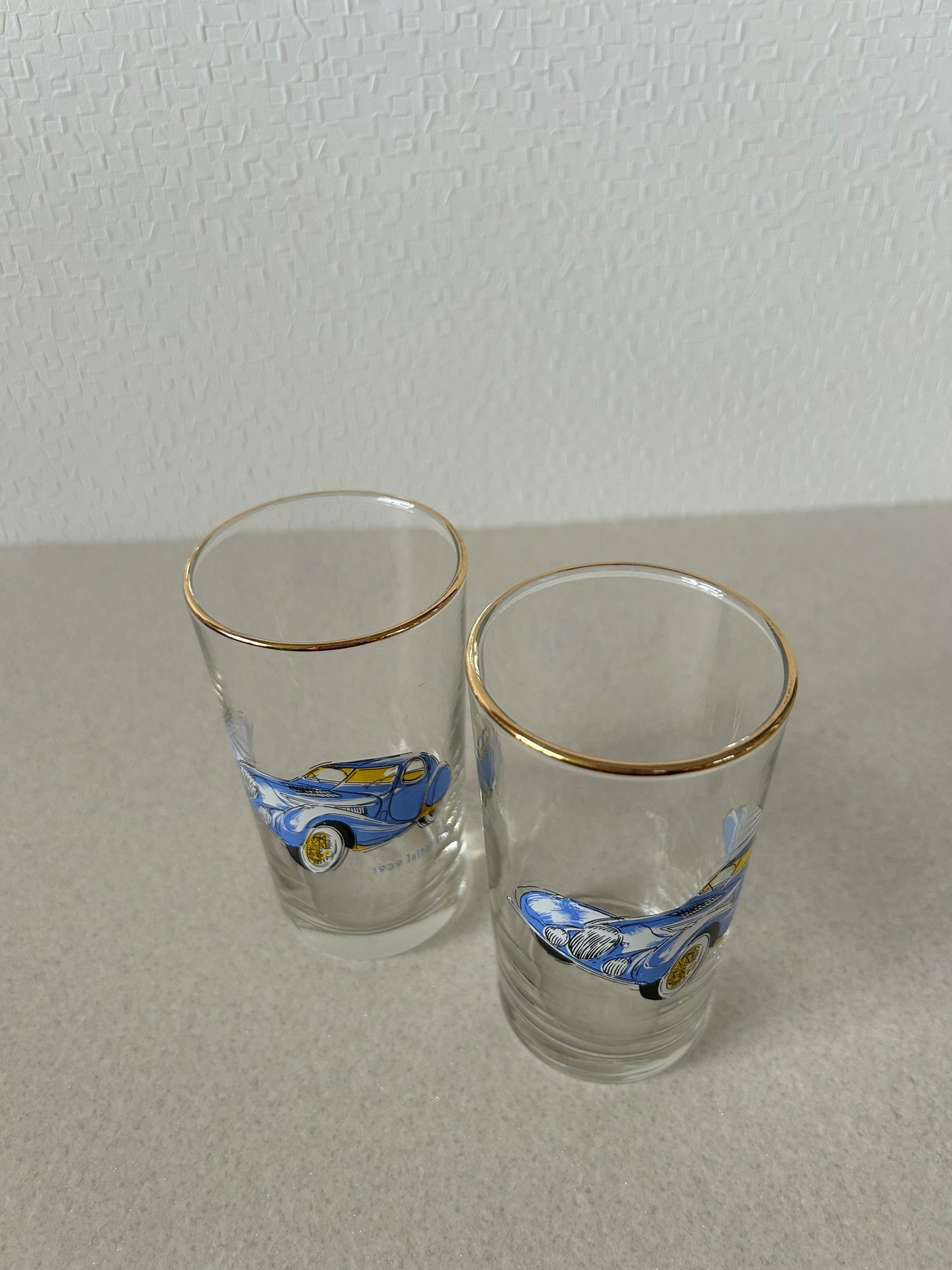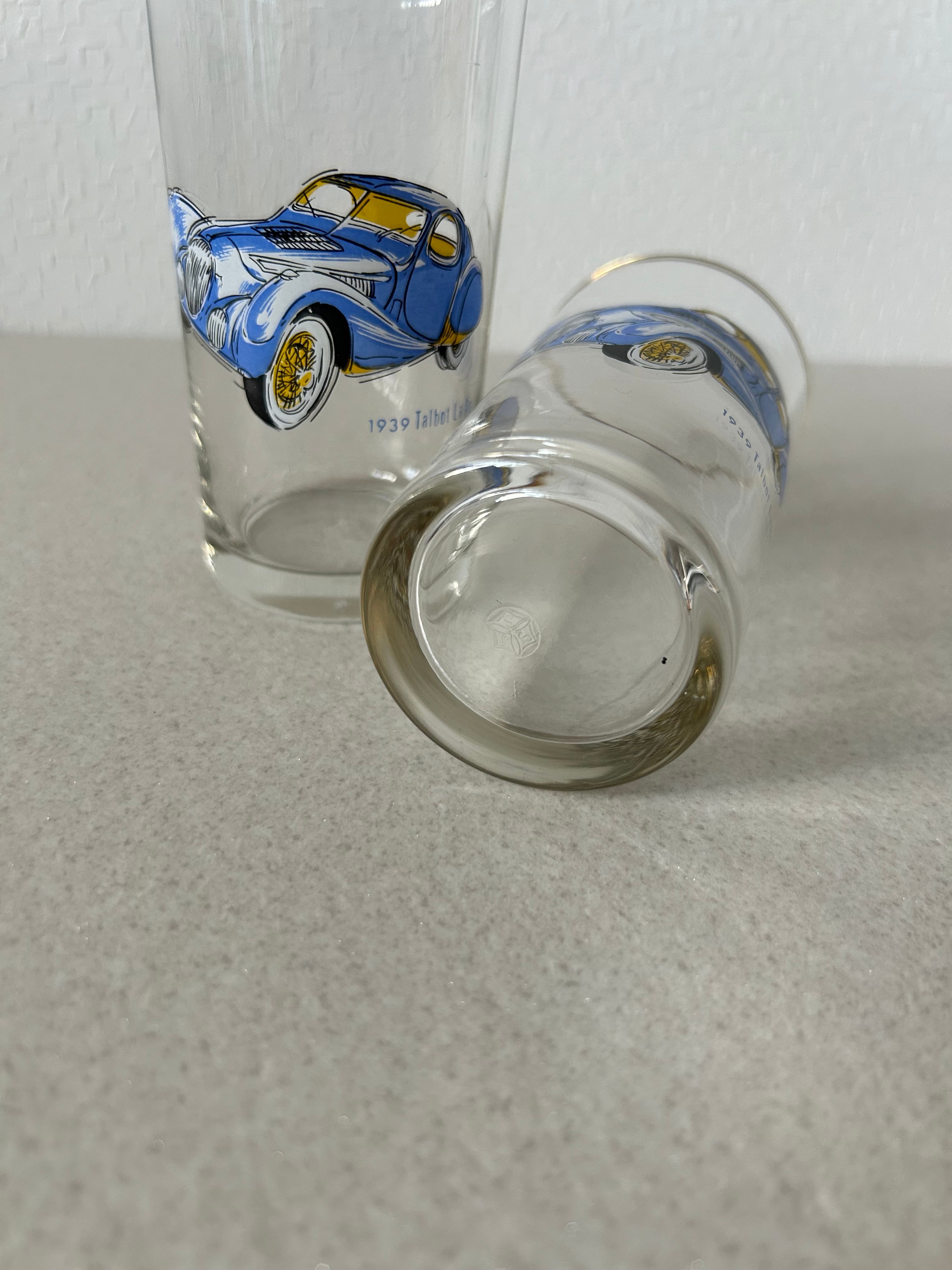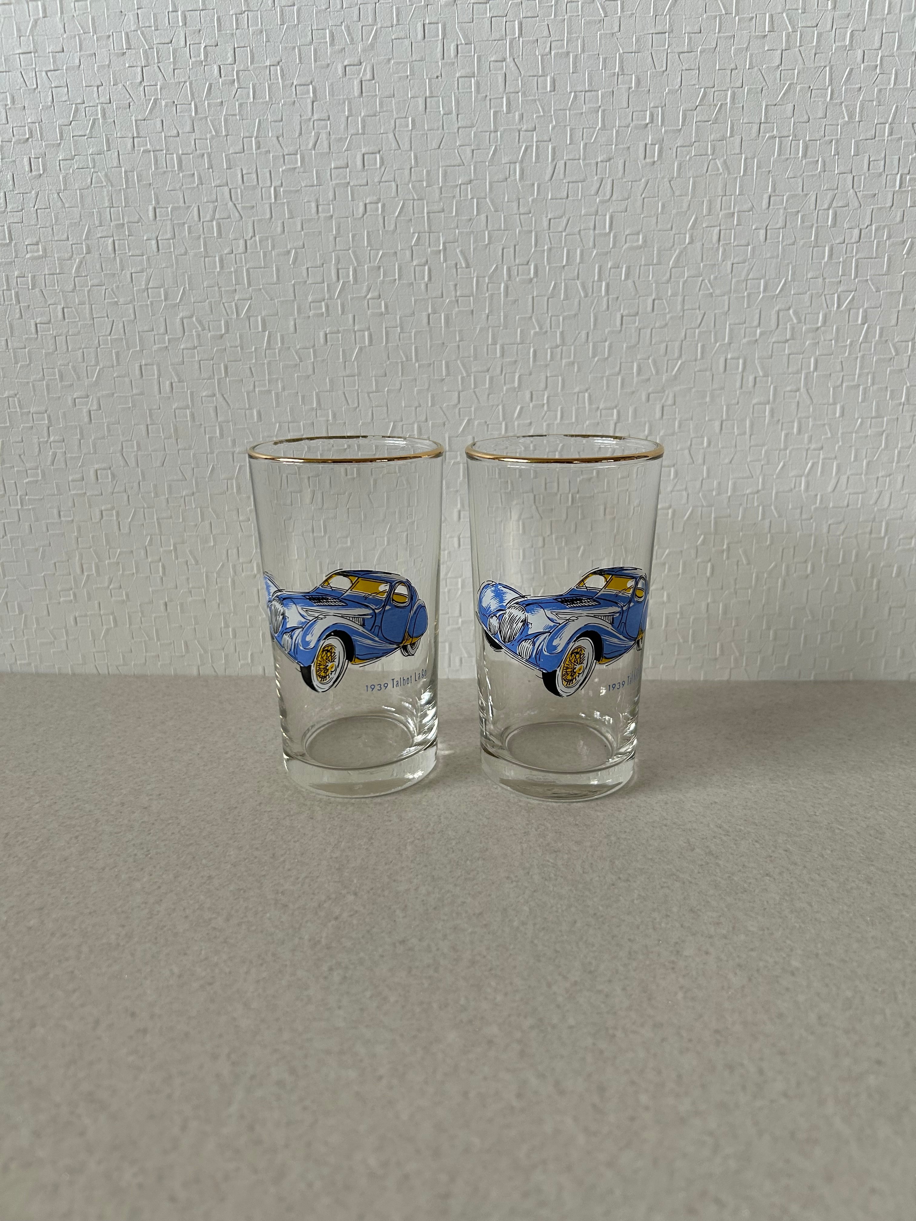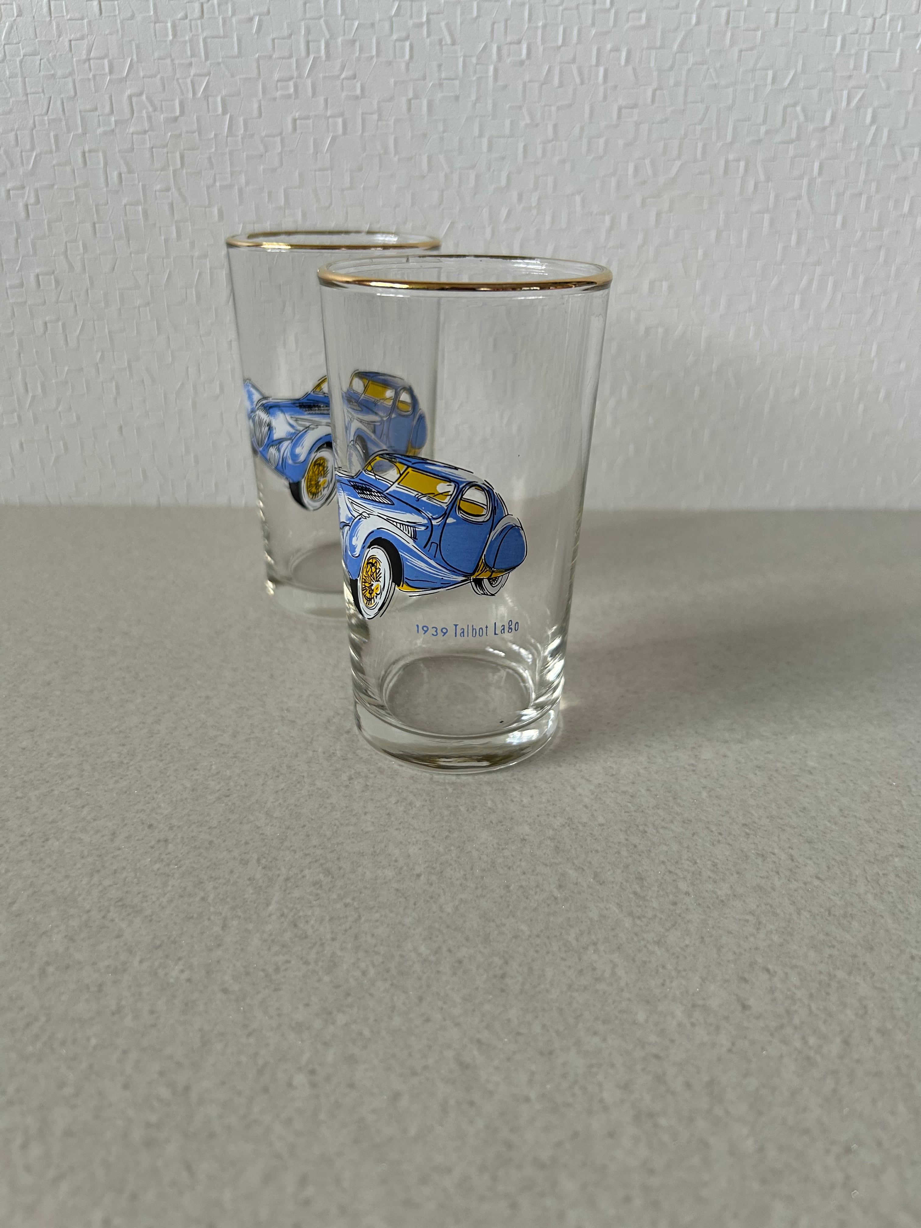 フランスの自動車メーカーであるタルボットラゴ社の自動車が描かれたペアグラス。縁はゴールドで塗装されています。