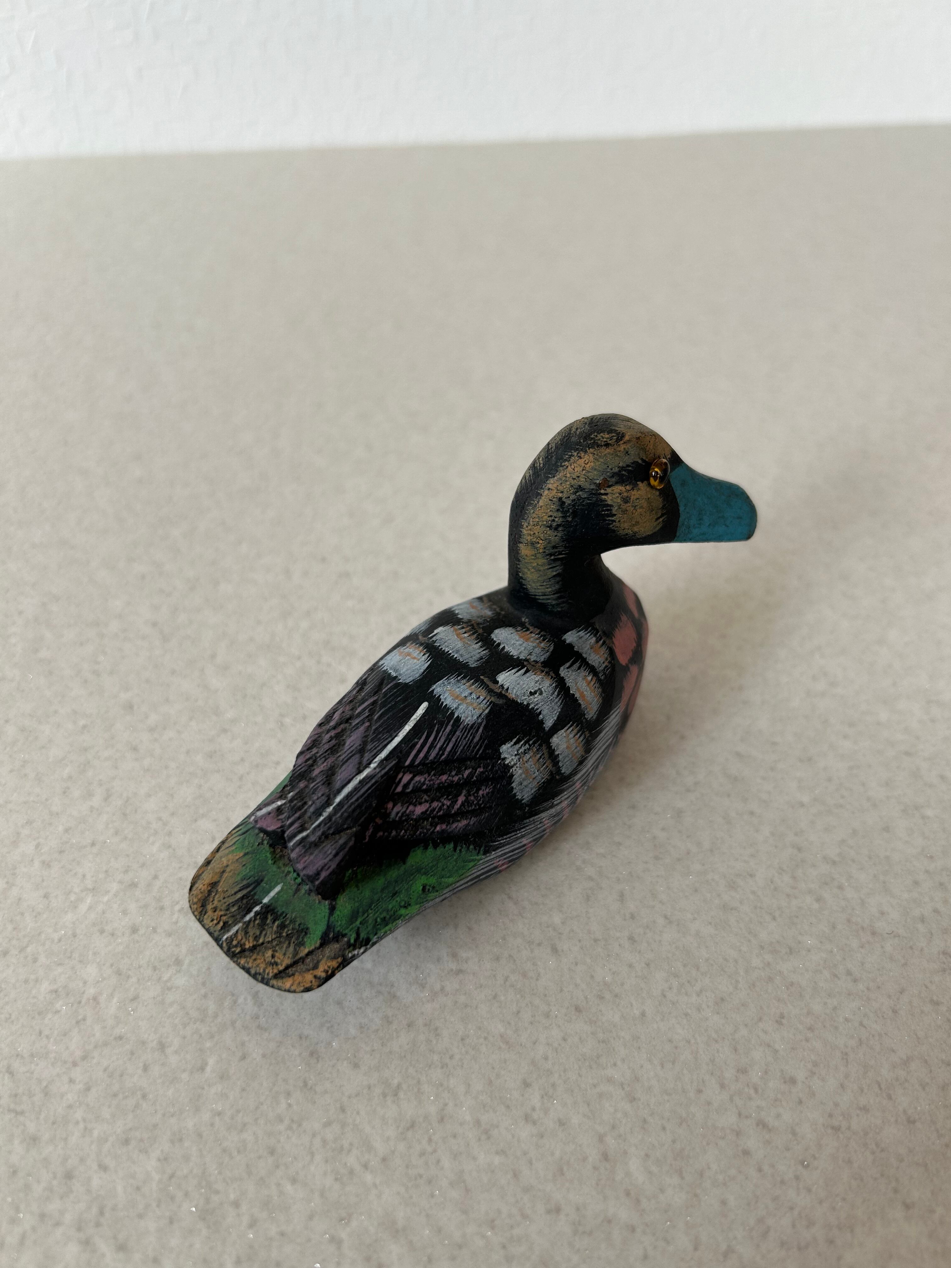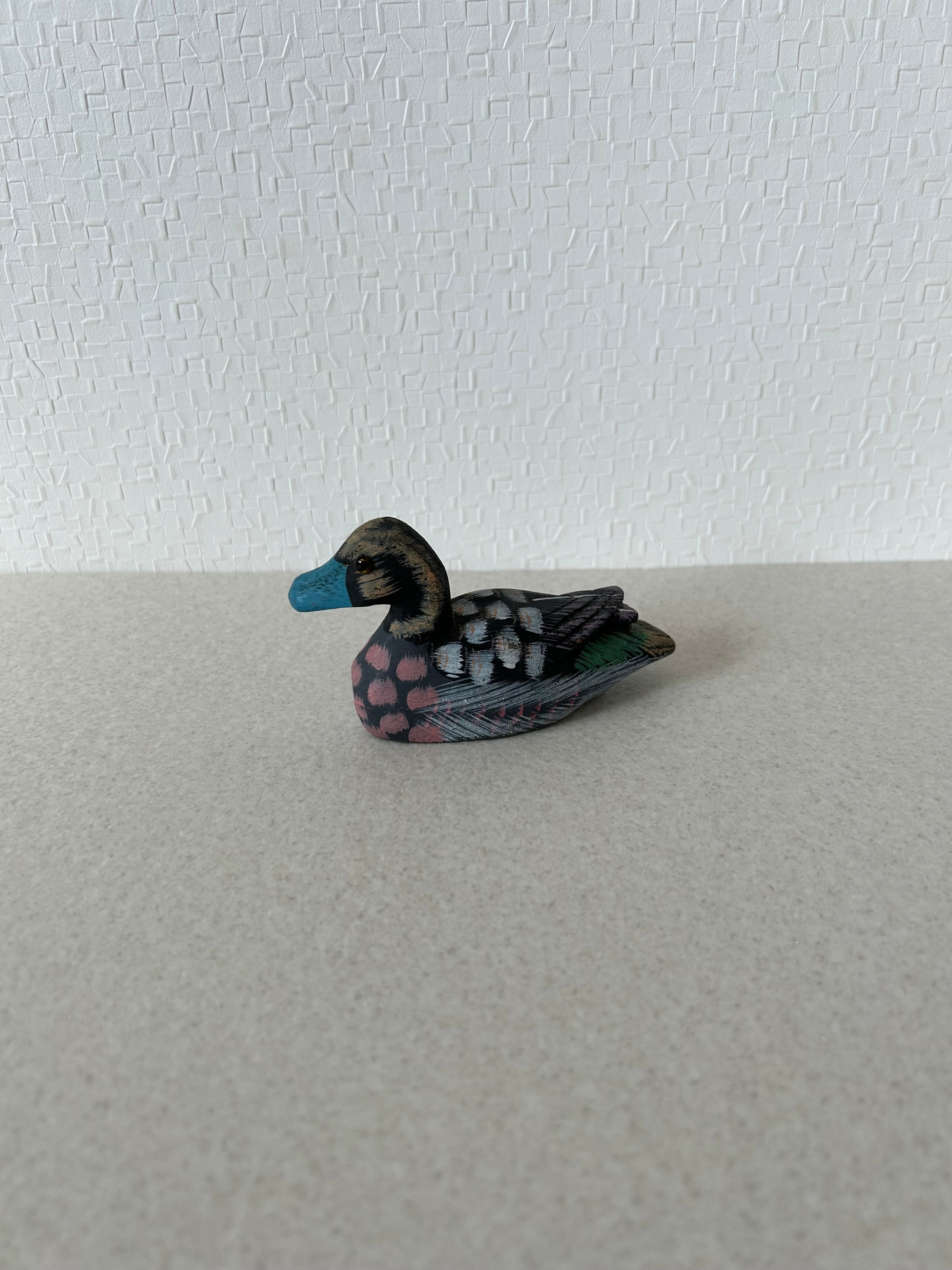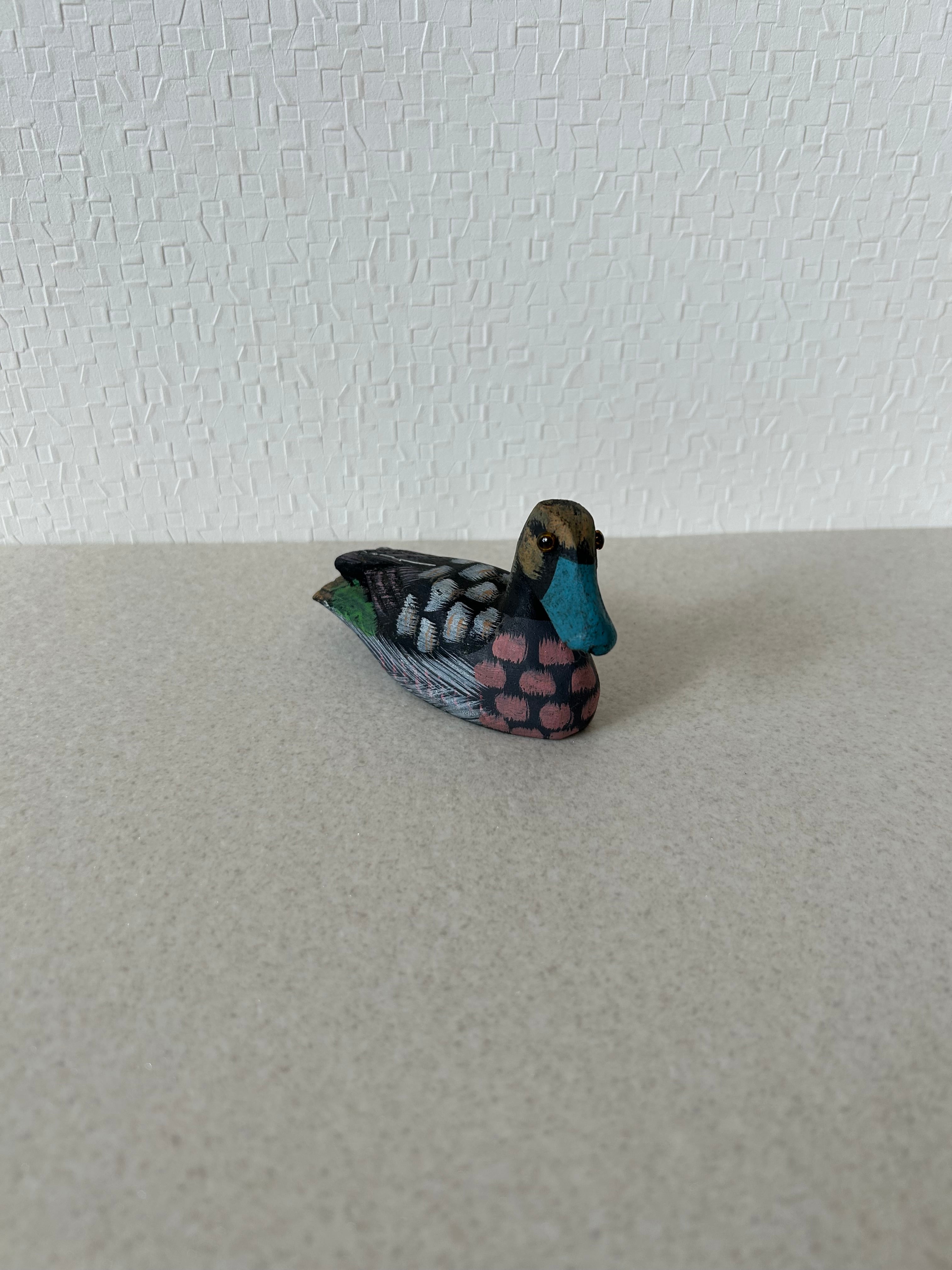 カラフルな色で塗装された木彫りの鴨になります。