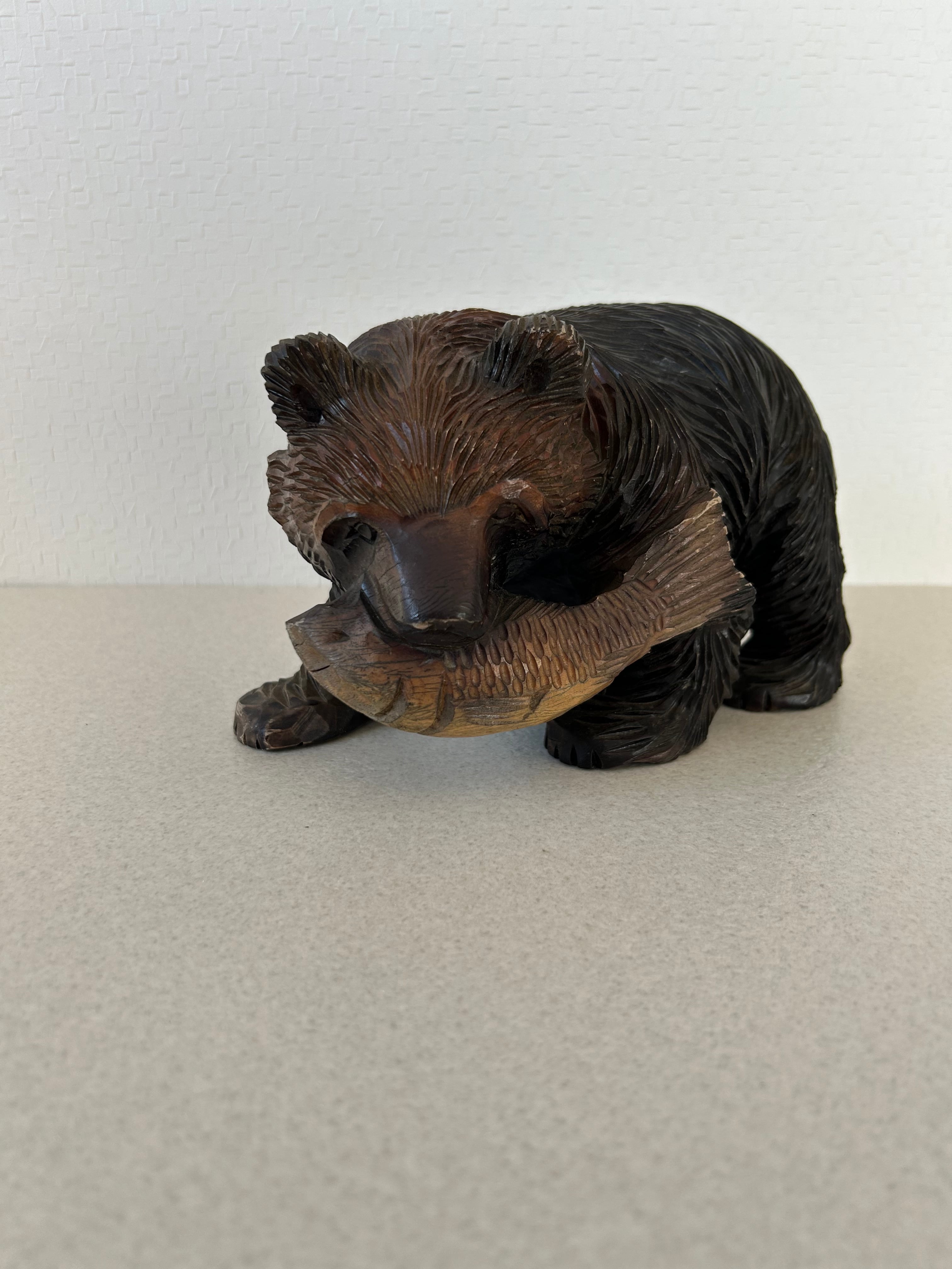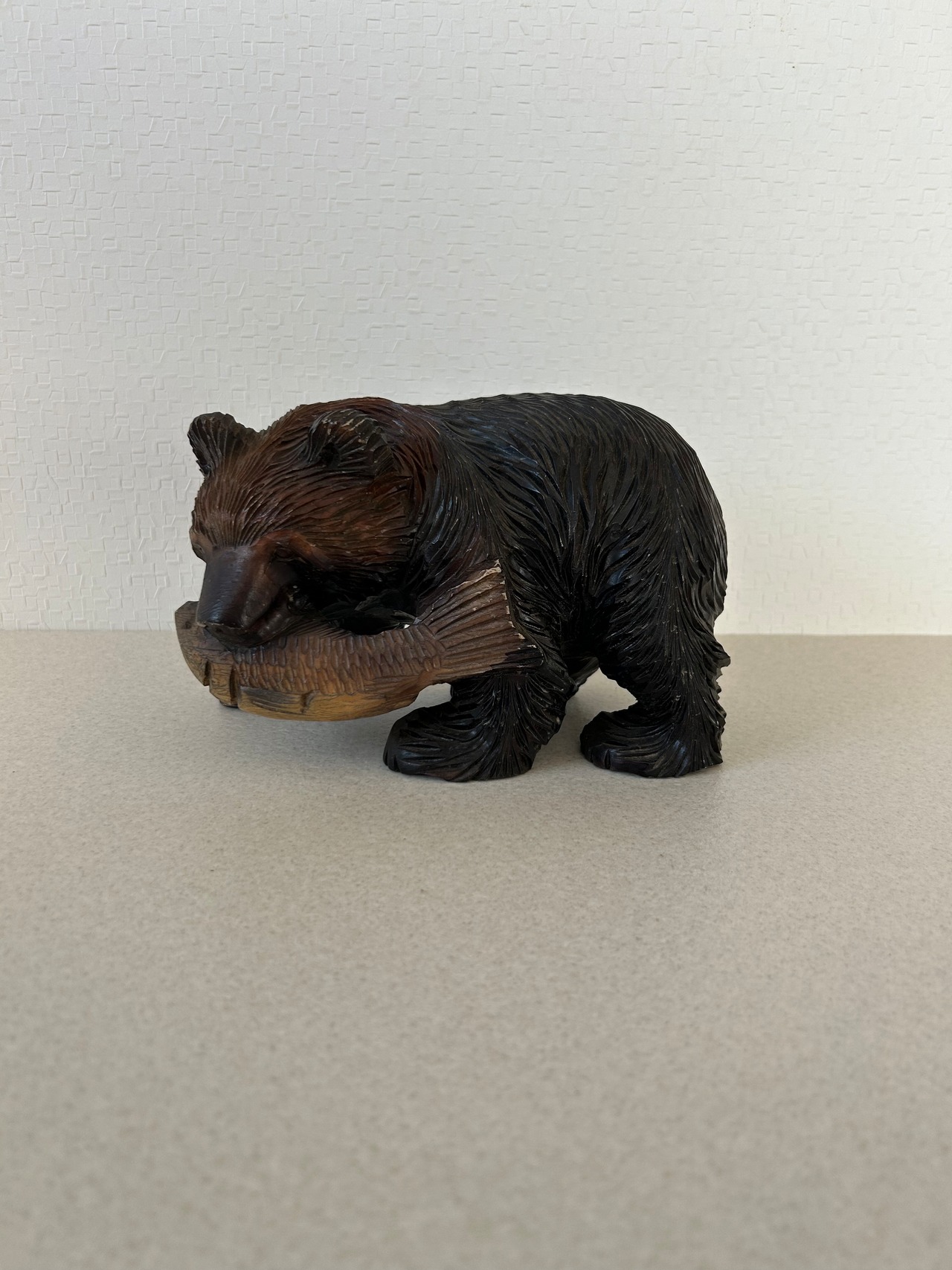 頭が茶色、体が黒色の木彫りの熊になります。鮭あり。