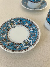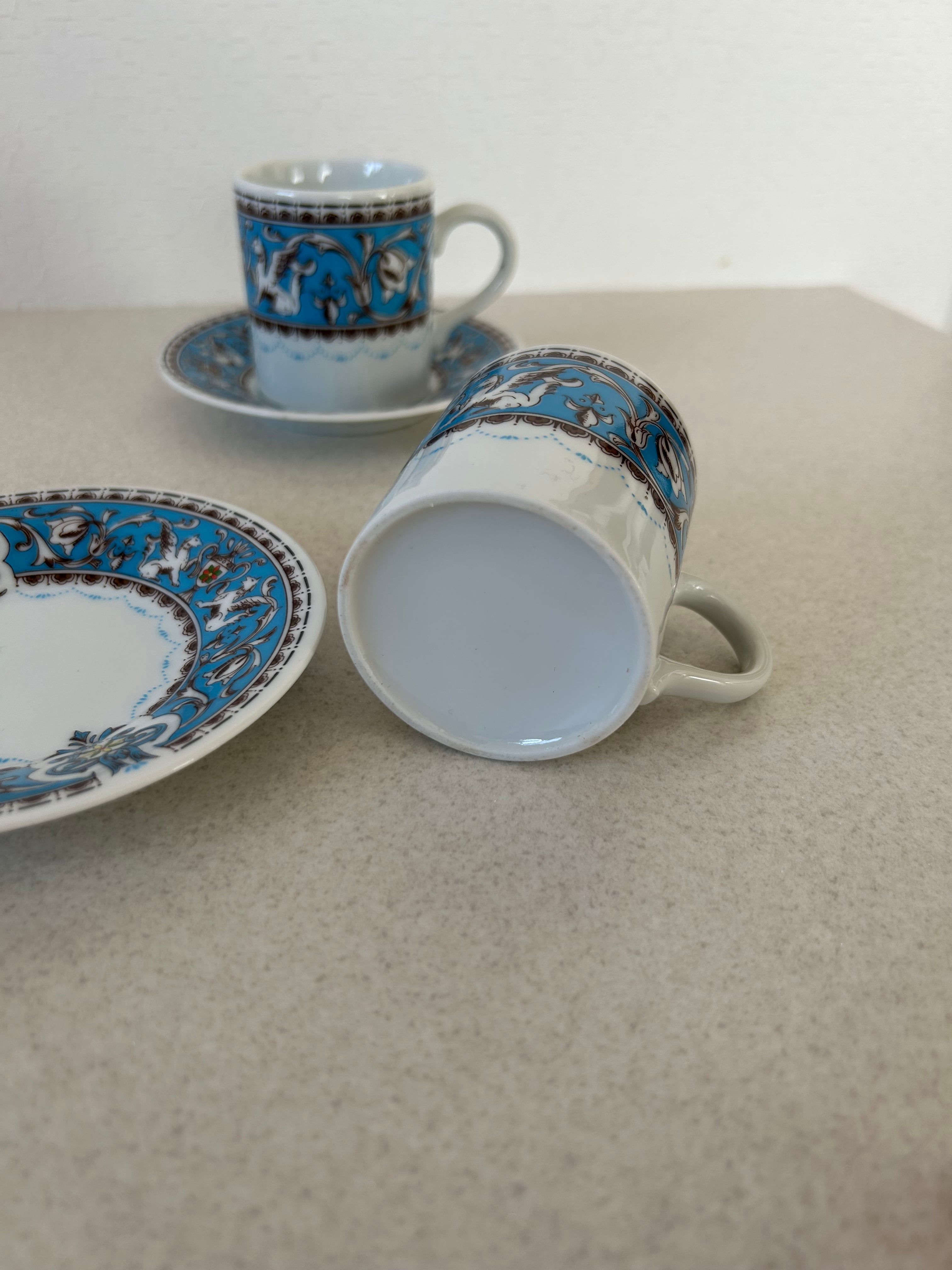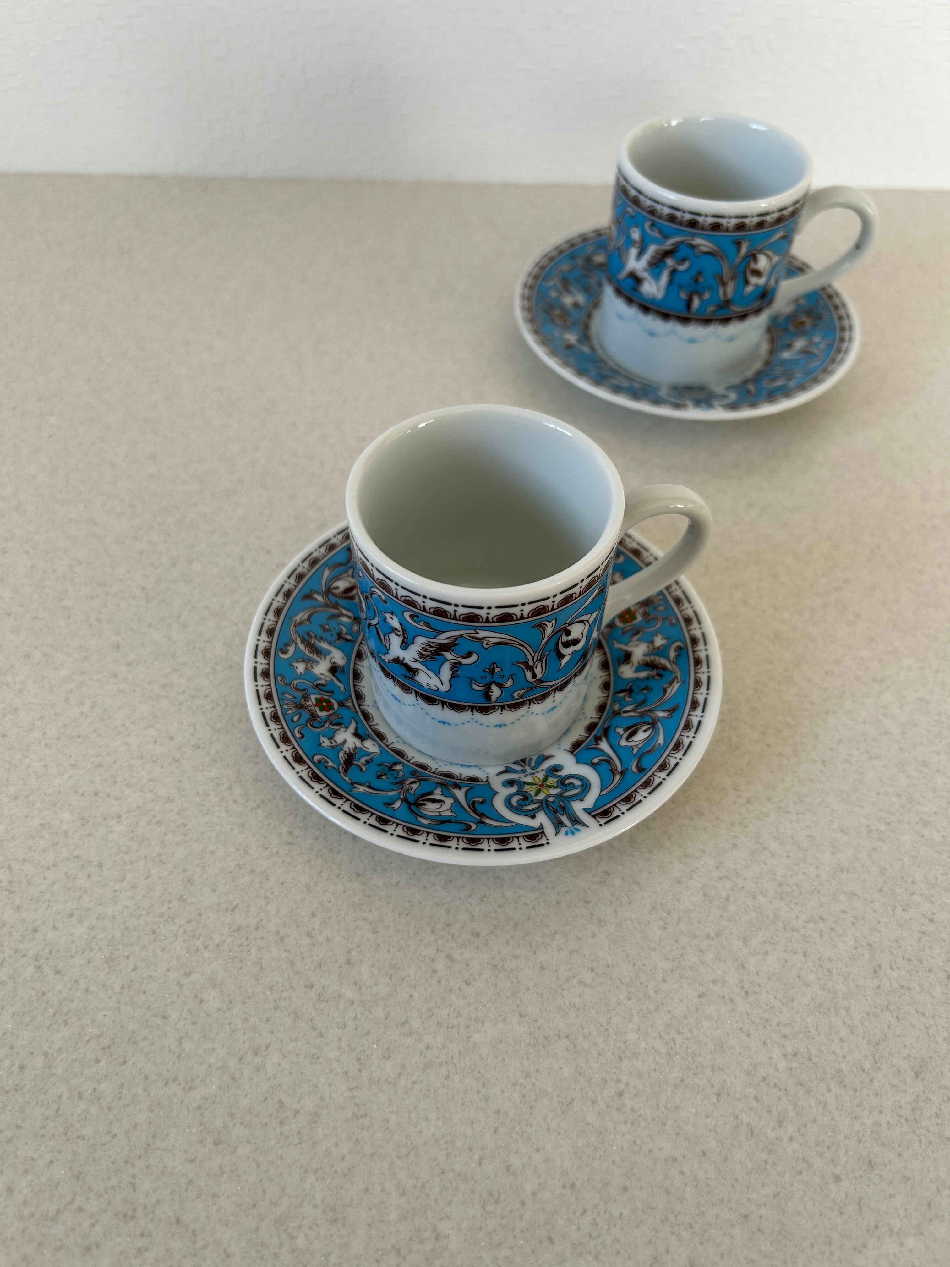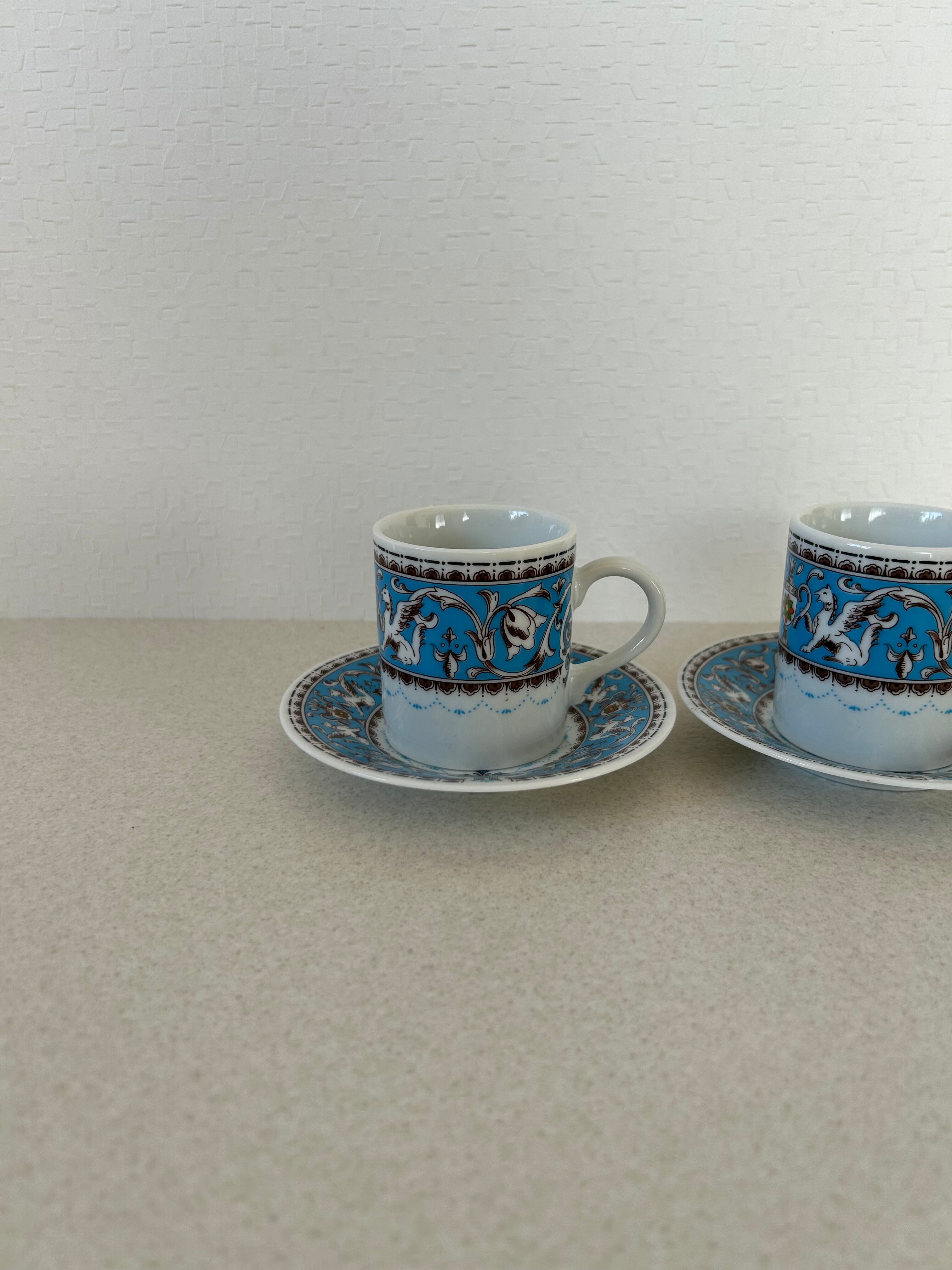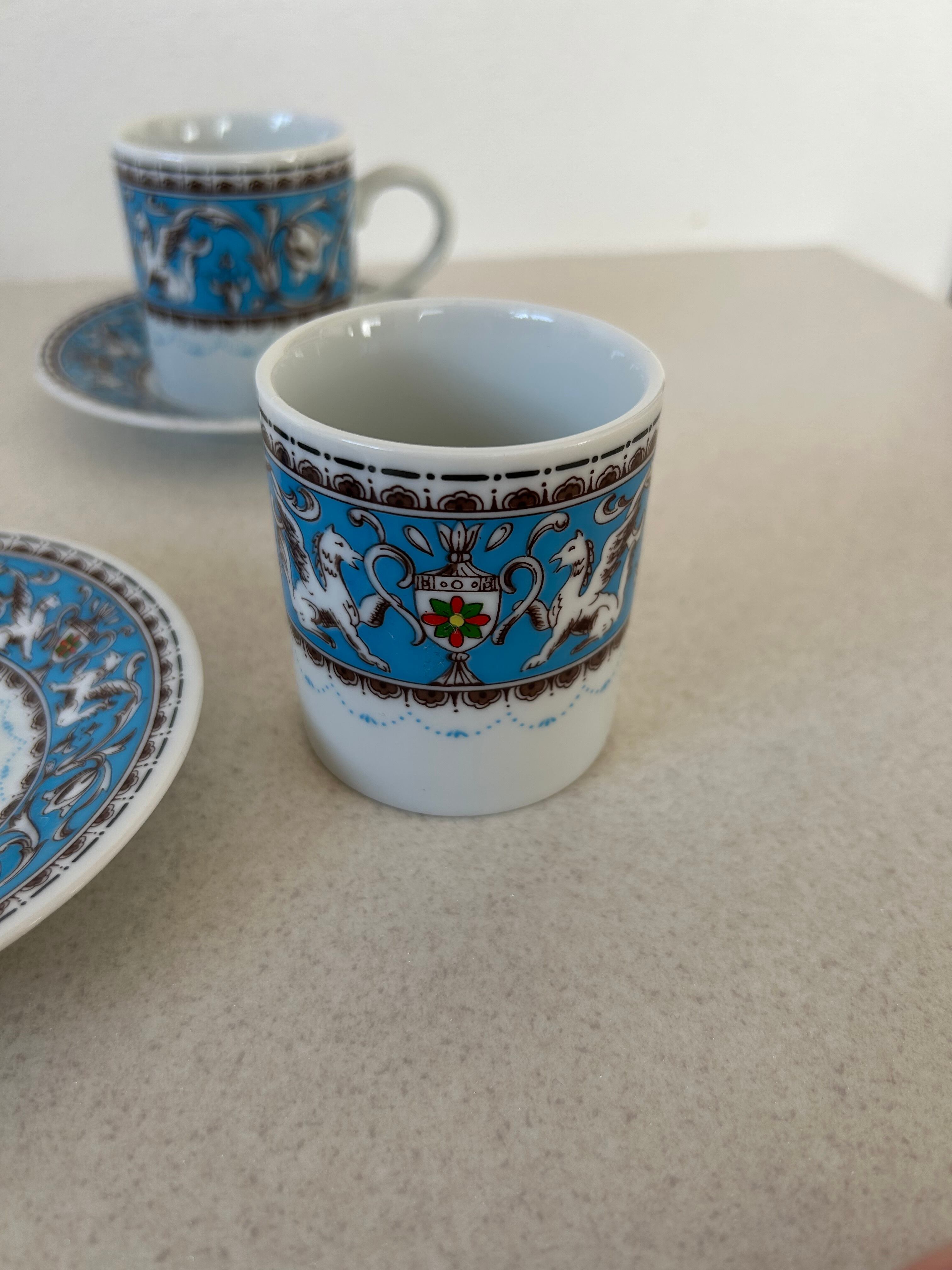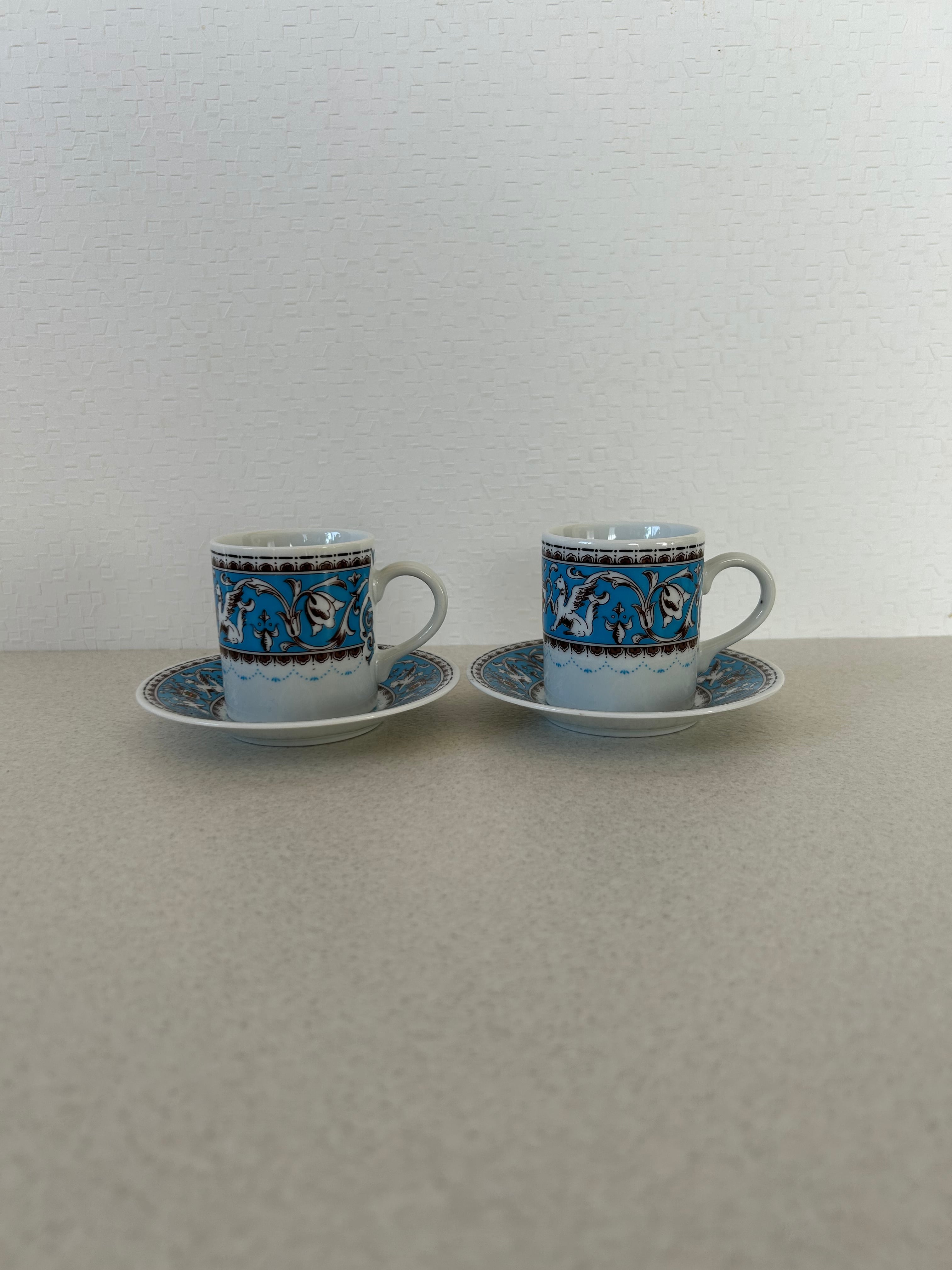 陶器製のペアのティーカップ。割と小さめのサイズですので、エスプレッソや紅茶を淹れる時にちょうどよいサイズ感でしょうか。羽の生えた馬やトロフィーの様な絵が描かれております。ディスプレイとしても◯。